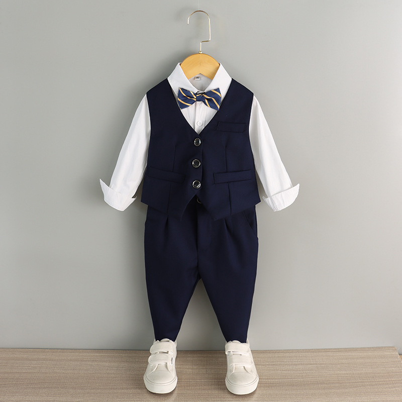 • 네이비 재킷 + 긴 소매 + 바지 + 조끼 + 파란색과 은색 나비 넥타이