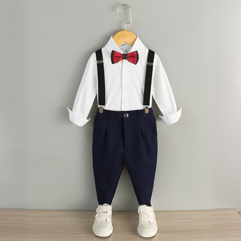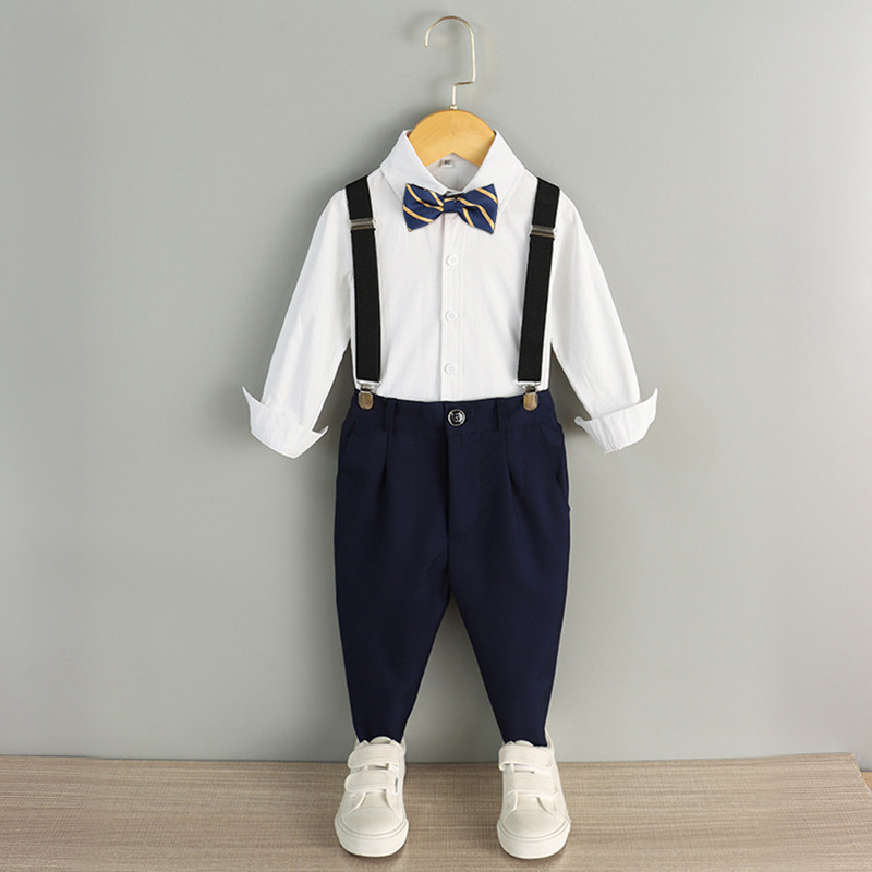 • 흰색 긴 소매, 남색 바지, 멜빵, 이중 나비 넥타이