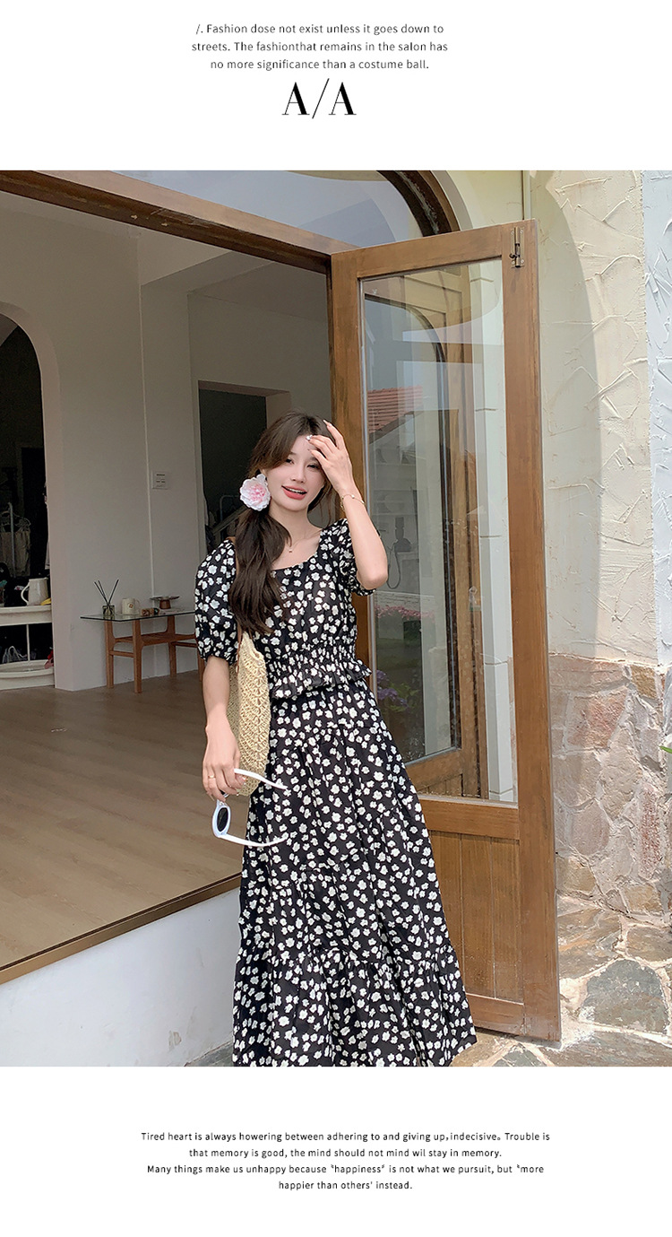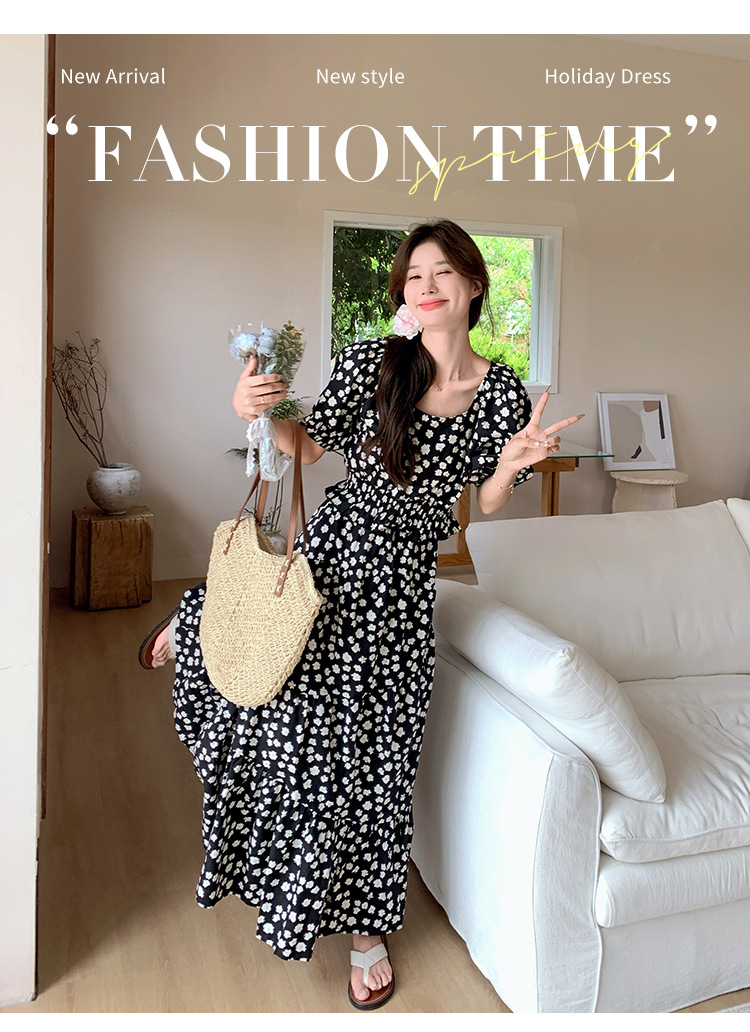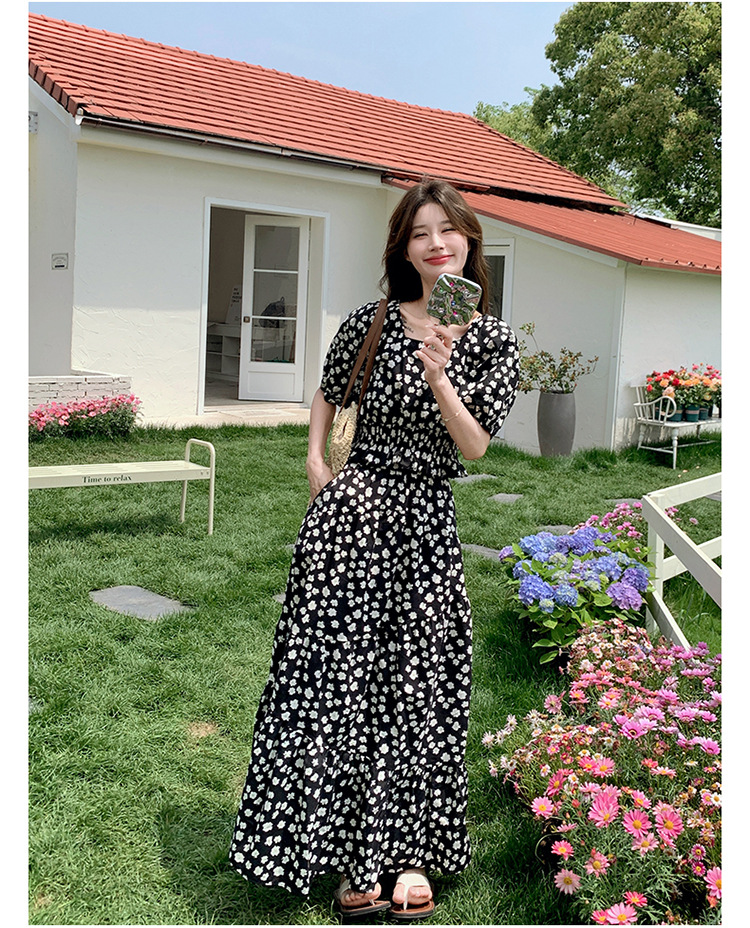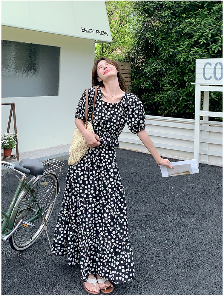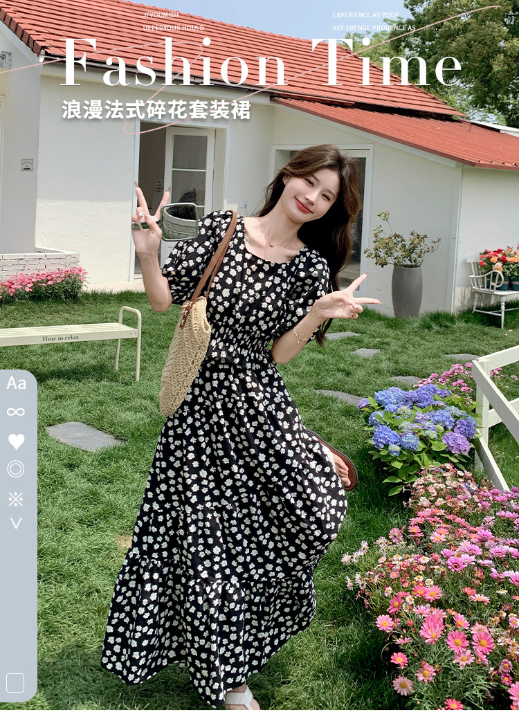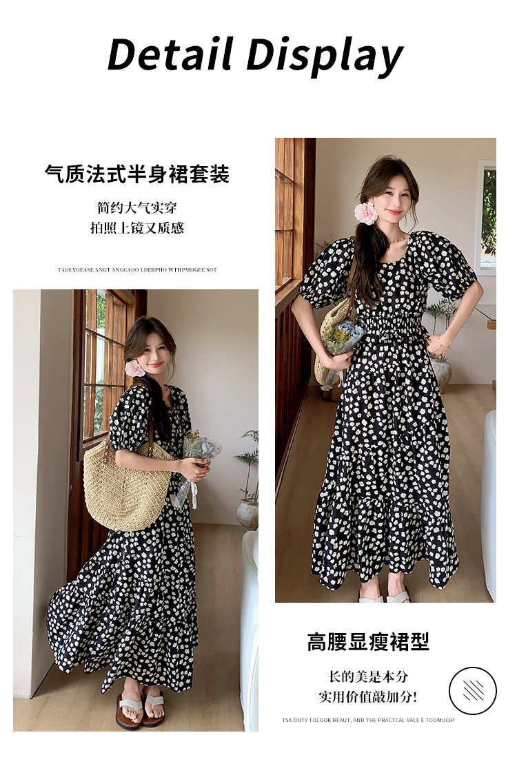 리얼 샷 한국 스타일 라이트 성숙한 프랑스 스타일 플로랄 롱 원피스 새로운 패션 타이트 허리 슬리밍 원피스 세트 여성 2025 여름스토어 가기