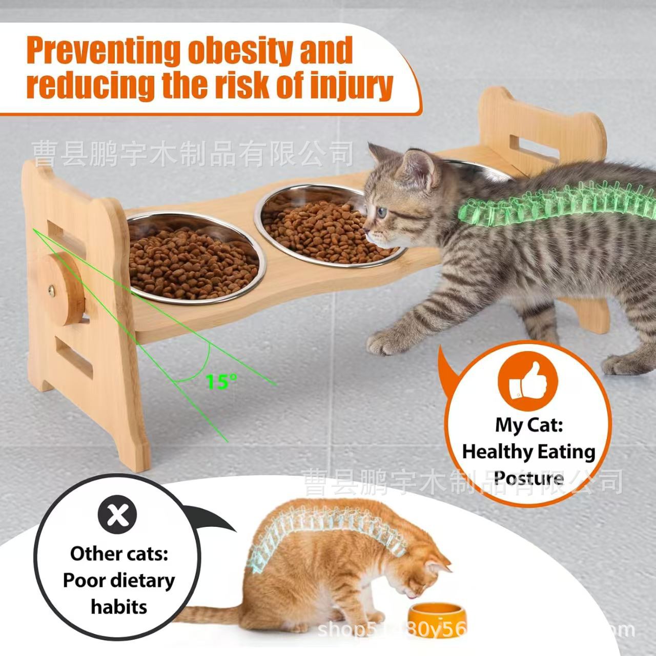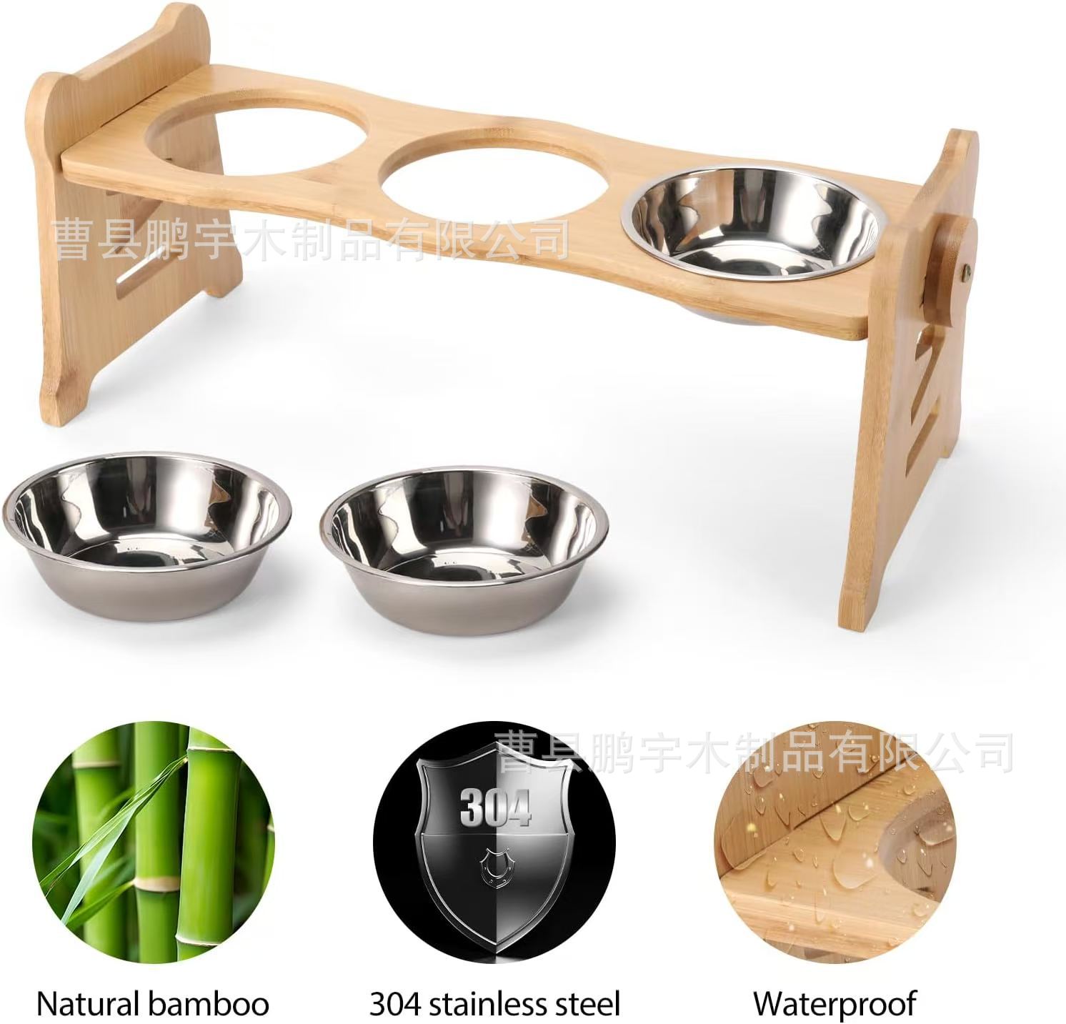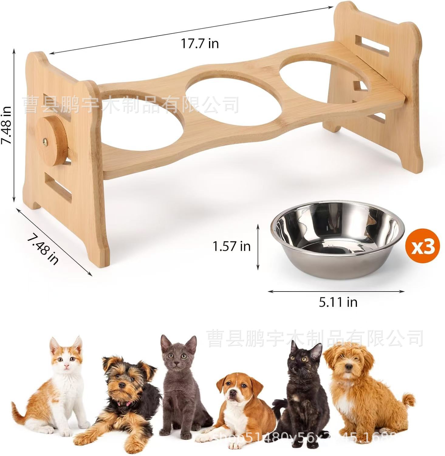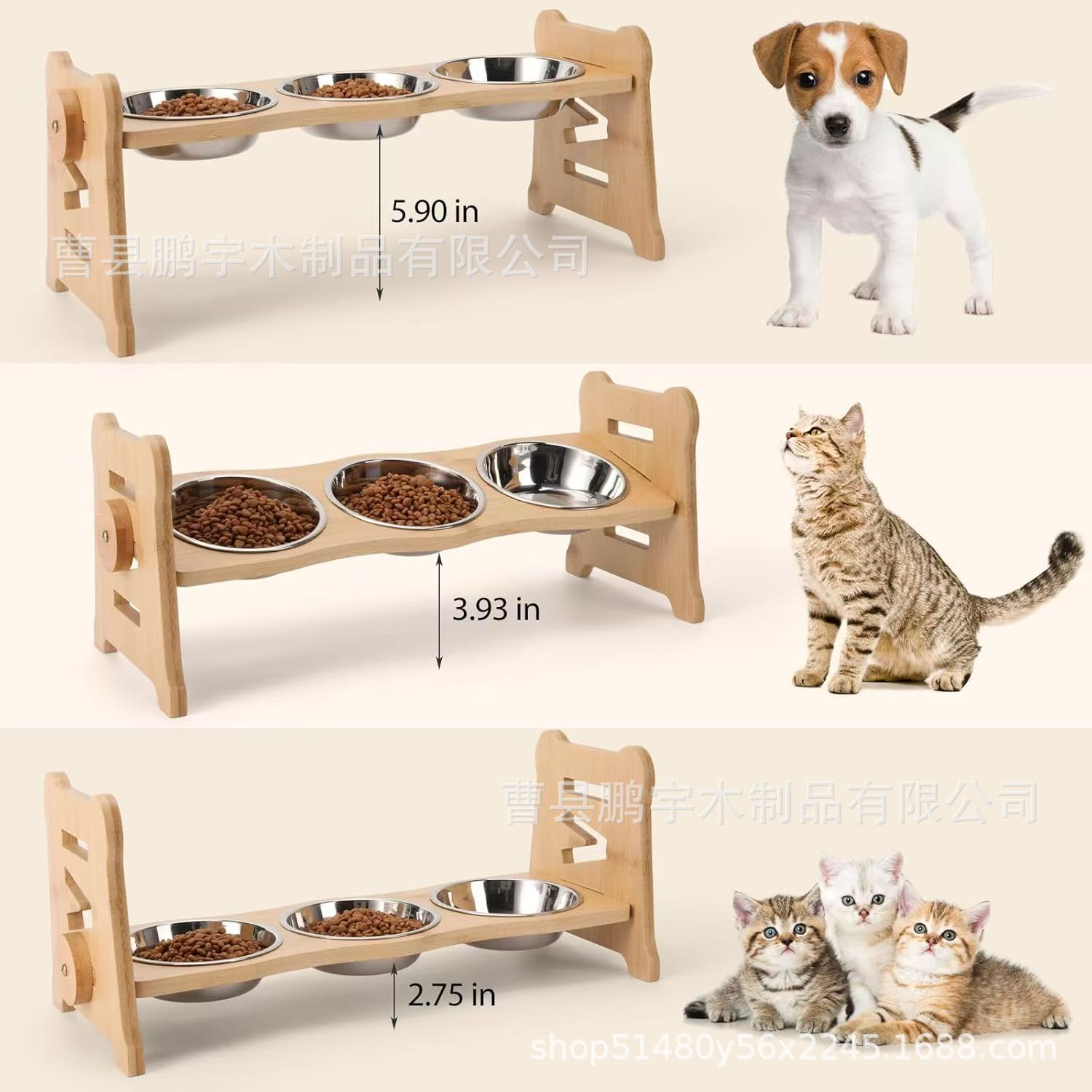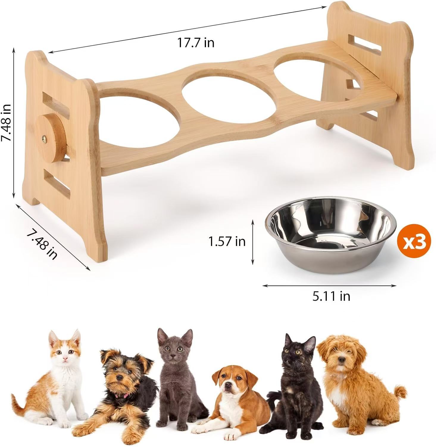 나무로 된 높이 조절 가능한 애완 동물 먹이 랙 대나무 고양이 3 그릇 먹이 그릇 작은 개 식탁 고양이 먹이통스토어 가기