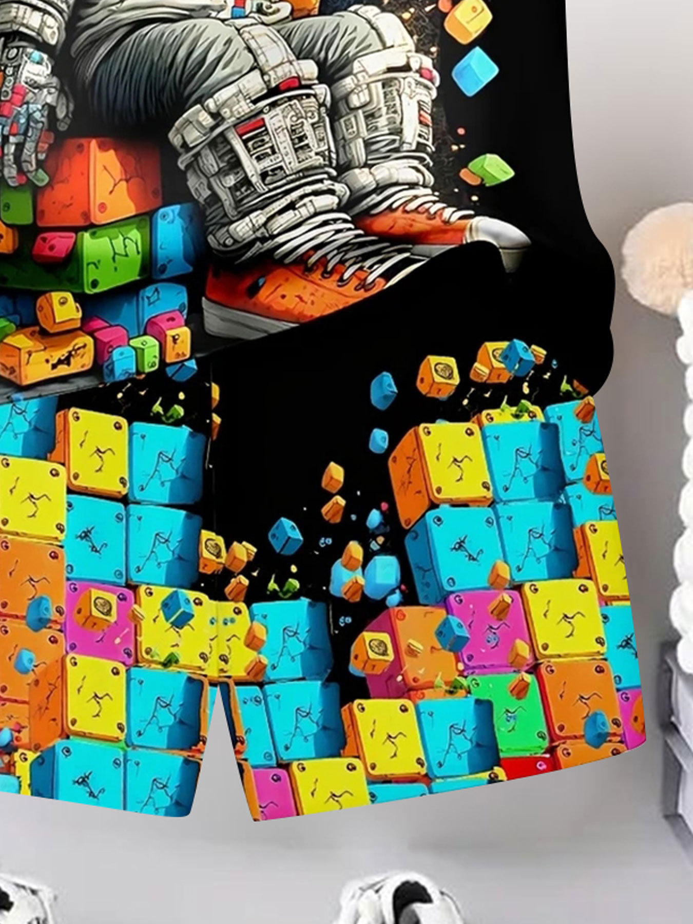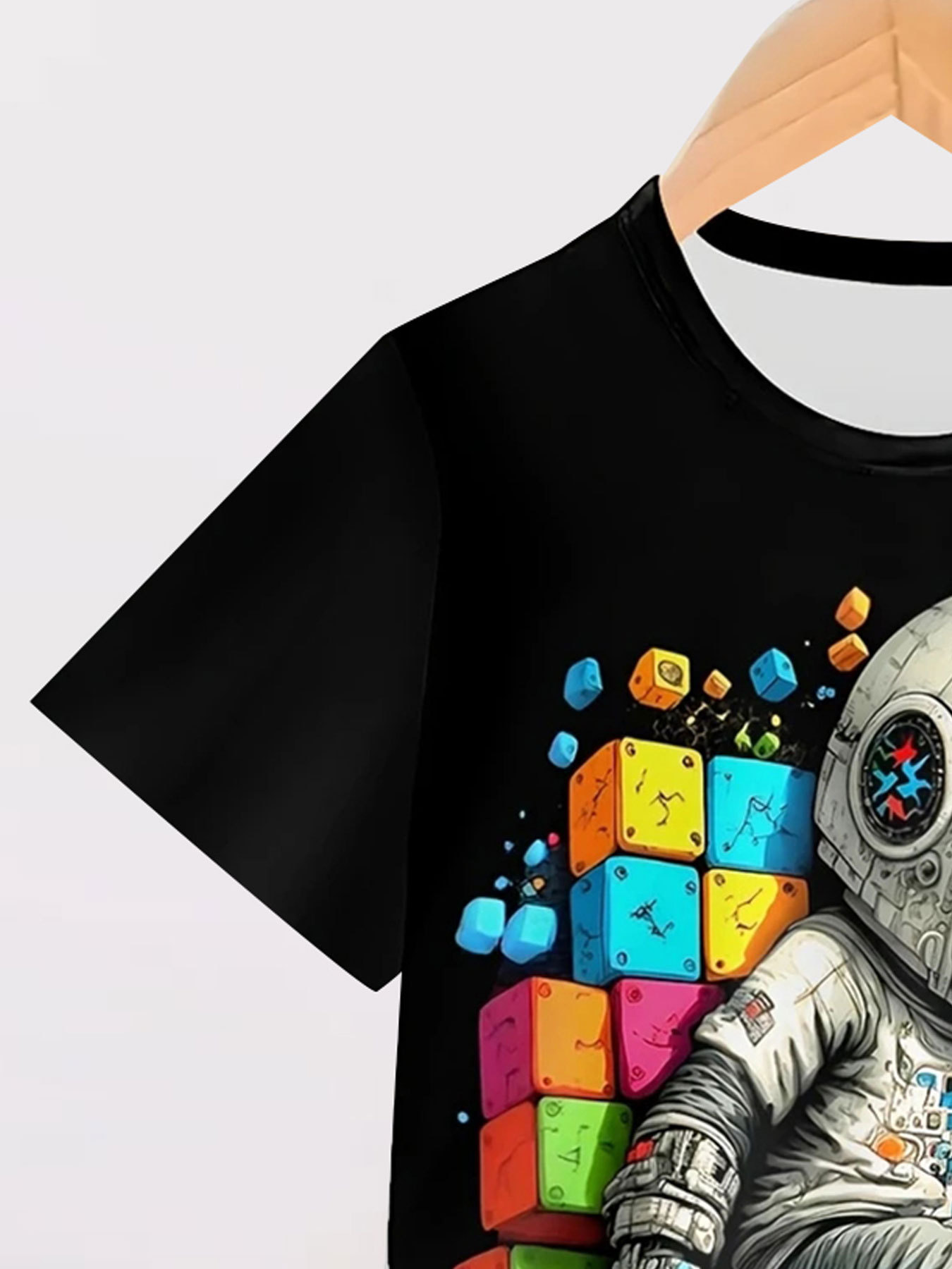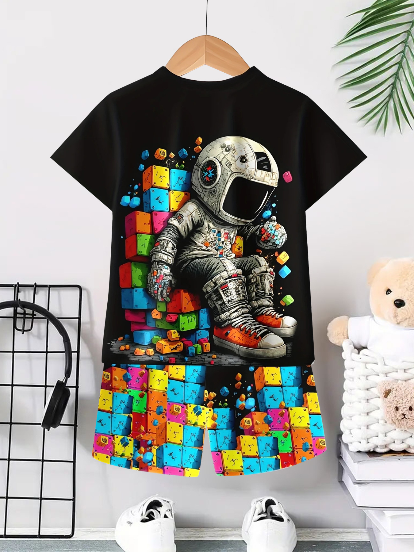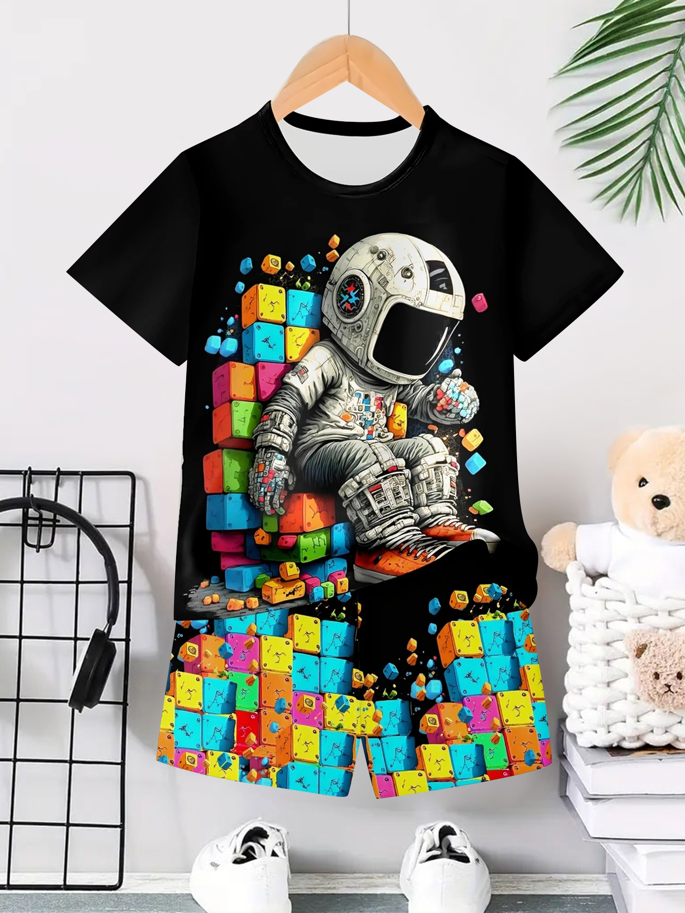 크로스보더 남아용 투피스 캐주얼 세트, 디지털 프린트 스페이스맨 반팔과 반바지, 데일리 및 가정용에 적합스토어 가기
