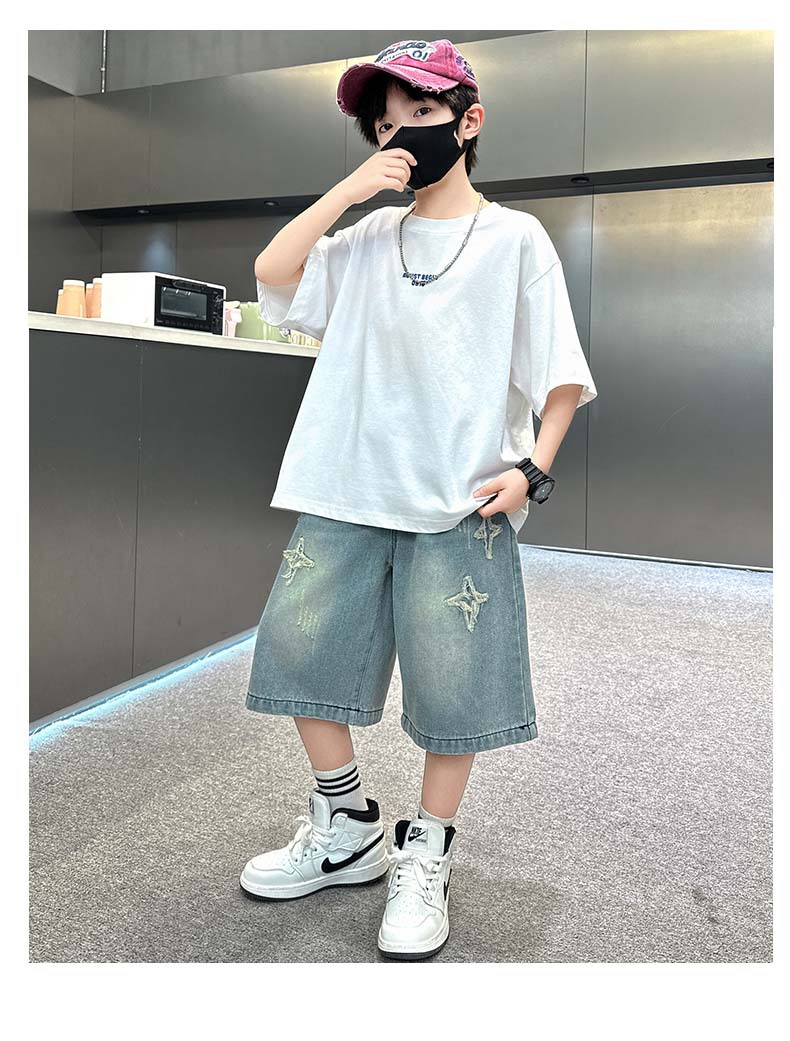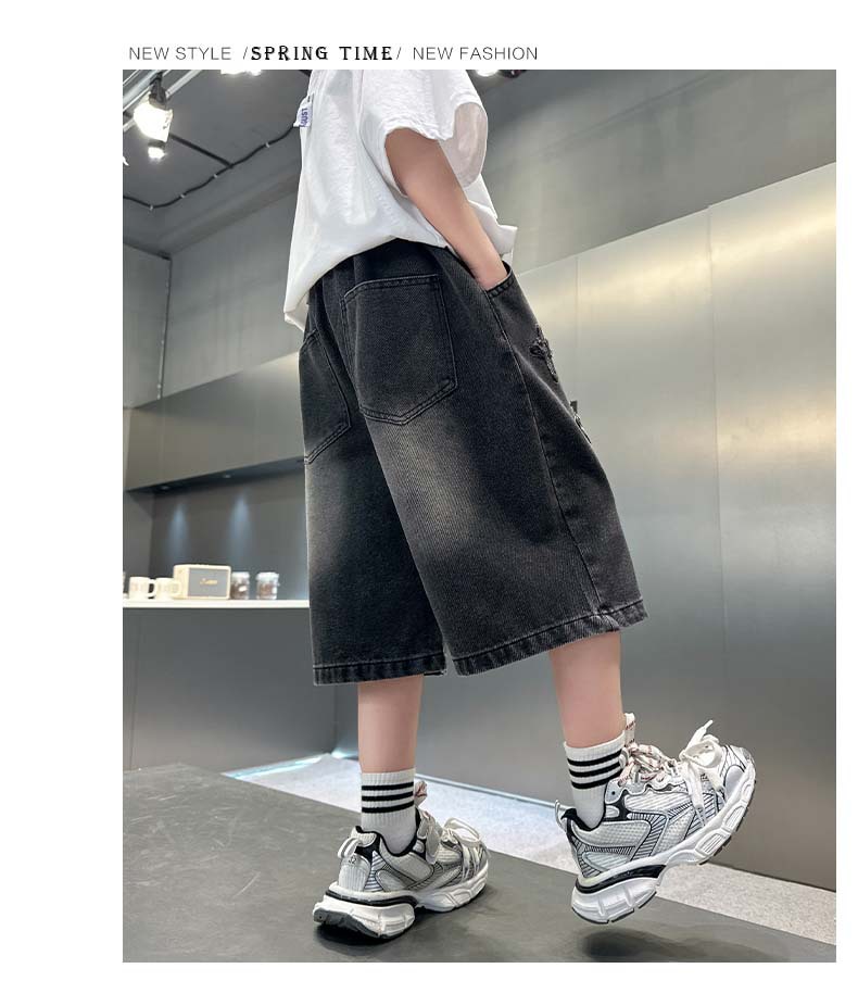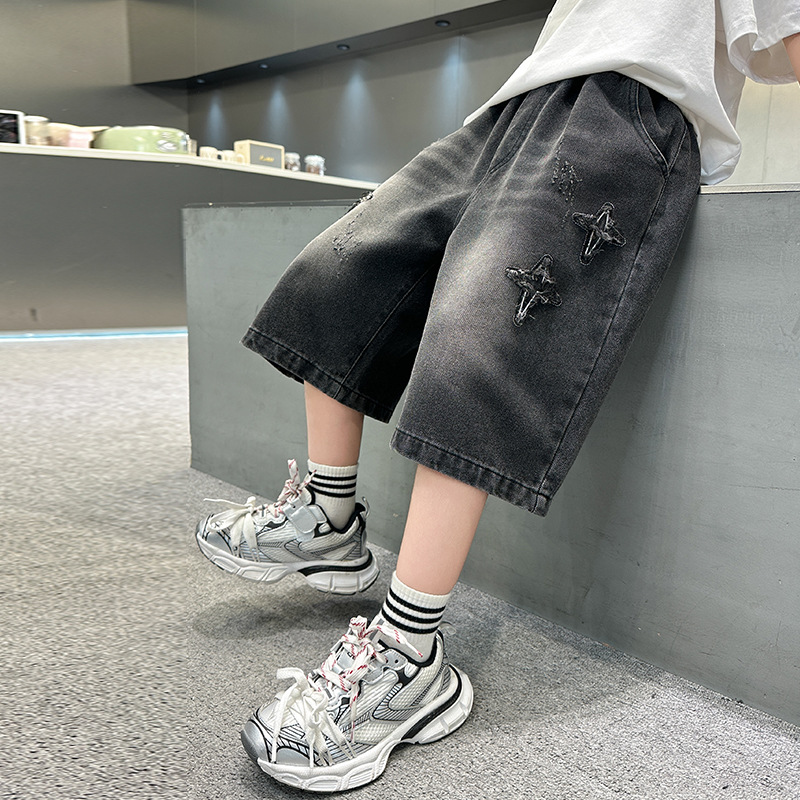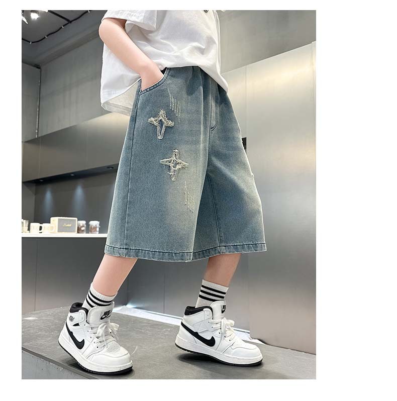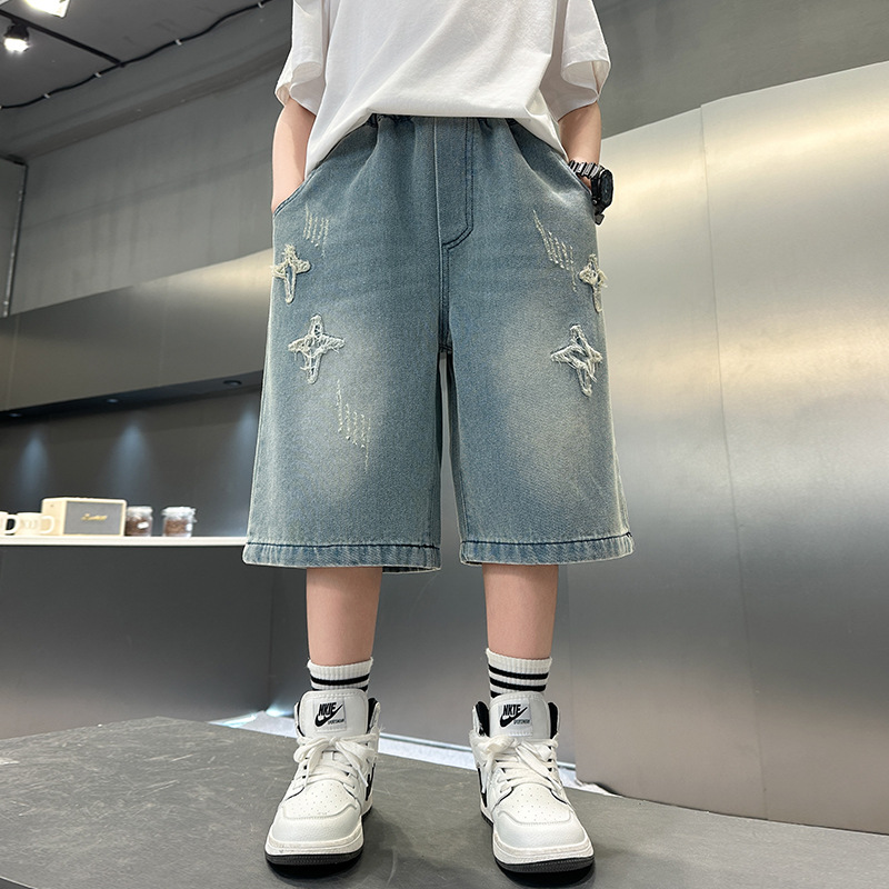 남자 큰 어린이 여름 찢어진 느슨한 데님 반바지 2025 새로운 아동복 소년 멋진 감각 얇은 표절 잘생긴 바지스토어 가기