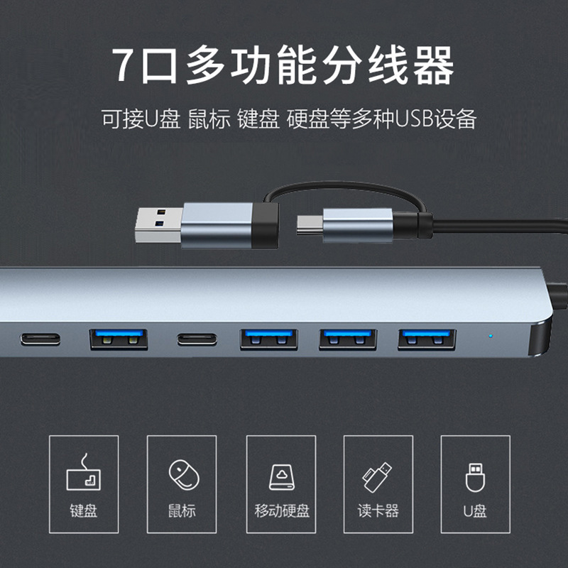 국경 간 다기능 SD/TF 카드 읽기 7-in-1 확장 허브 더블 헤드 유형-c 및 USB 확장 도크