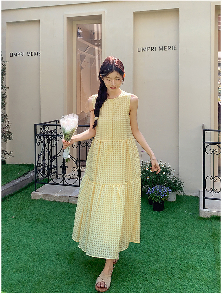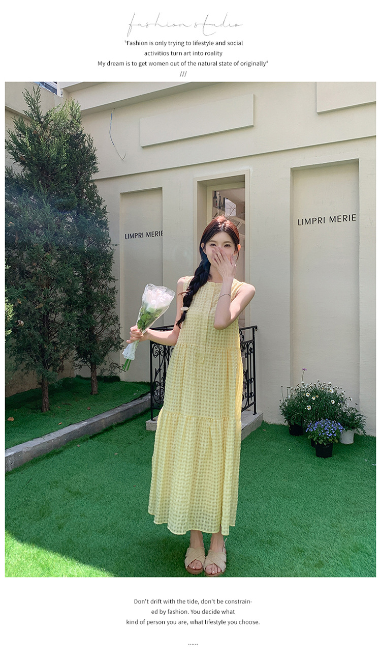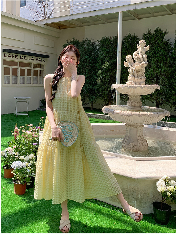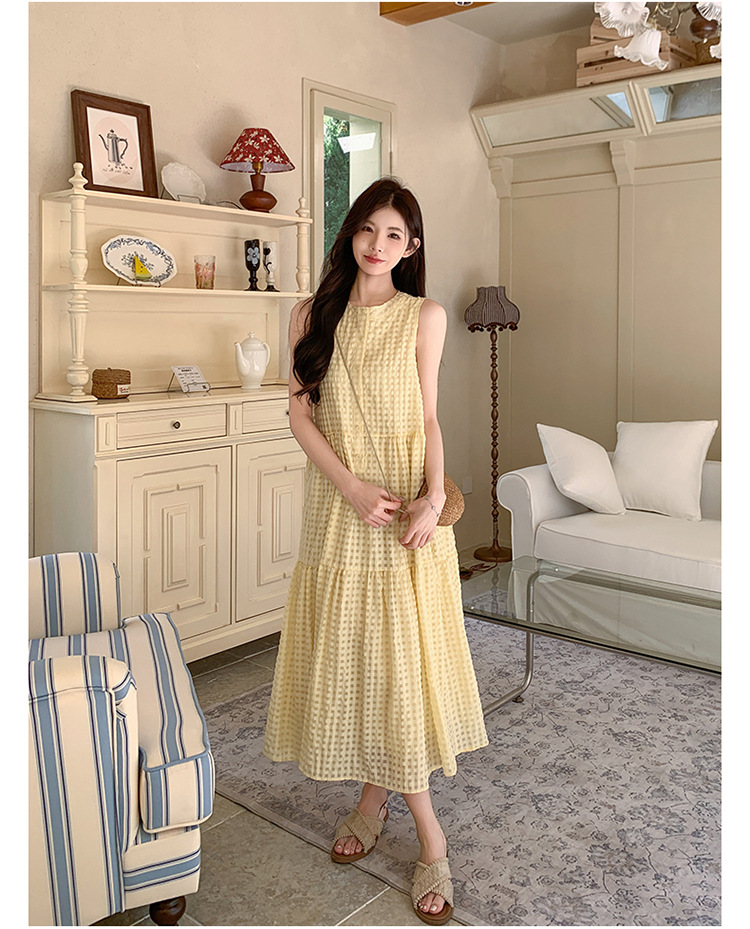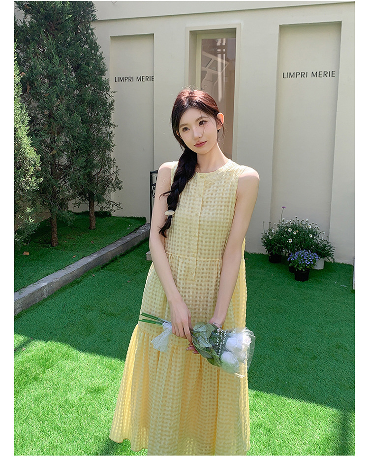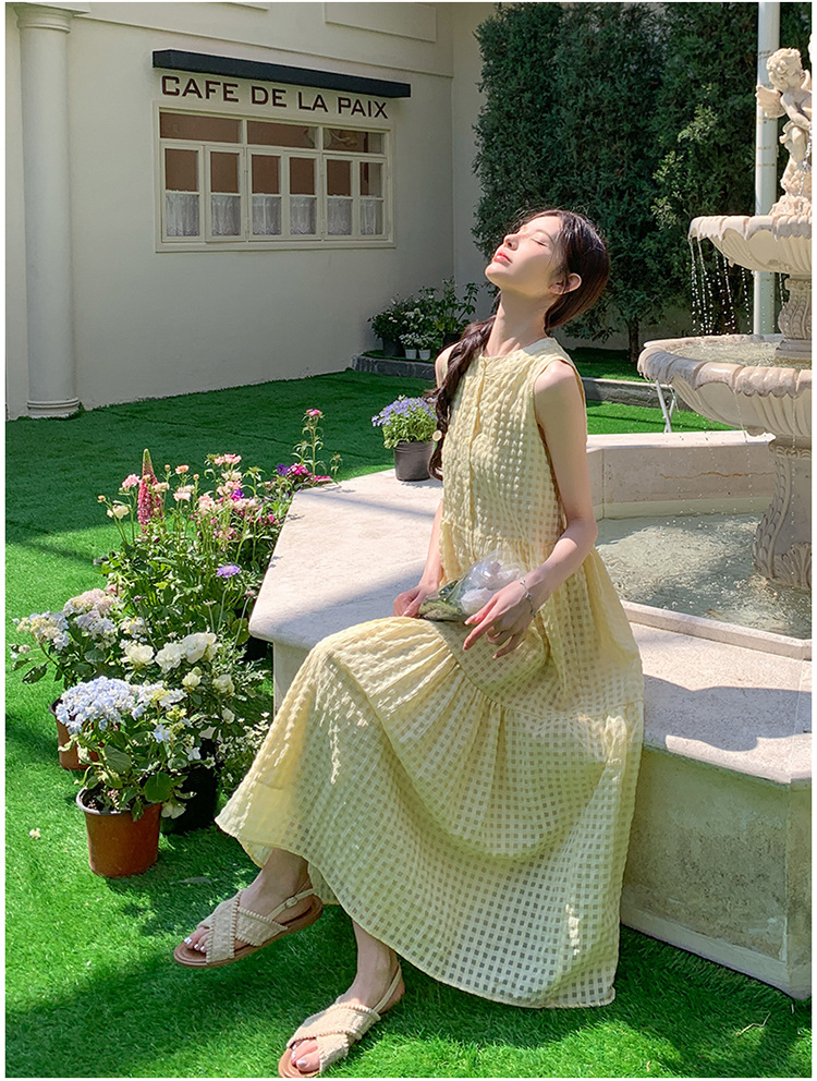 진짜 샷 달콤한 나이 감소 첫사랑 소녀 민소매 긴 치마 2025 여름 새로운 달콤한 격자 무늬 원피스 여성스토어 가기