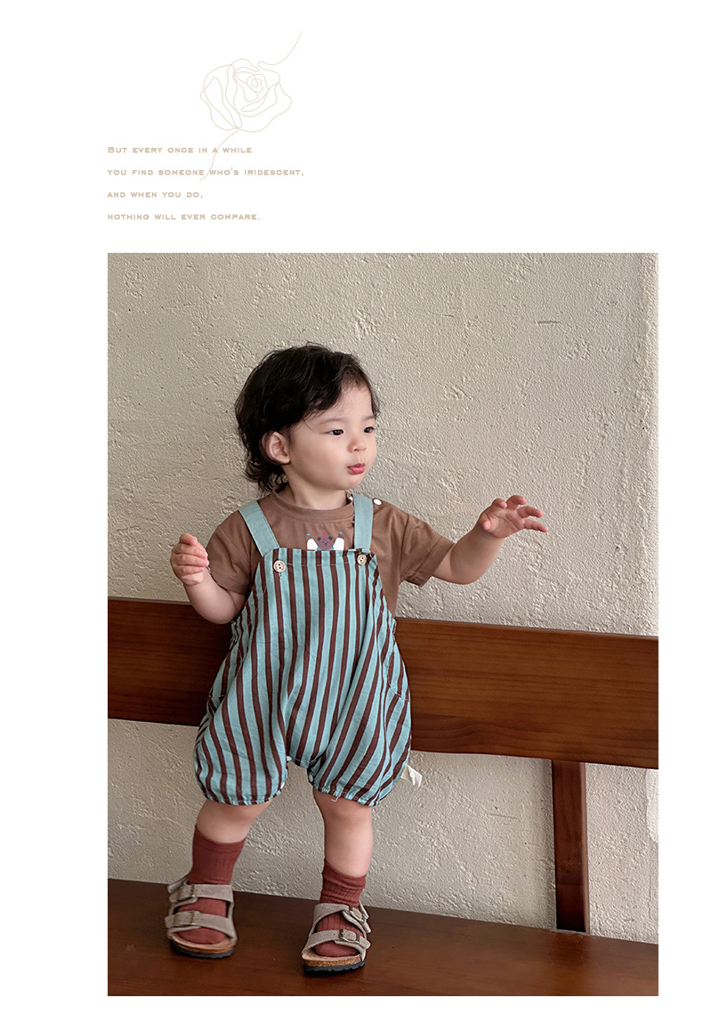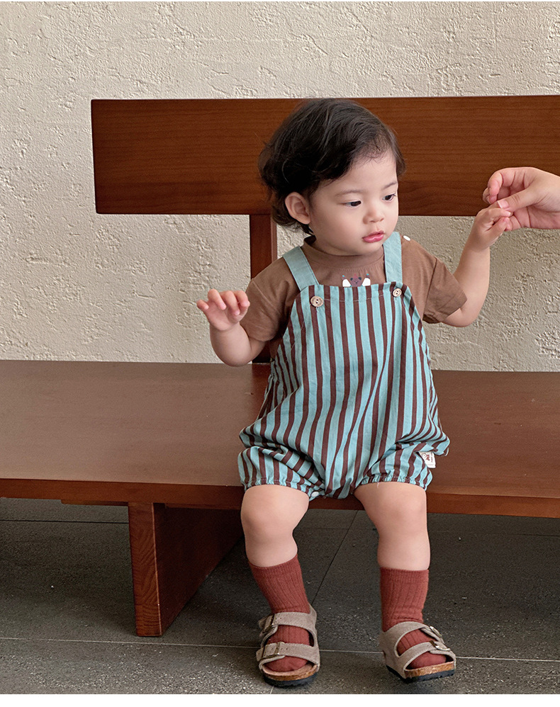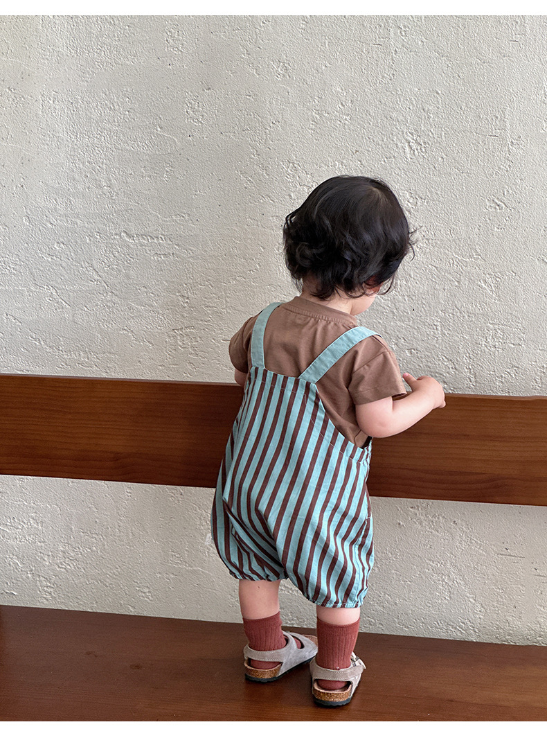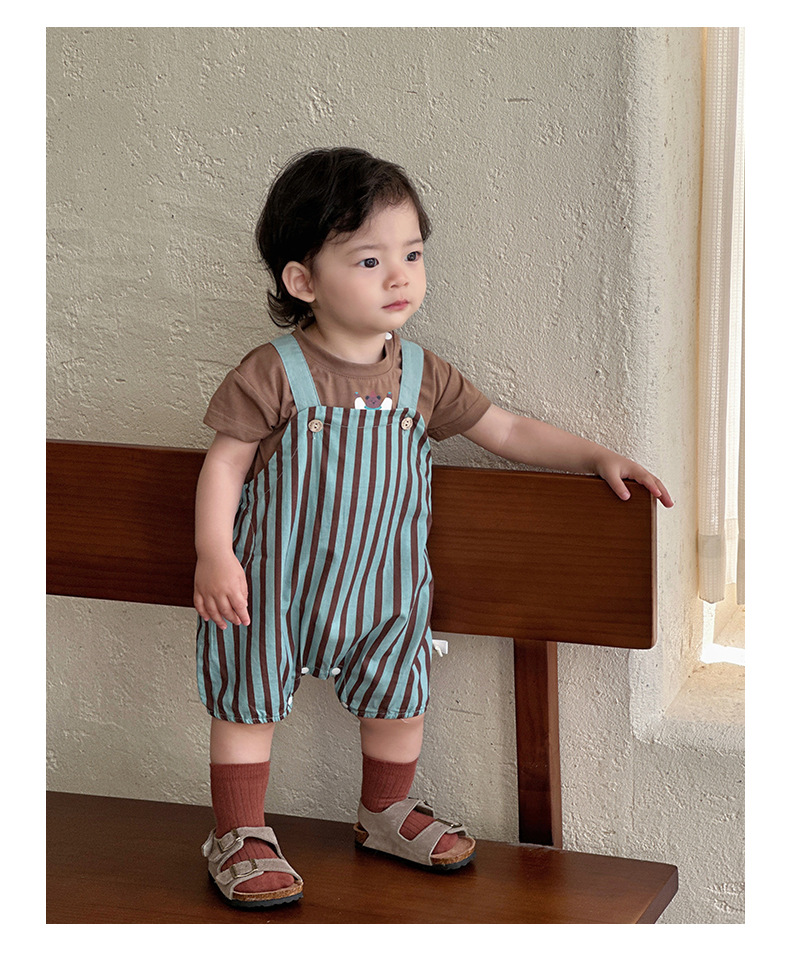 Young Wo 2025 여름 새로운 도착 줄무늬 줄무늬 세트 남자 아기 의상 단색 반팔 2 피스 세트스토어 가기