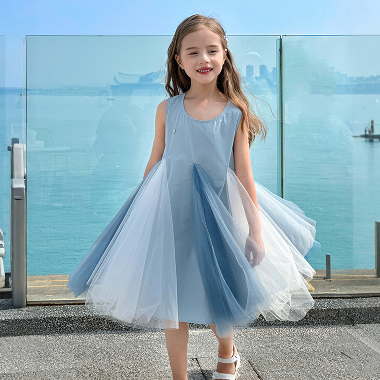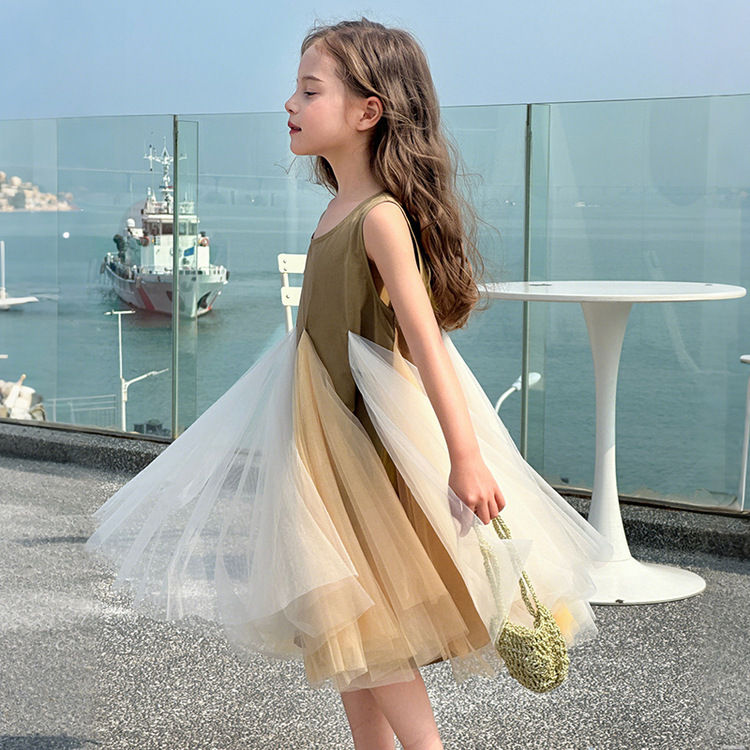 투투 리틀 엘리펀트 여아 원피스 2025 여름 활기차고 우아한 얇은 망사 드레스 투톤 망사 공주 민소매 원피스