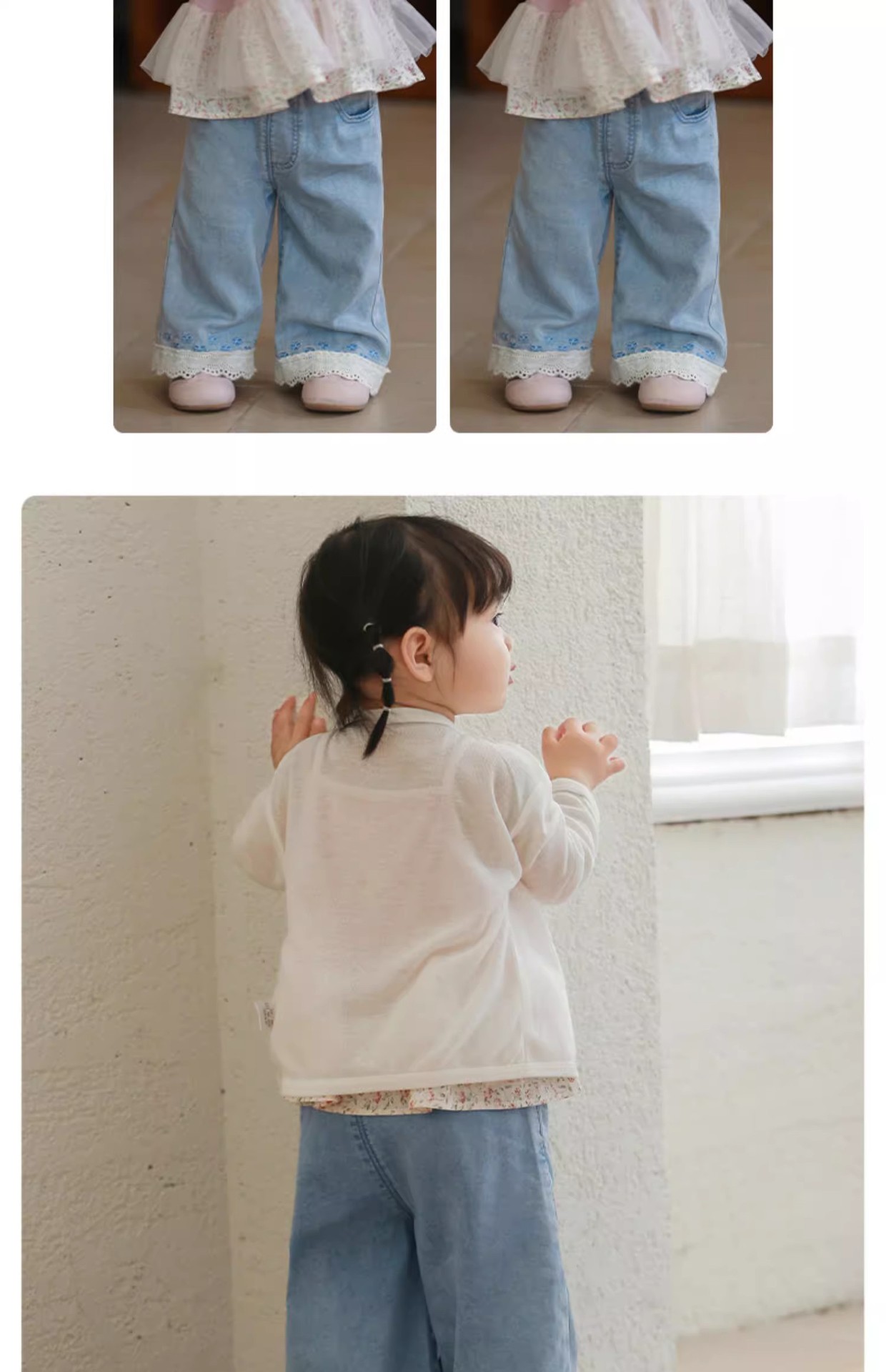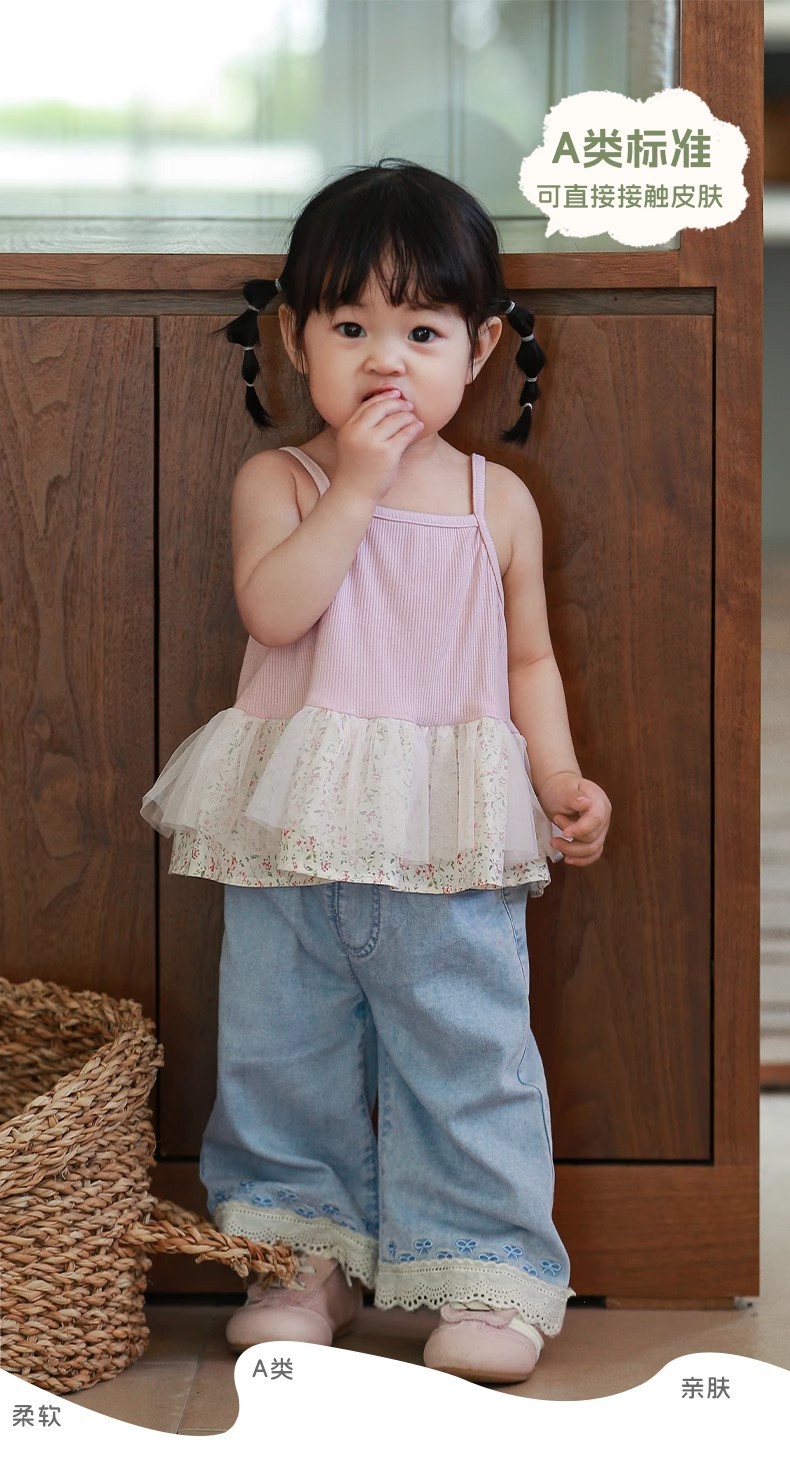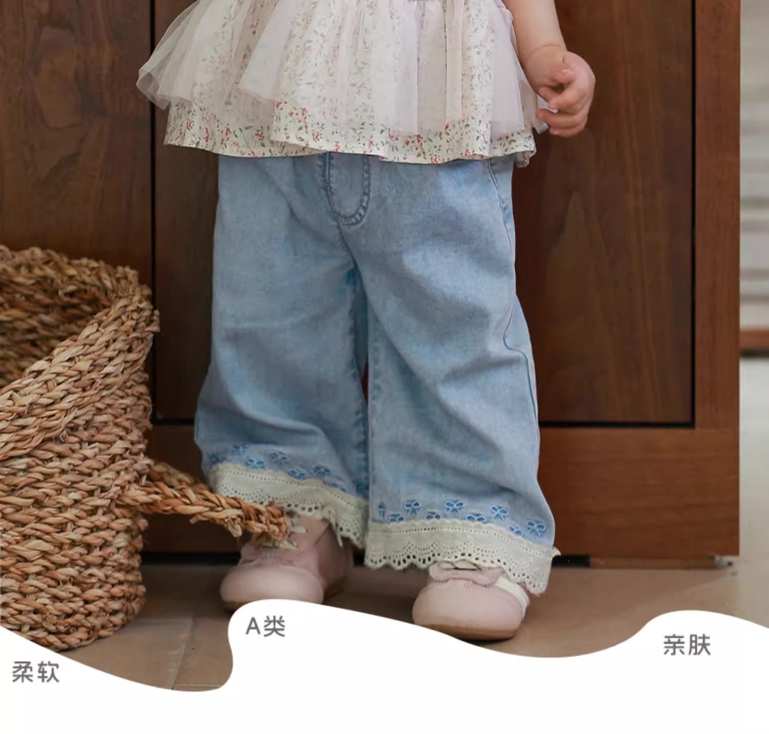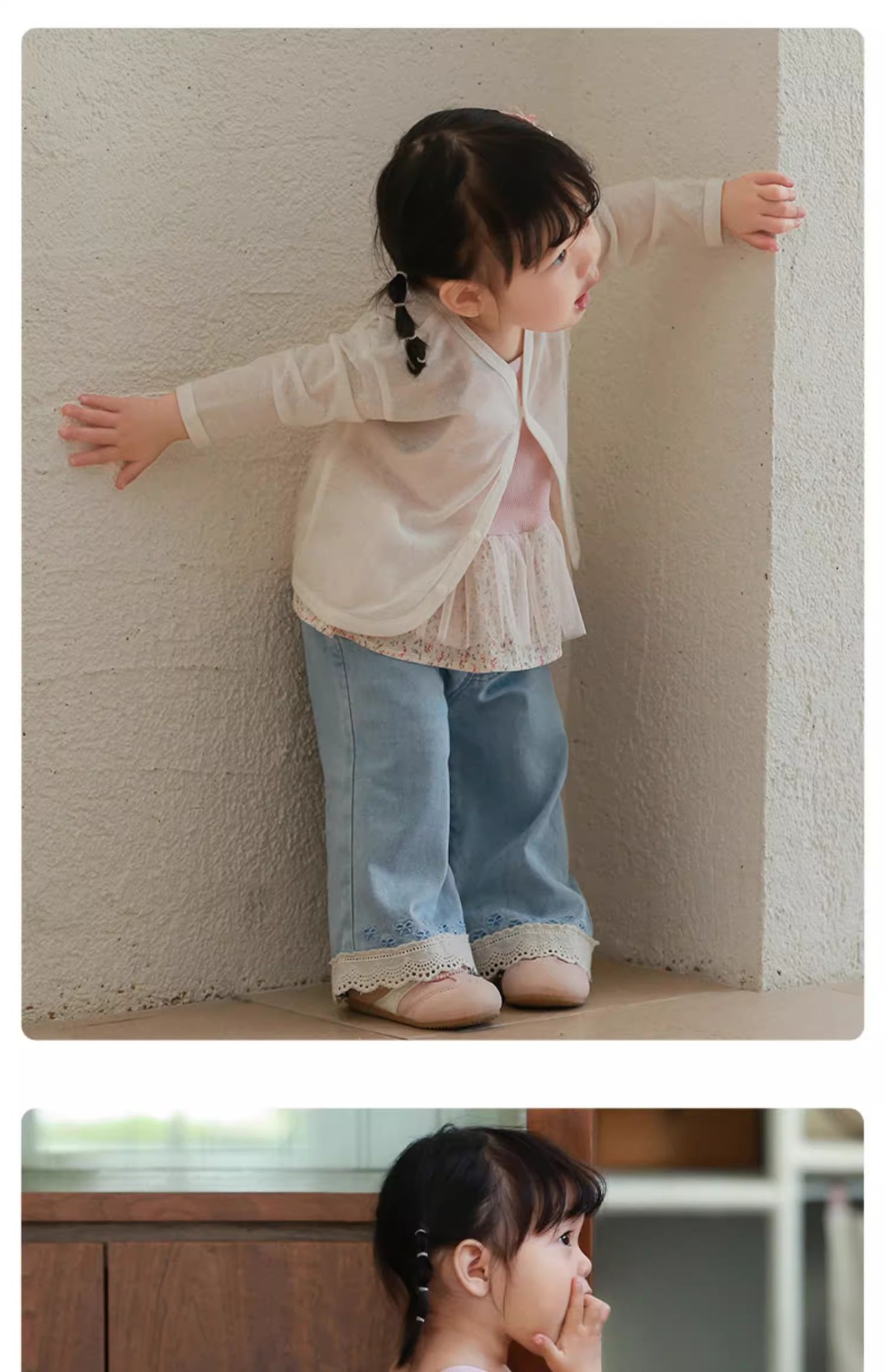 새로운 여자 아기 청바지 25 여름 한국 스타일 유아 피부 친화적 인 부드러운 통기성 레이스 데님 바지