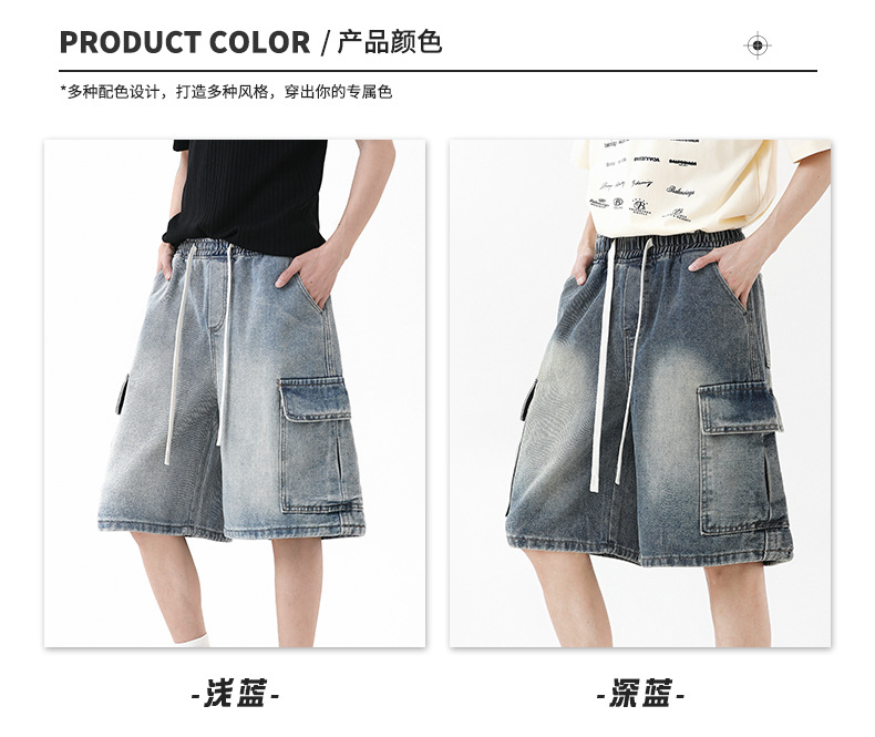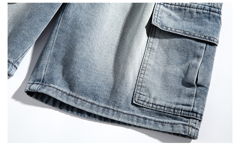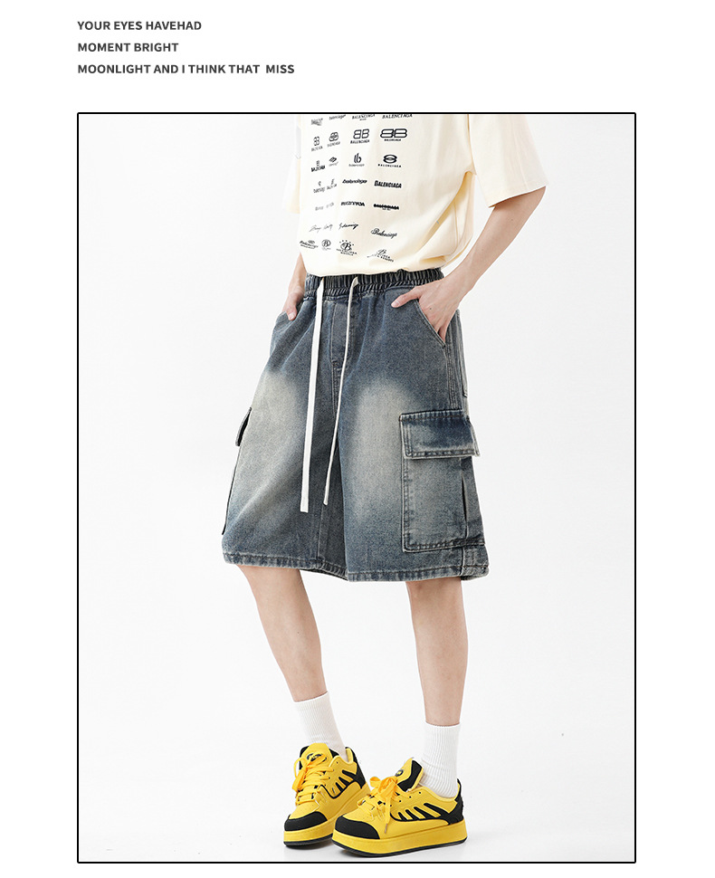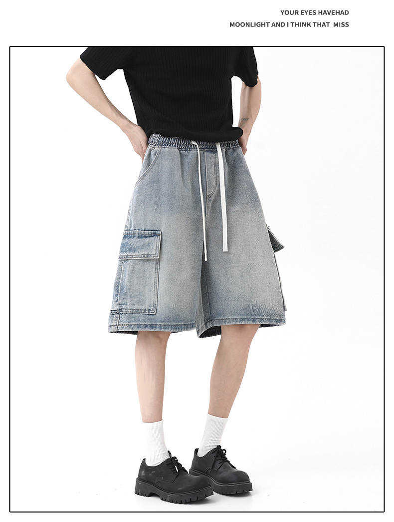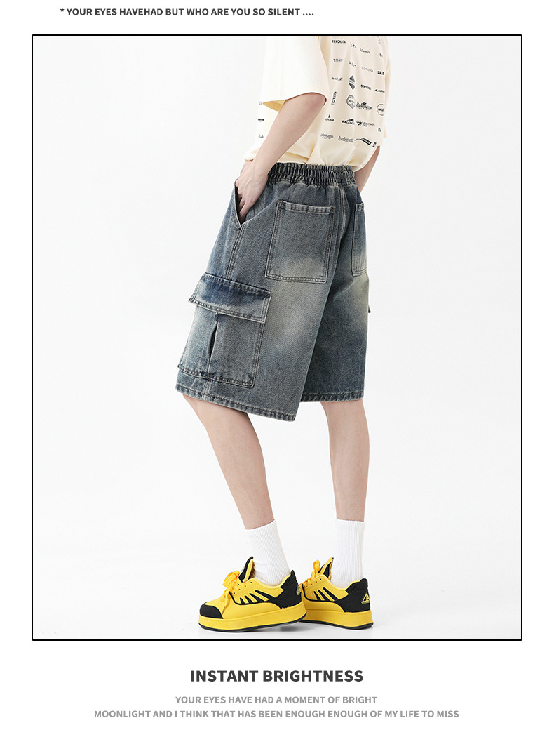 멀티 포켓 툴링 데님 반바지 남성 여름 아메리칸 스타일 하이 스트리트 루즈 스트레이트 버킷 바지 레트로 캐주얼 바지