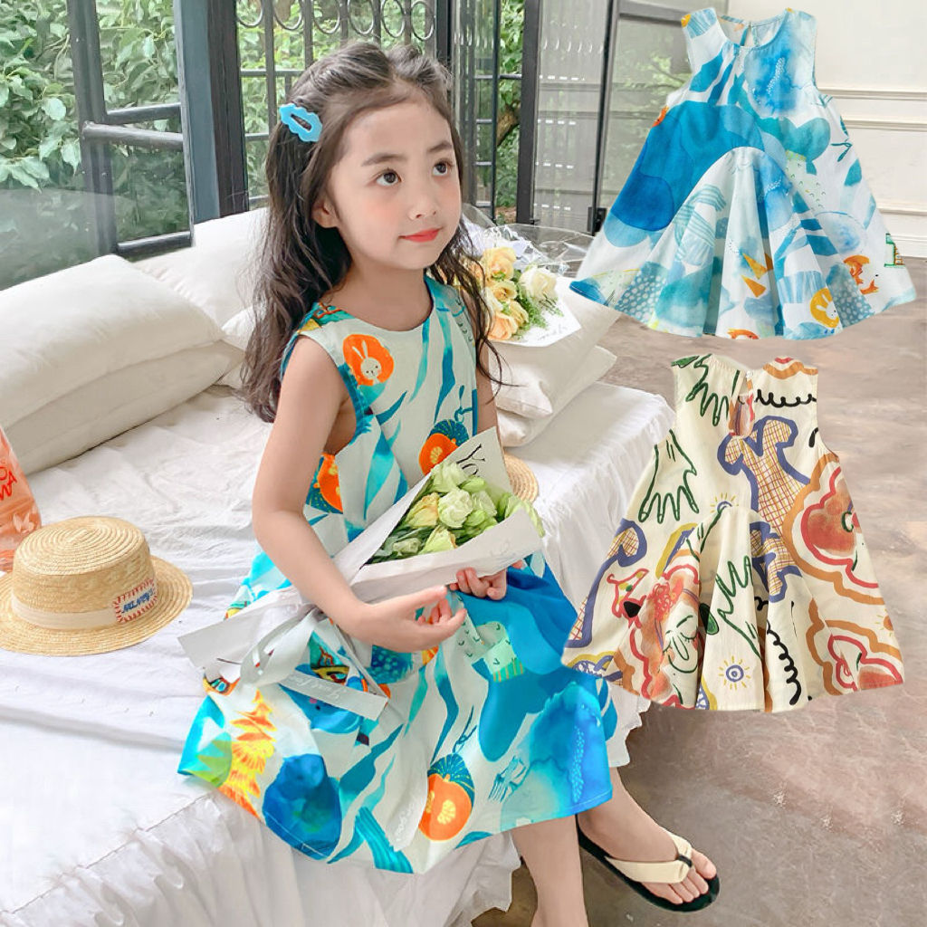 아동 의류 드레스 2025 새로운 여름 민소매 낙서 어린이 소녀 스커트 아기 소녀 면화 스커트