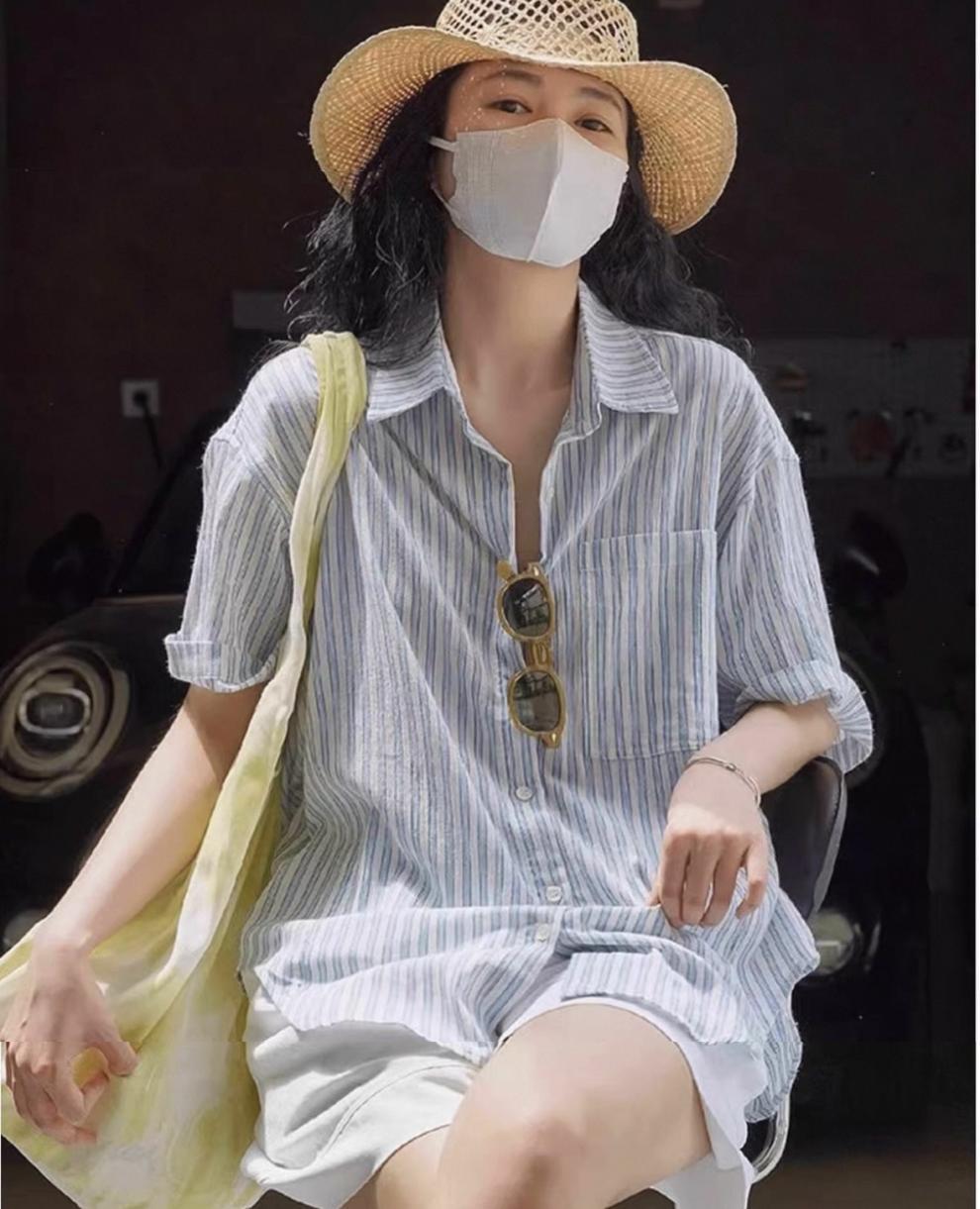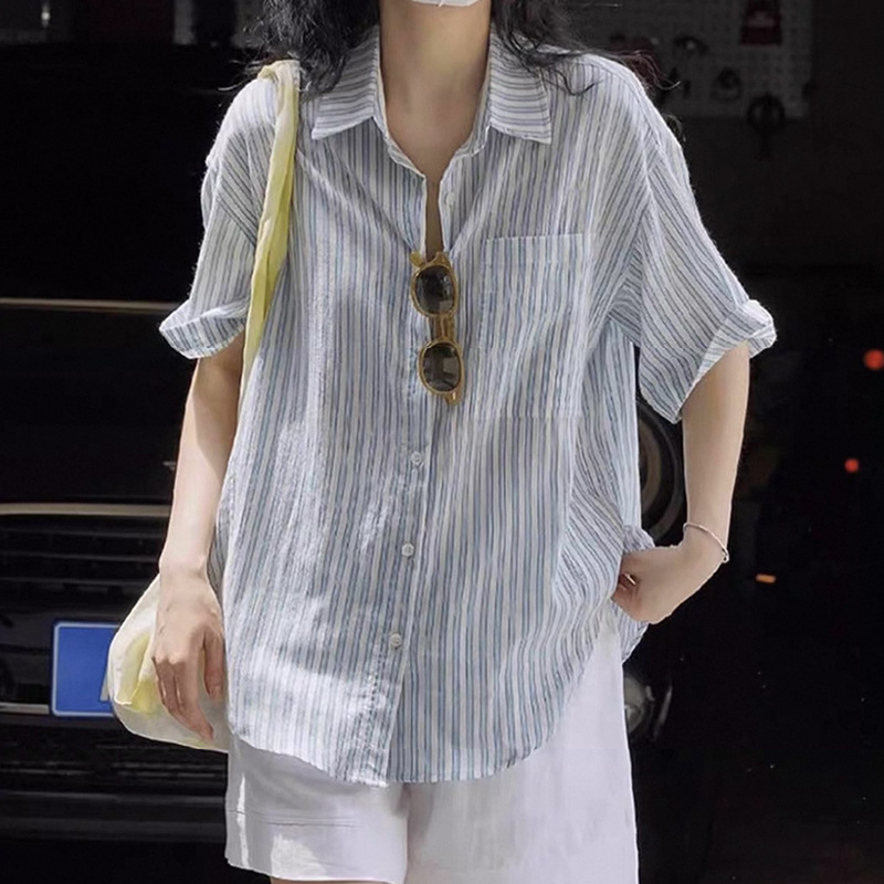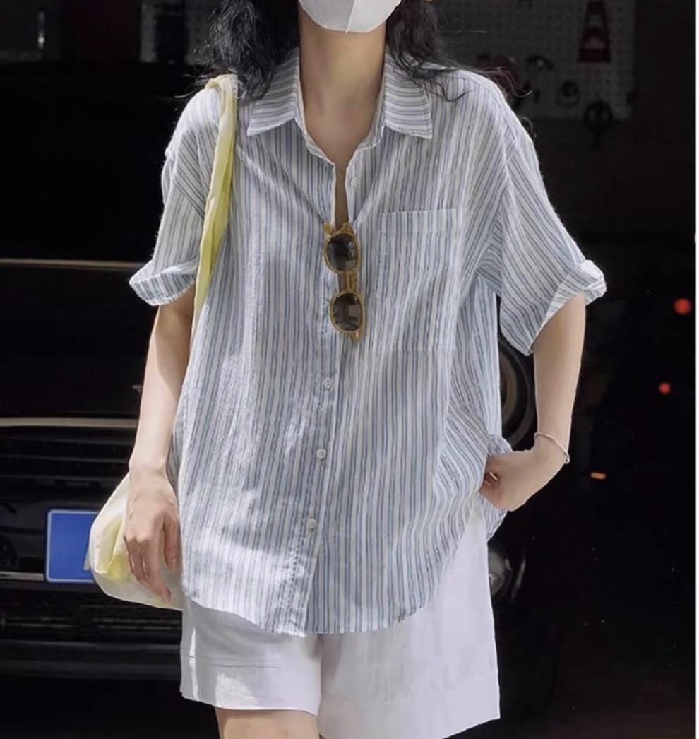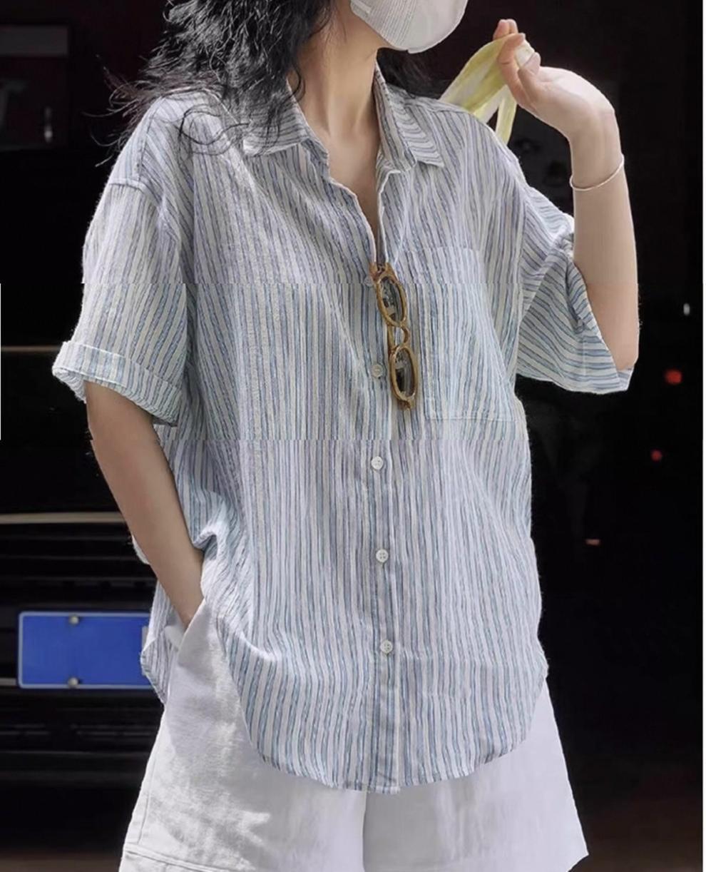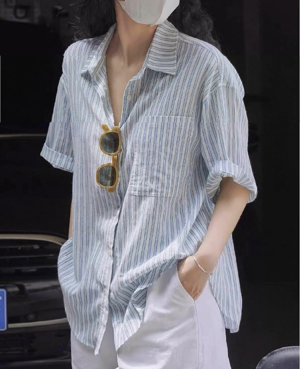 일본식 레트로 블루 스트라이프 코튼과 리넨 반팔 셔츠 여성의 여름 얇은 게으르고 편안한 루즈 탑스토어 가기