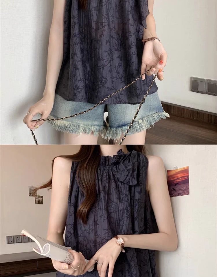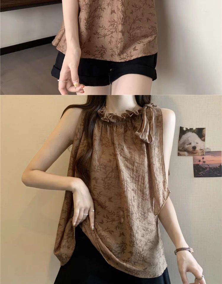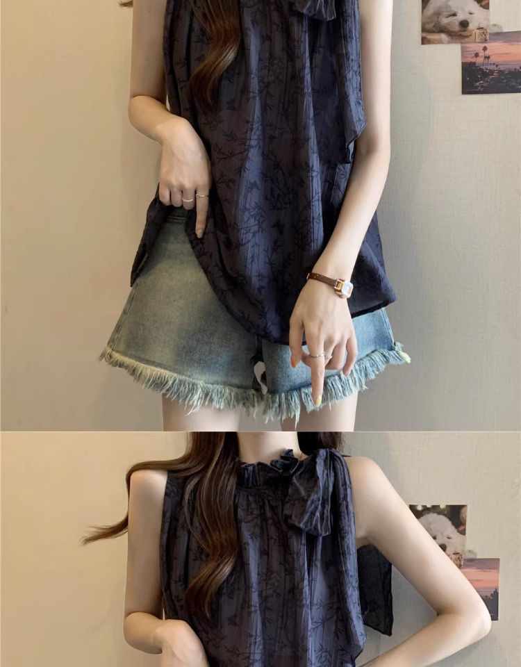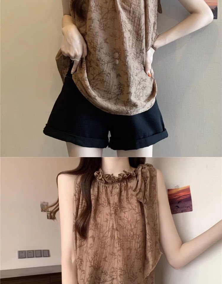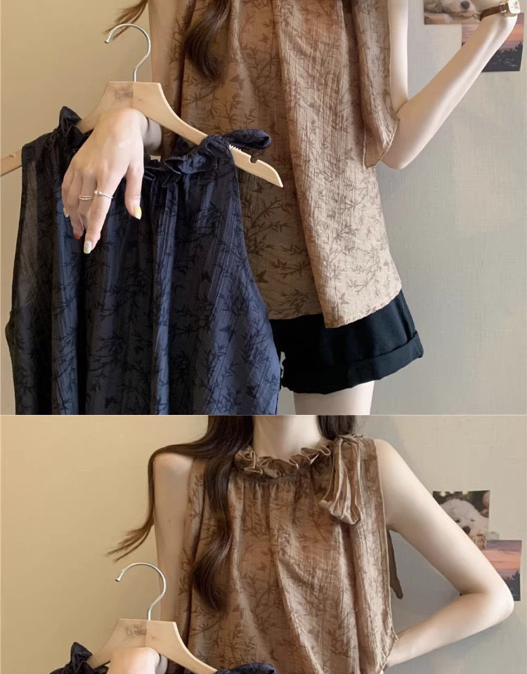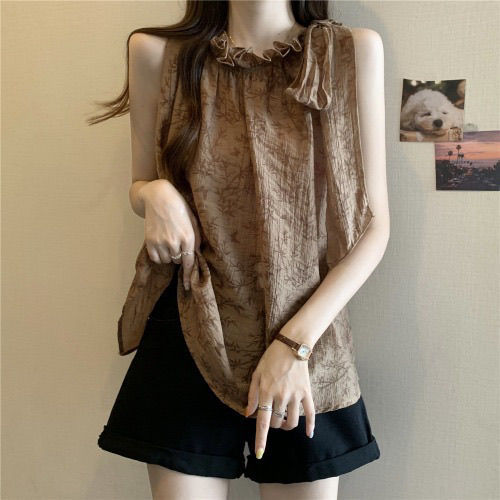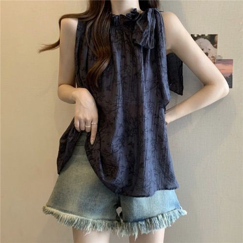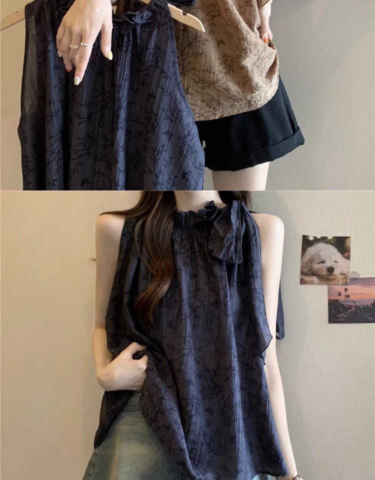 2025 새로운 중국 스타일 민소매 쉬폰 여성 겉옷 여름 플러스 사이즈 뚱뚱한 mm 배꼽 커버 인형 셔츠 홀터 탑 다용도스토어 가기