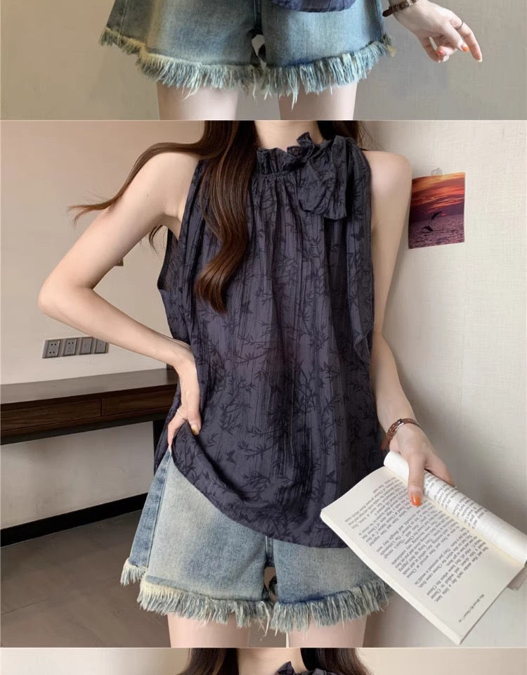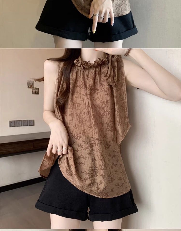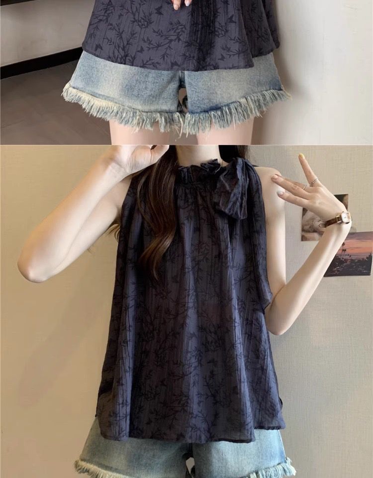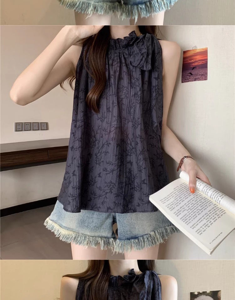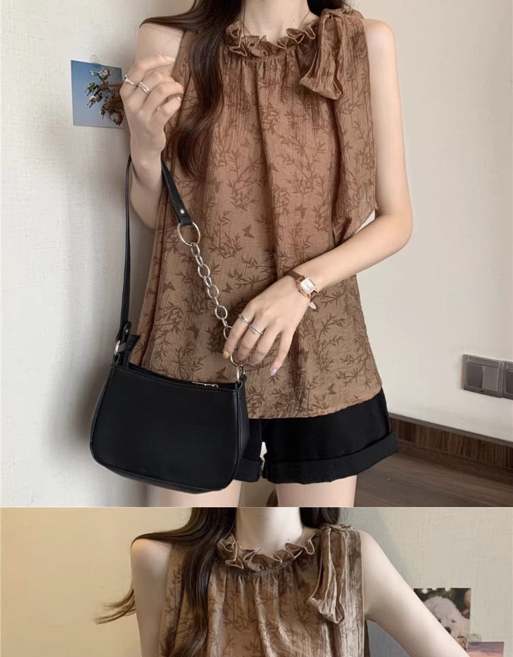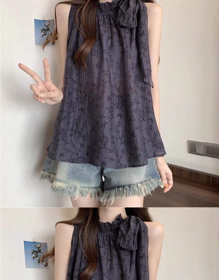 2025 새로운 중국 스타일 민소매 쉬폰 여성 겉옷 여름 플러스 사이즈 뚱뚱한 mm 배꼽 커버 인형 셔츠 홀터 탑 다용도스토어 가기