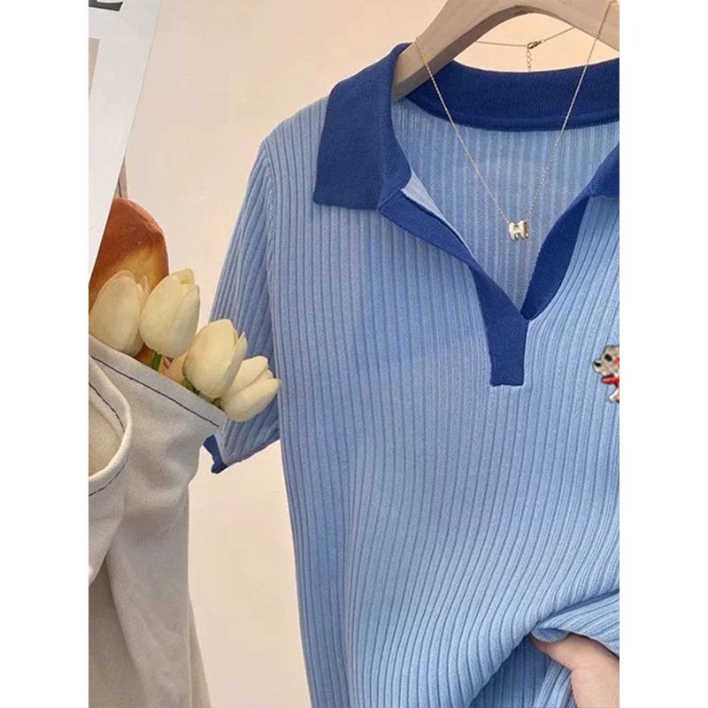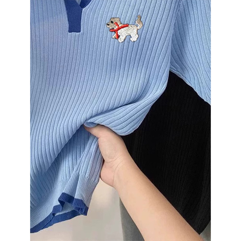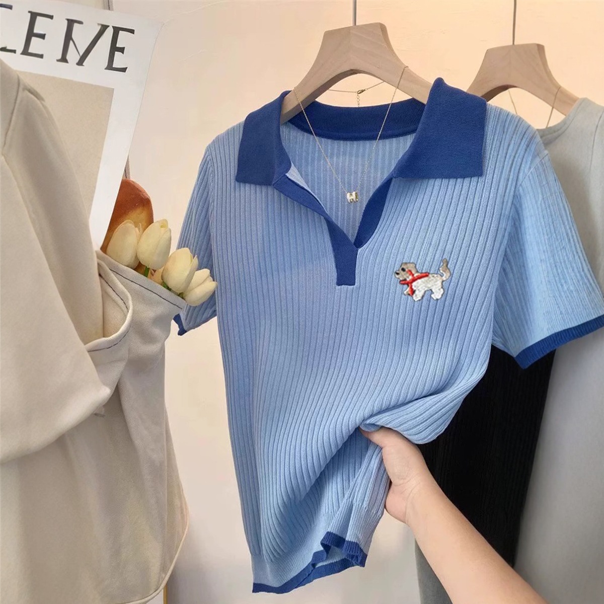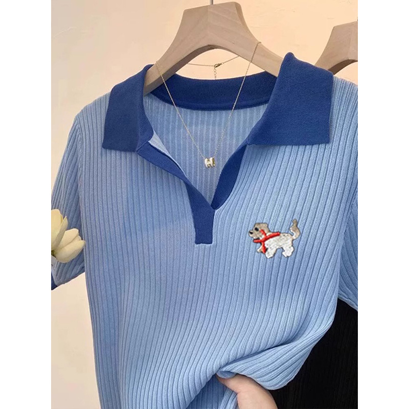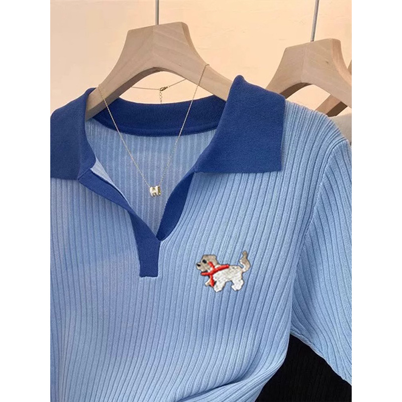얇은 독특한 슈퍼 잘 생긴 블루 폴로 칼라 아이스 실크 니트웨어 자수 강아지 반팔 티셔츠 여성용 2025 년 여름스토어 가기