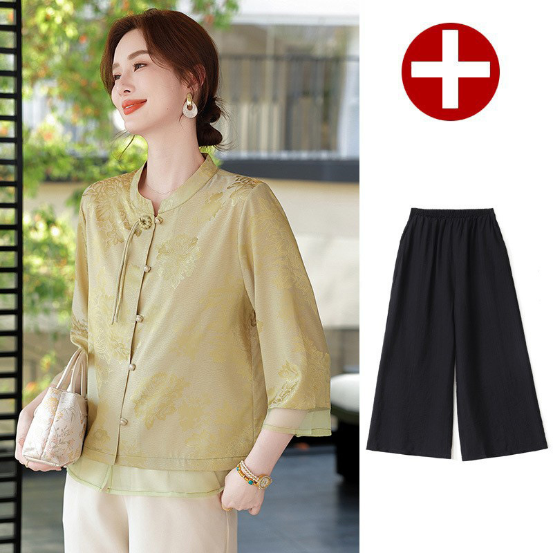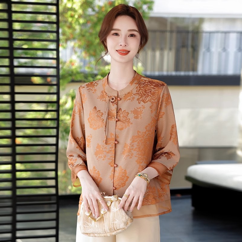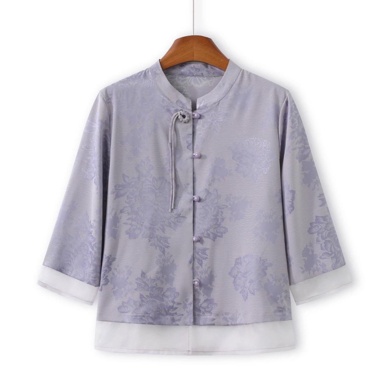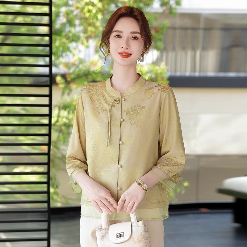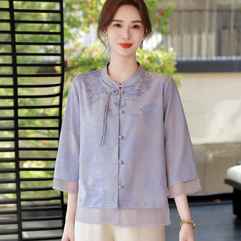 어머니를위한 새로운 스타일 여름 원피스 새로운 중국 스타일 국가 스타일 작은 셔츠 중년 및 노인을위한 세련된 탑 7 점 소매 여성 의류