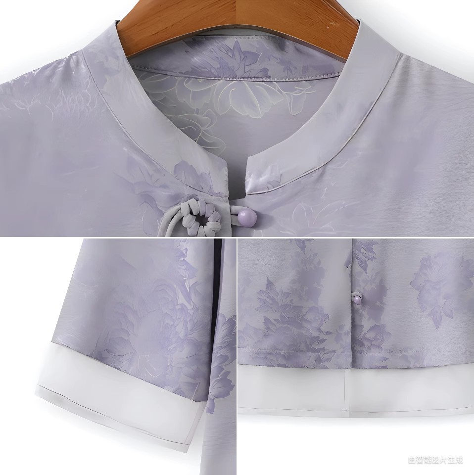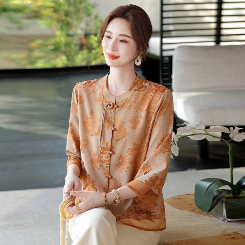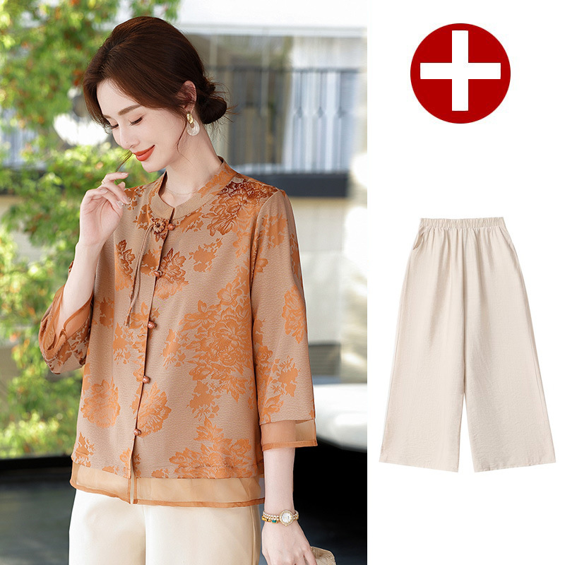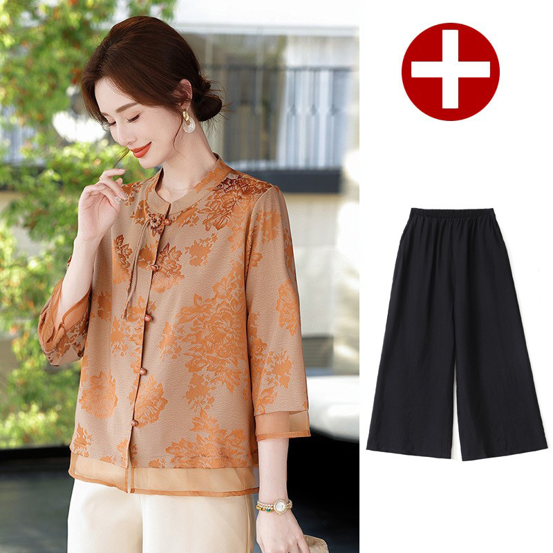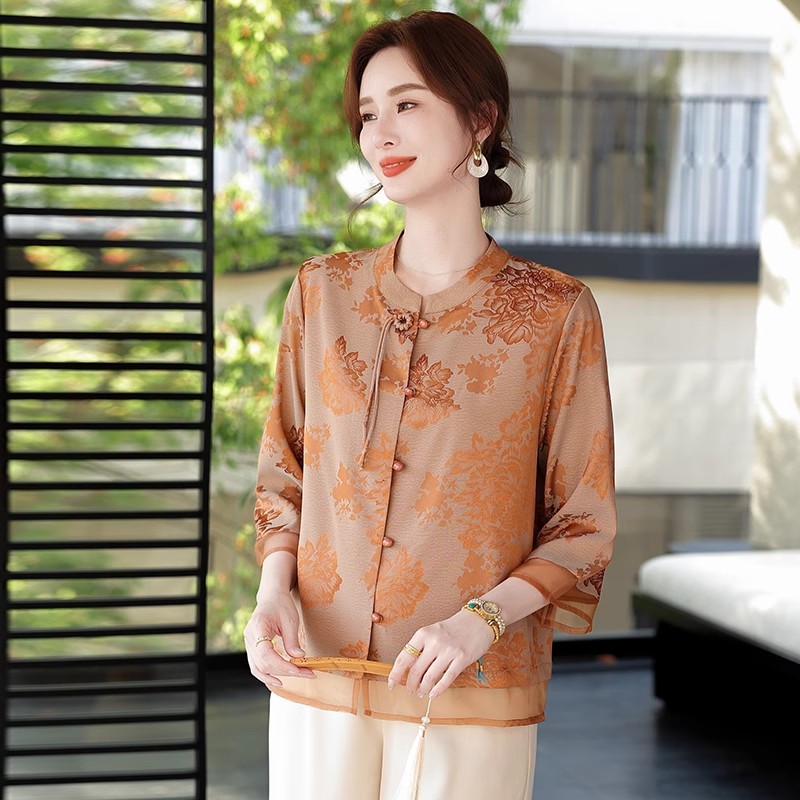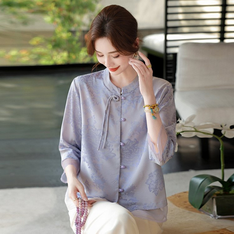 어머니를위한 새로운 스타일 여름 원피스 새로운 중국 스타일 국가 스타일 작은 셔츠 중년 및 노인을위한 세련된 탑 7 점 소매 여성 의류