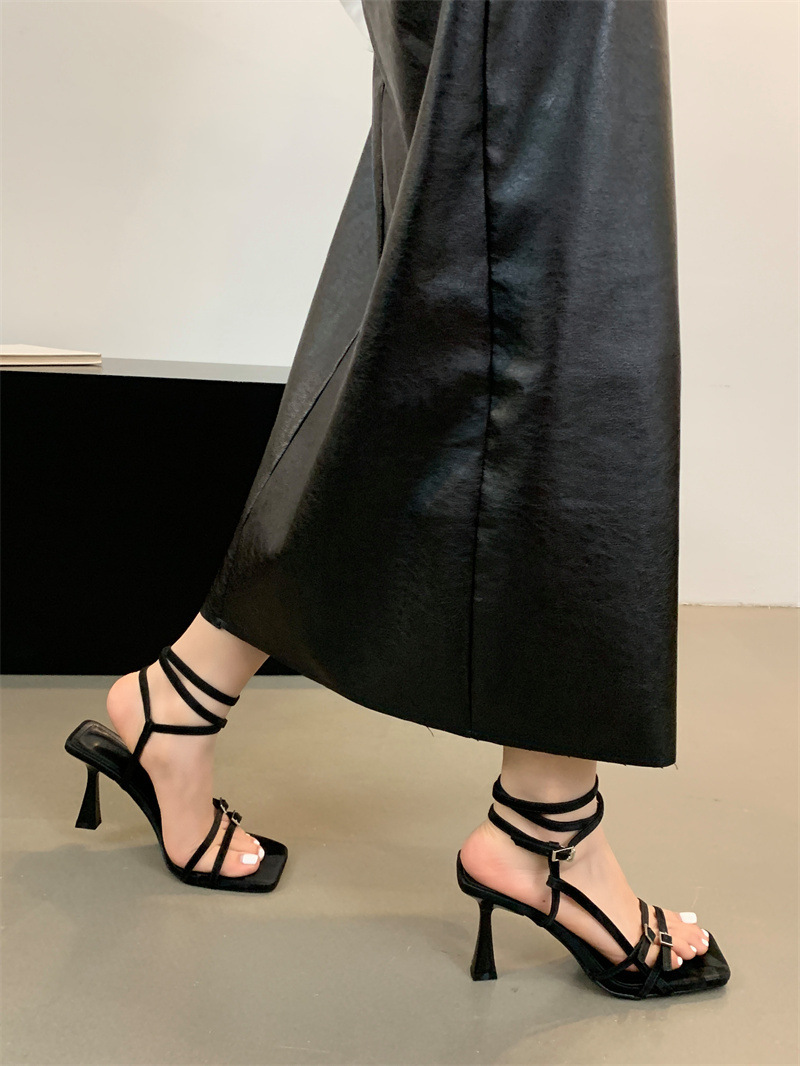 2025년 여름 신상 얇은 스트랩 블랙 스퀘어 토 스트랩 여성용 아름다운 샌들, 여성스러운 스타일, 섹시한 스틸레토 하이힐스토어 가기