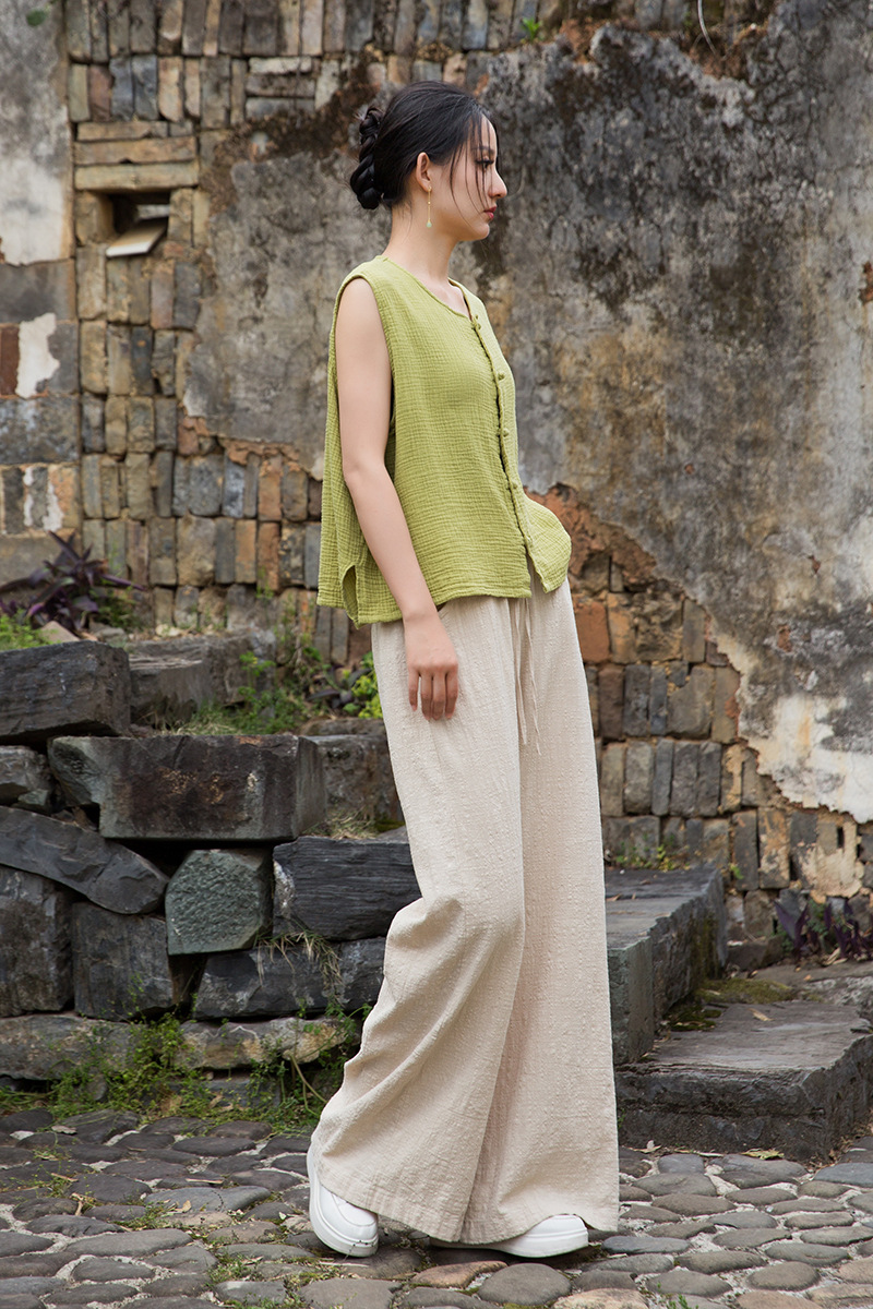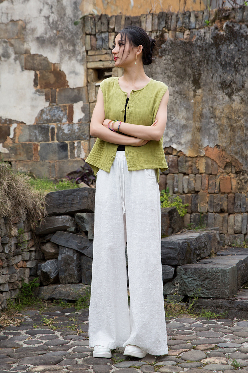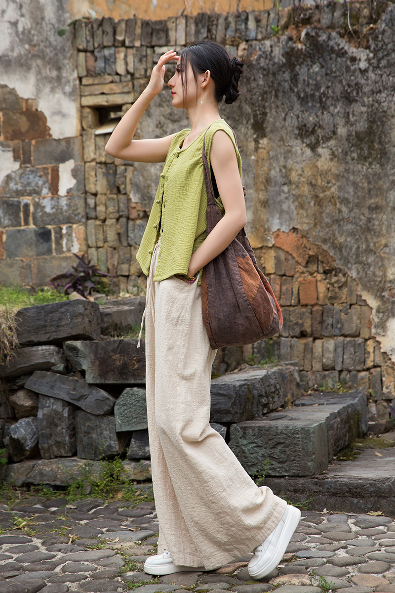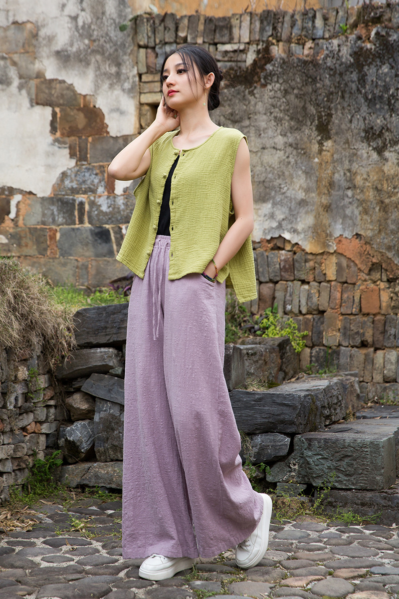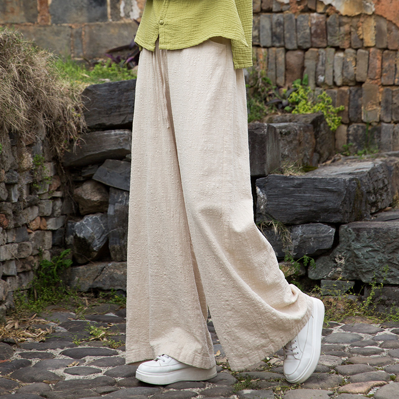 2025 년 여름면 및 린넨 여성 의류 새로운 슬러브면 모래 세척 오래된 바지 명상 얇은 여성의 넓은 다리 바지