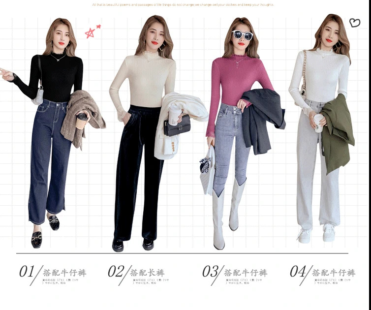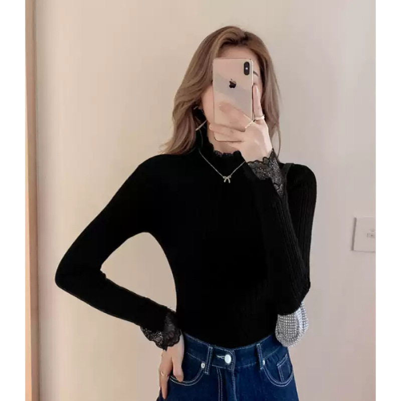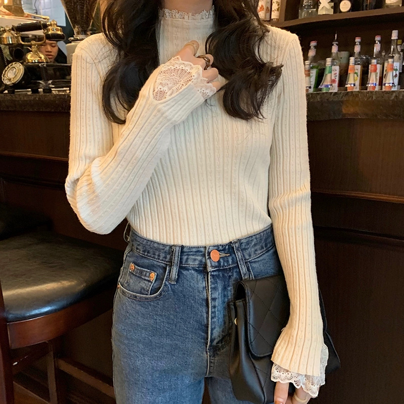 여성용 가을 겨울 레이스 스플리싱 니트 바텀 셔츠, 패셔너블한 이너웨어 슬림핏 탑, 디자인 니치 기질 스웨터스토어 가기