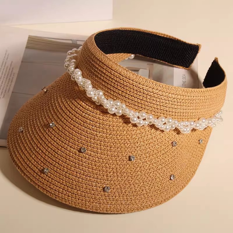 가벼운 럭셔리 라인 스톤 펄 헤어 모자 여성의 여름 통기성 선 스크린 모자 휴가를위한 올 매치 태양 모자