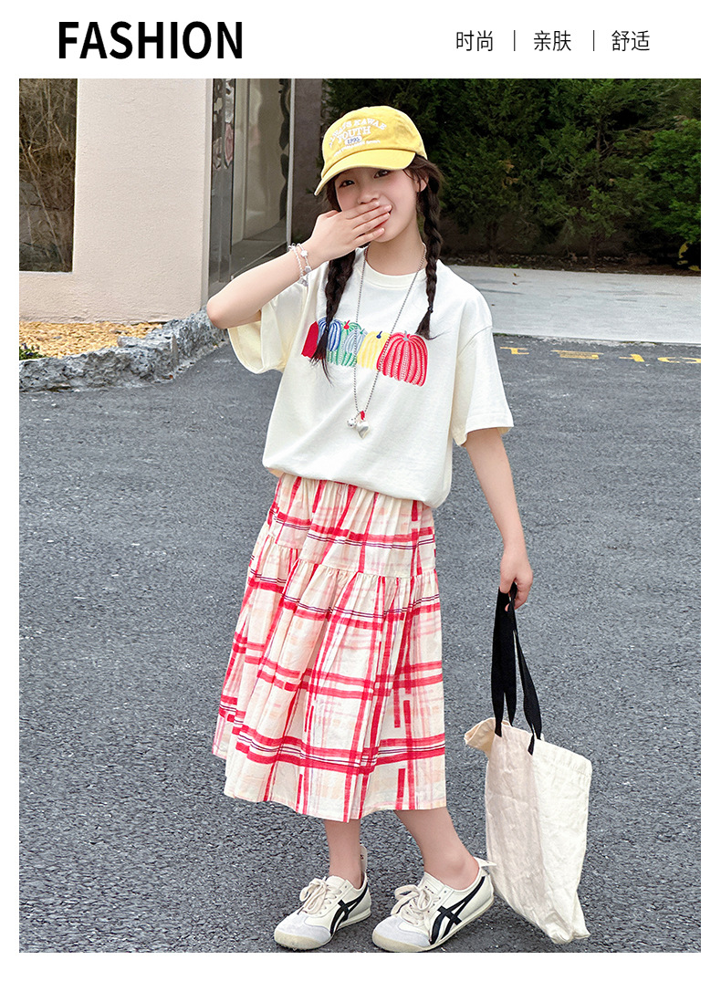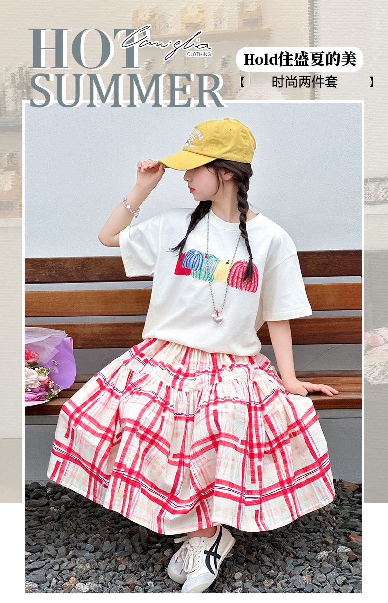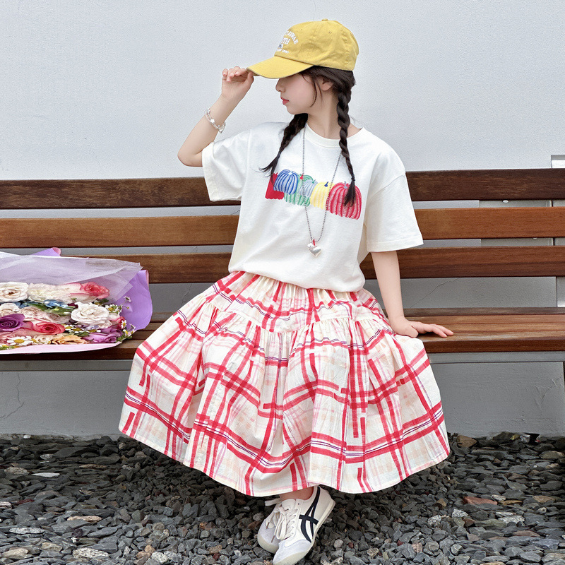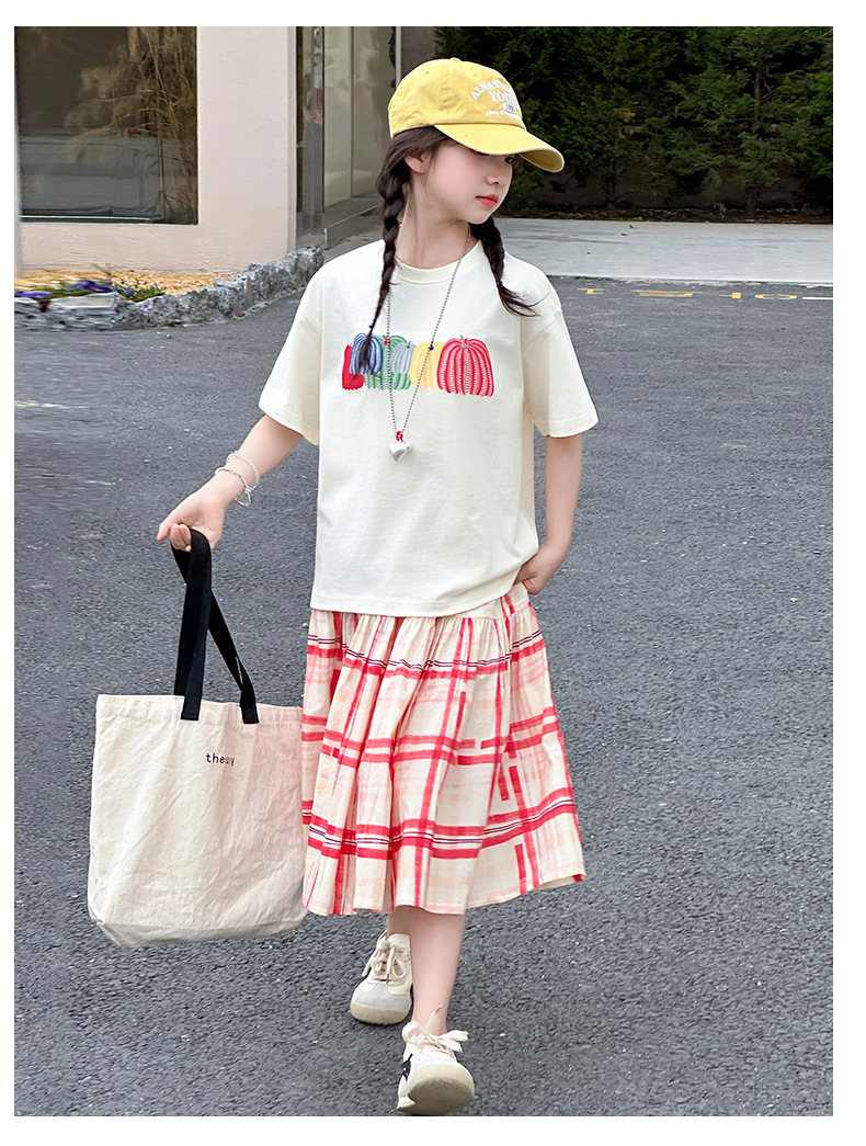소녀의 달콤한 컬러 호박 티셔츠 빨간 격자 무늬 스커트 투피스 2025 얇은 어린이 느슨한 세트 트렌디스토어 가기