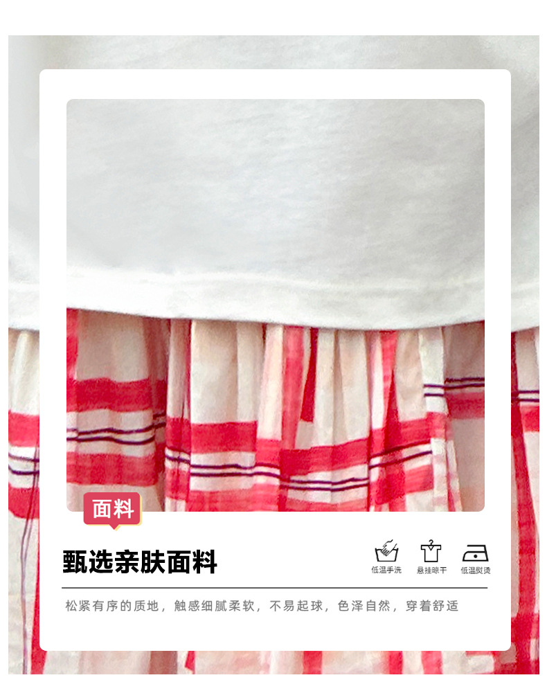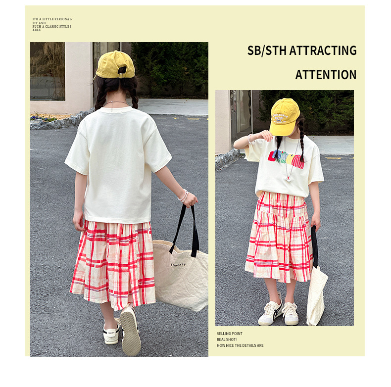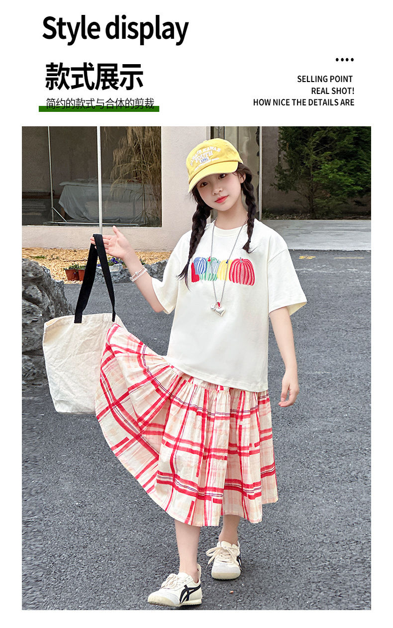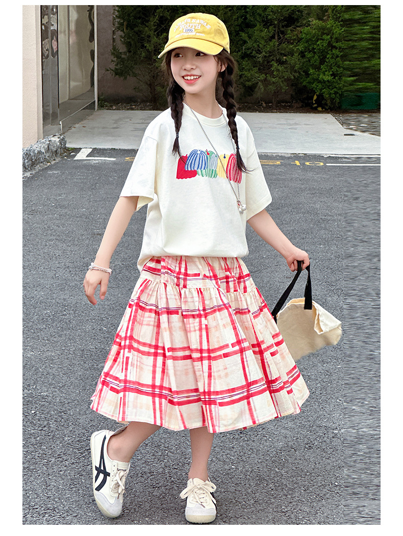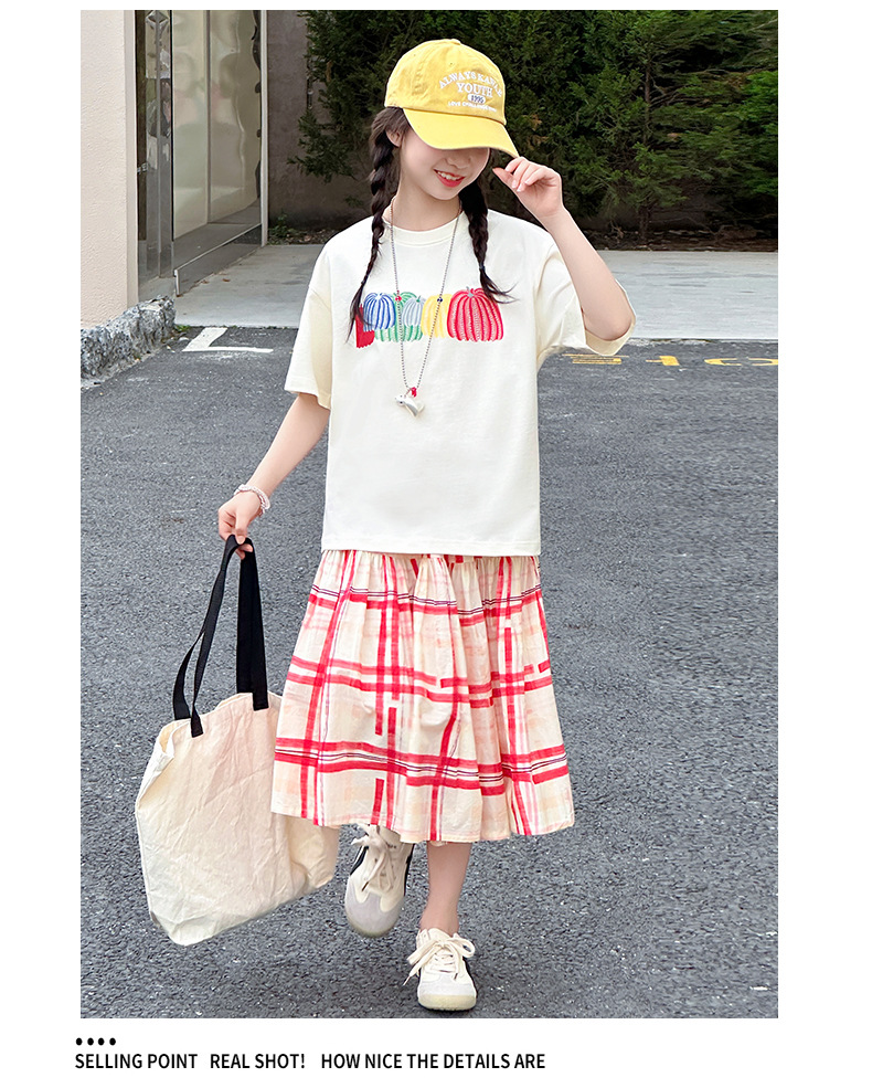 소녀의 달콤한 컬러 호박 티셔츠 빨간 격자 무늬 스커트 투피스 2025 얇은 어린이 느슨한 세트 트렌디스토어 가기