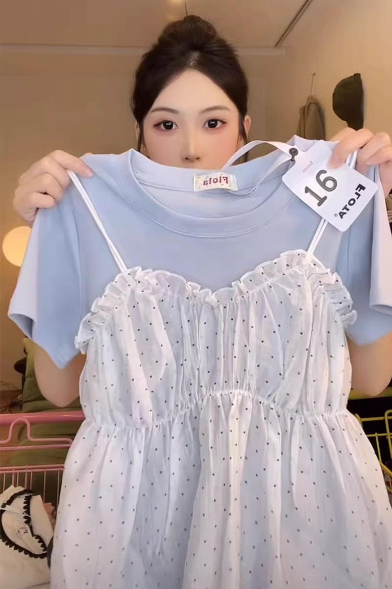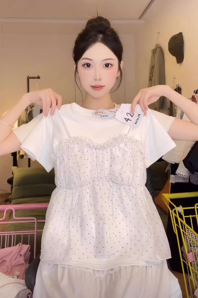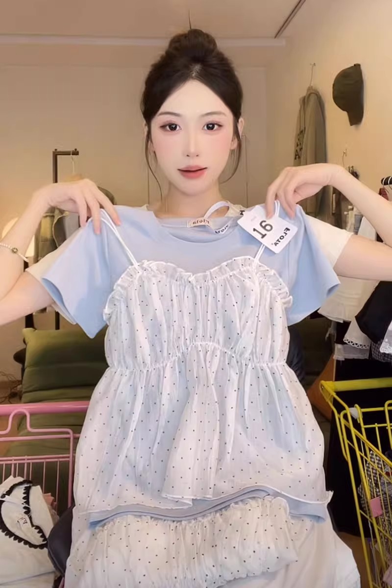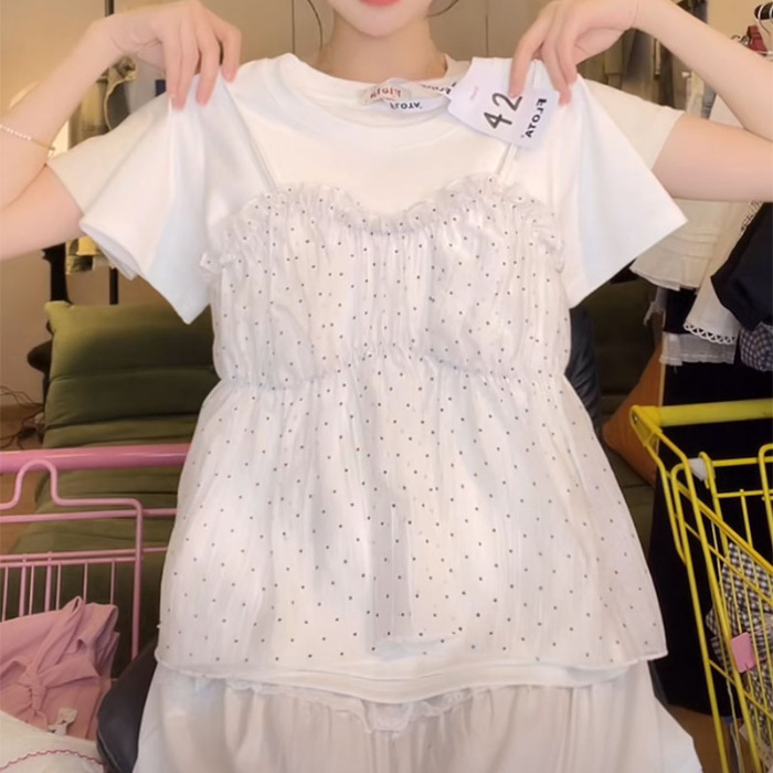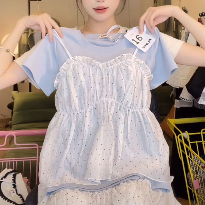 한국식 틈새 크루 넥 티셔츠 폴카 도트 블라우스 가짜 투피스 반팔 여성용 여름 새 달콤한 어깨 슬림 탑스토어 가기