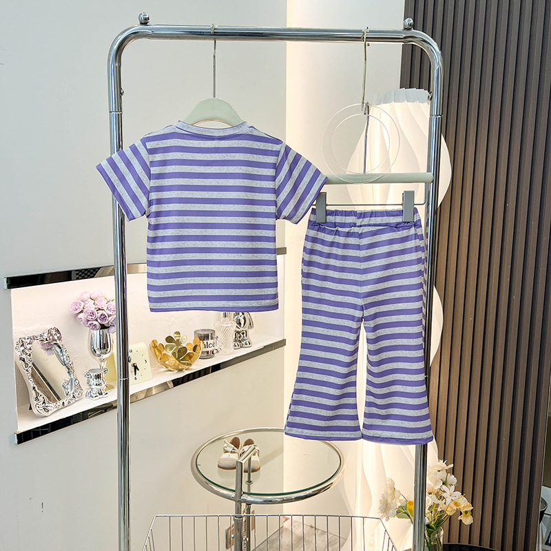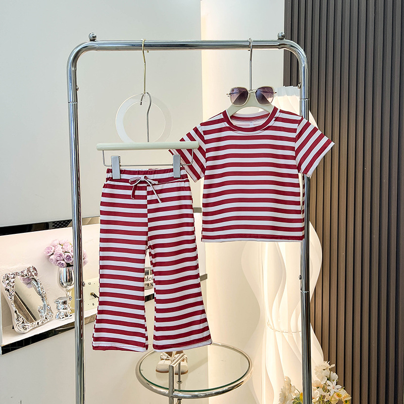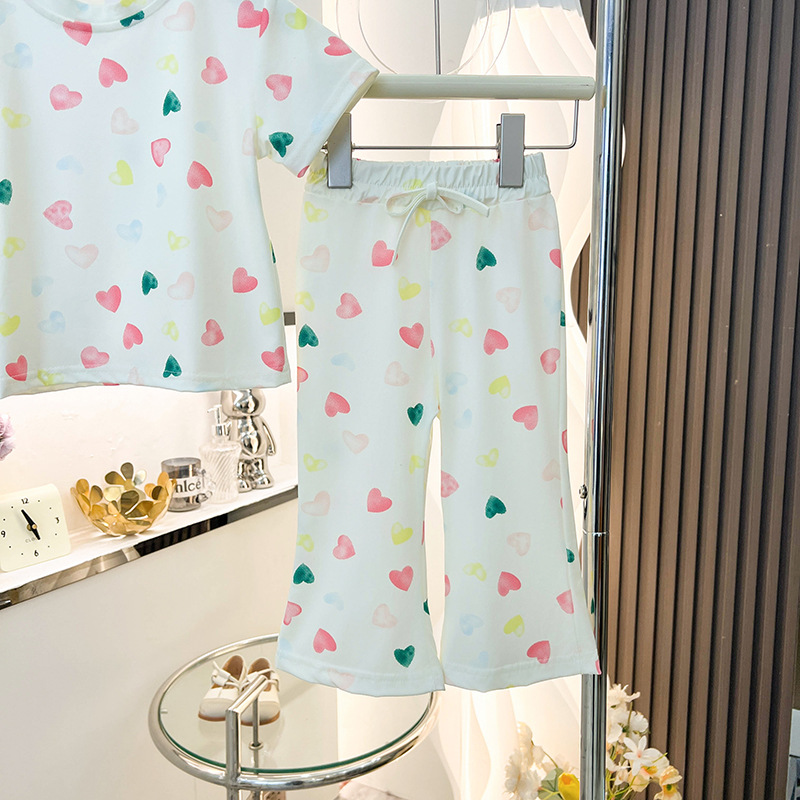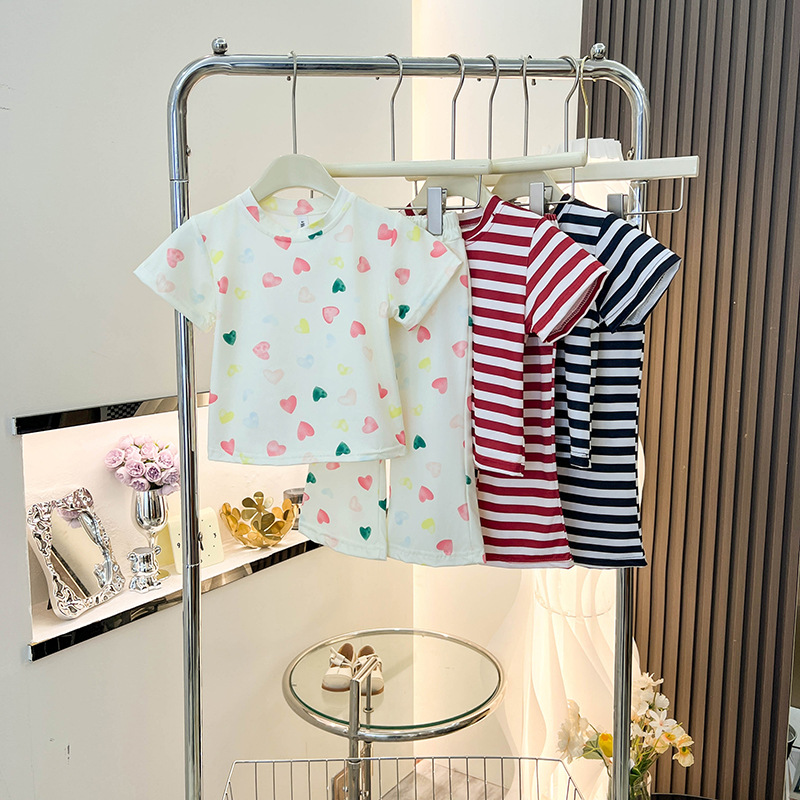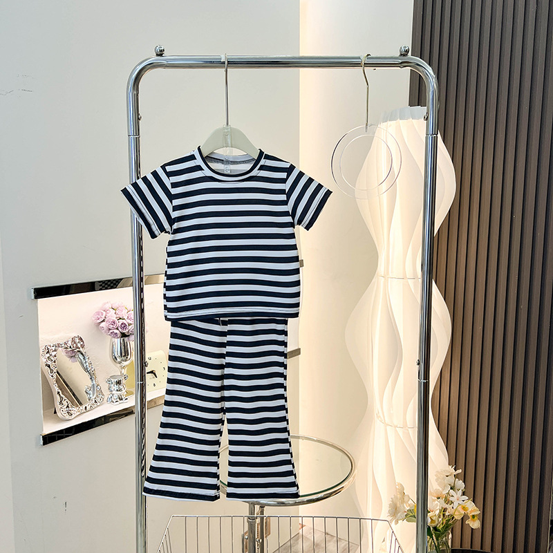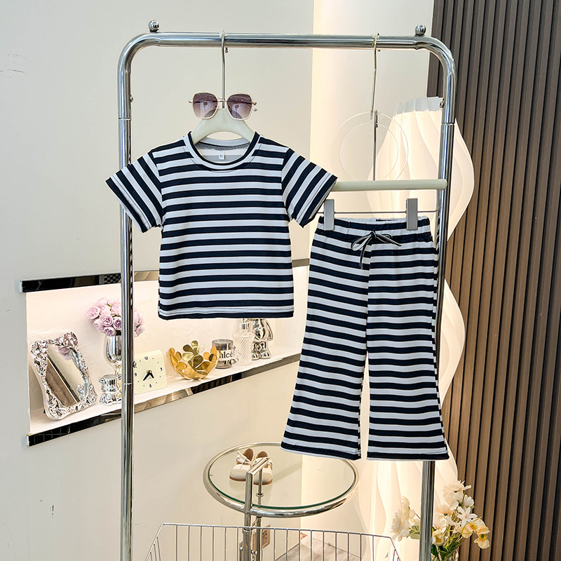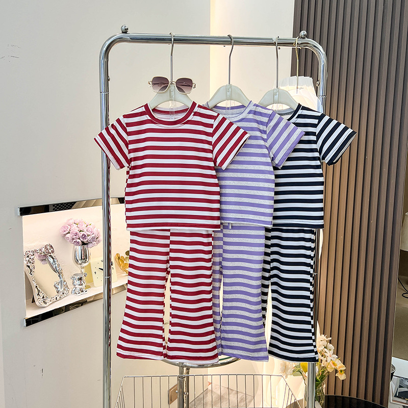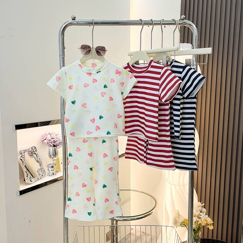 여름 어린이 반팔 티셔츠 소녀 줄무늬 플레어 바지 새로운 한국식 풀 프린트 달콤한 투피스 유행 세트스토어 가기
