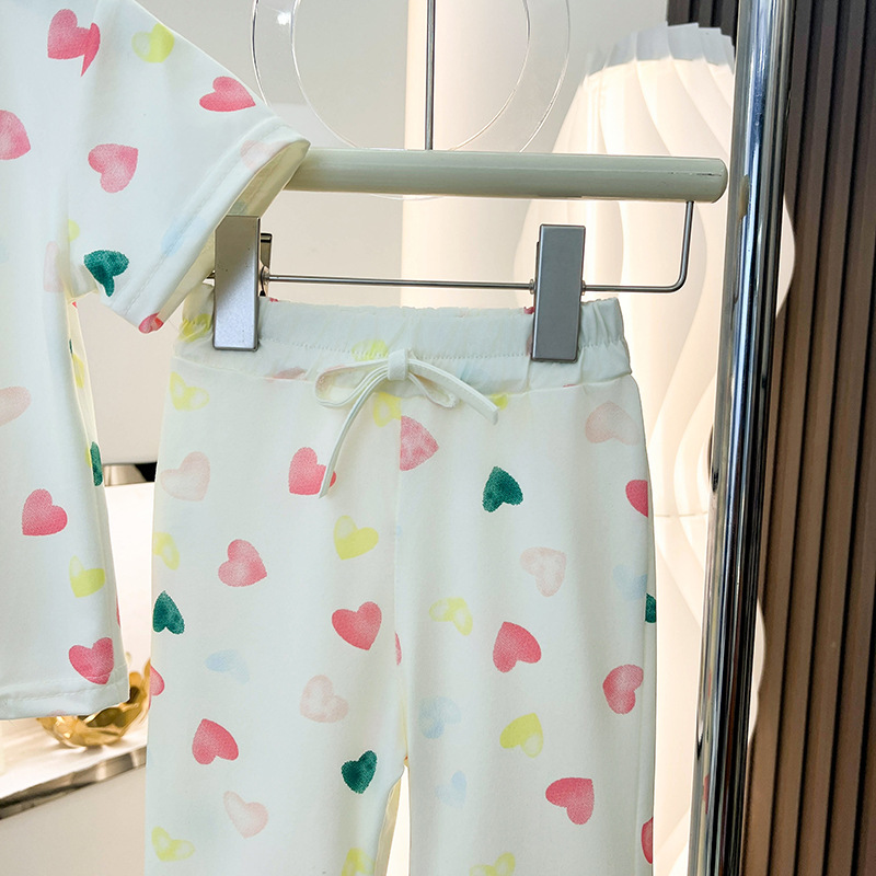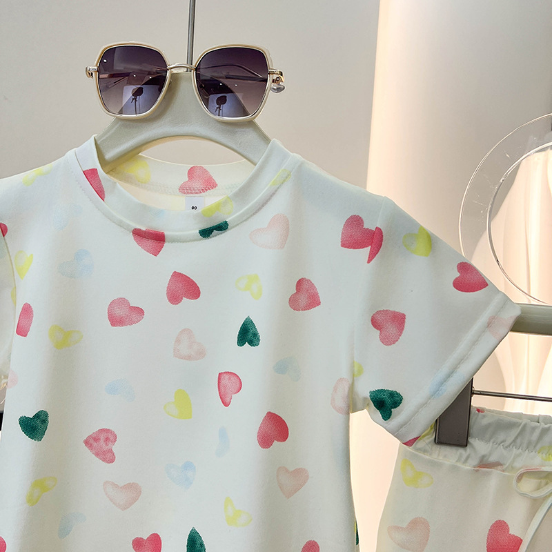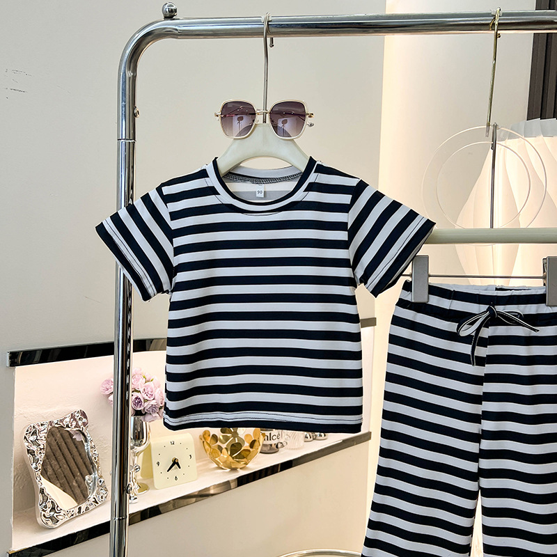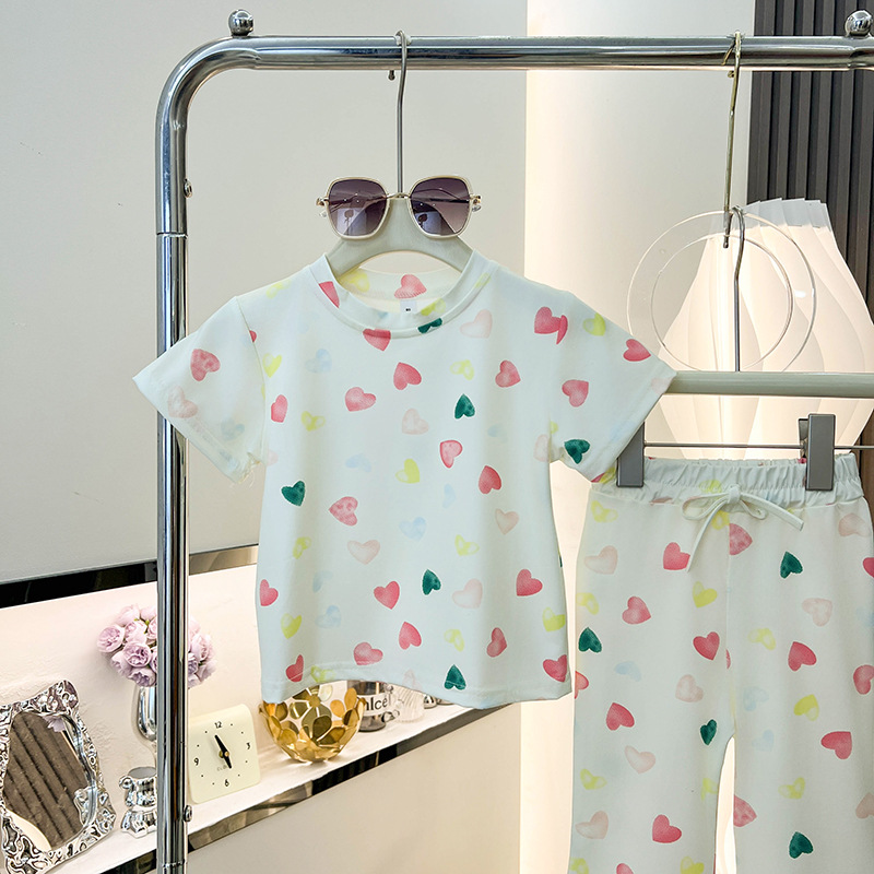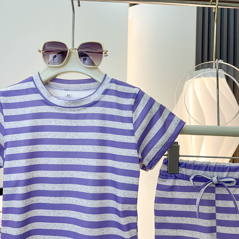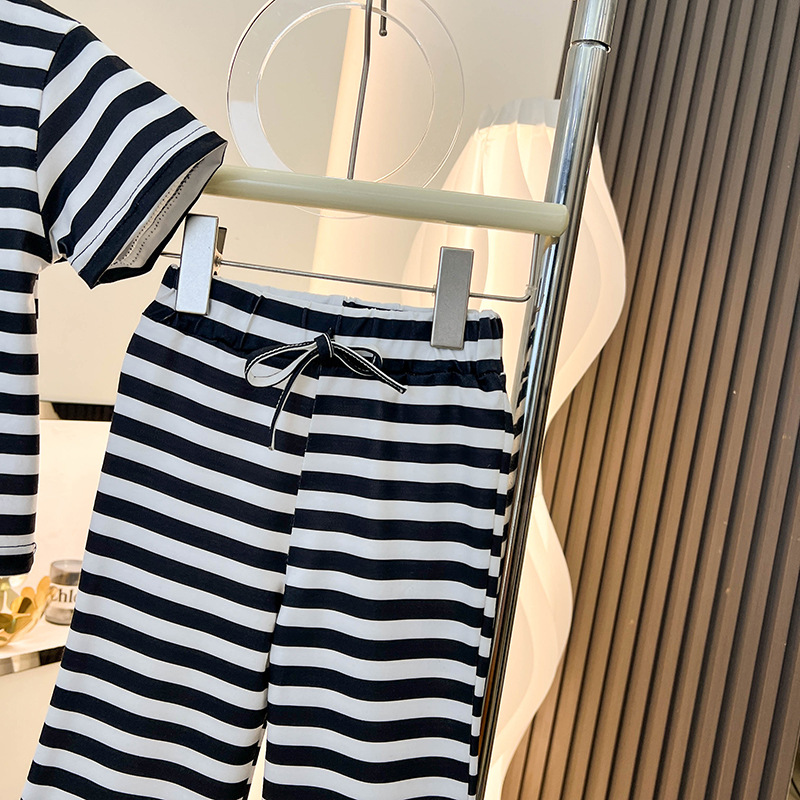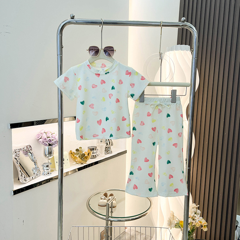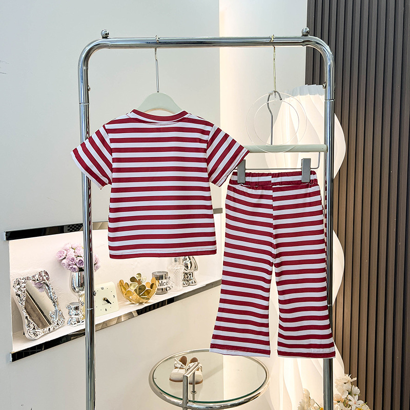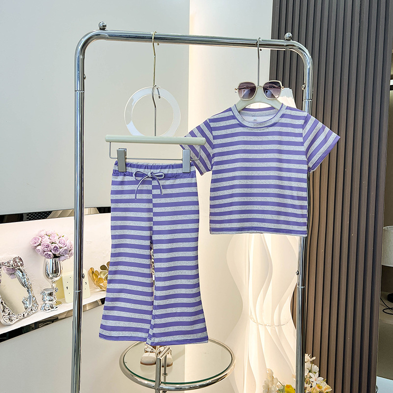 여름 어린이 반팔 티셔츠 소녀 줄무늬 플레어 바지 새로운 한국식 풀 프린트 달콤한 투피스 유행 세트스토어 가기