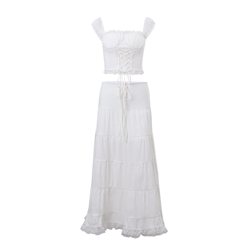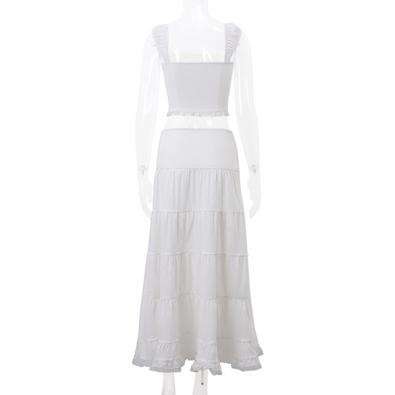 2025 새로운 여름 여성 프렌치 스퀘어 넥 서스펜더 탑 레이스 스플 라이스 스커트 여성용 홀리데이 스타일 슈트