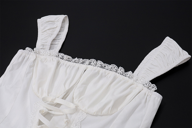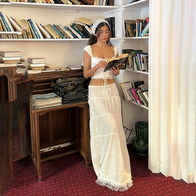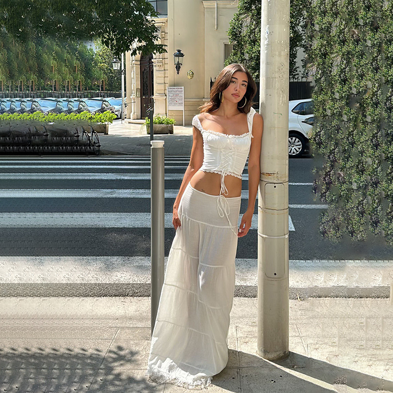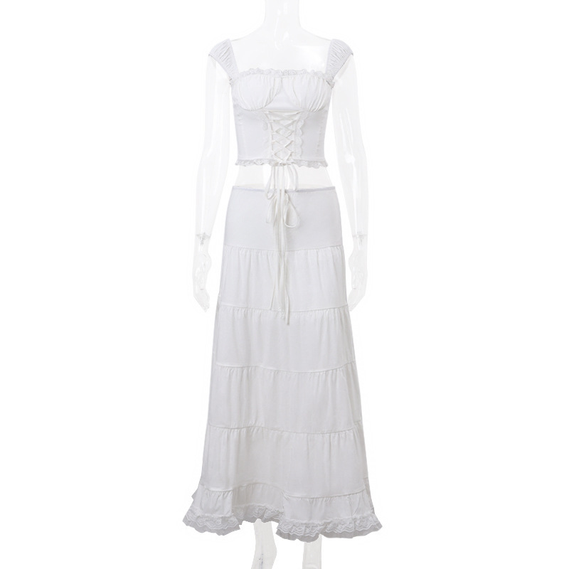 2025 새로운 여름 여성 프렌치 스퀘어 넥 서스펜더 탑 레이스 스플 라이스 스커트 여성용 홀리데이 스타일 슈트스토어 가기