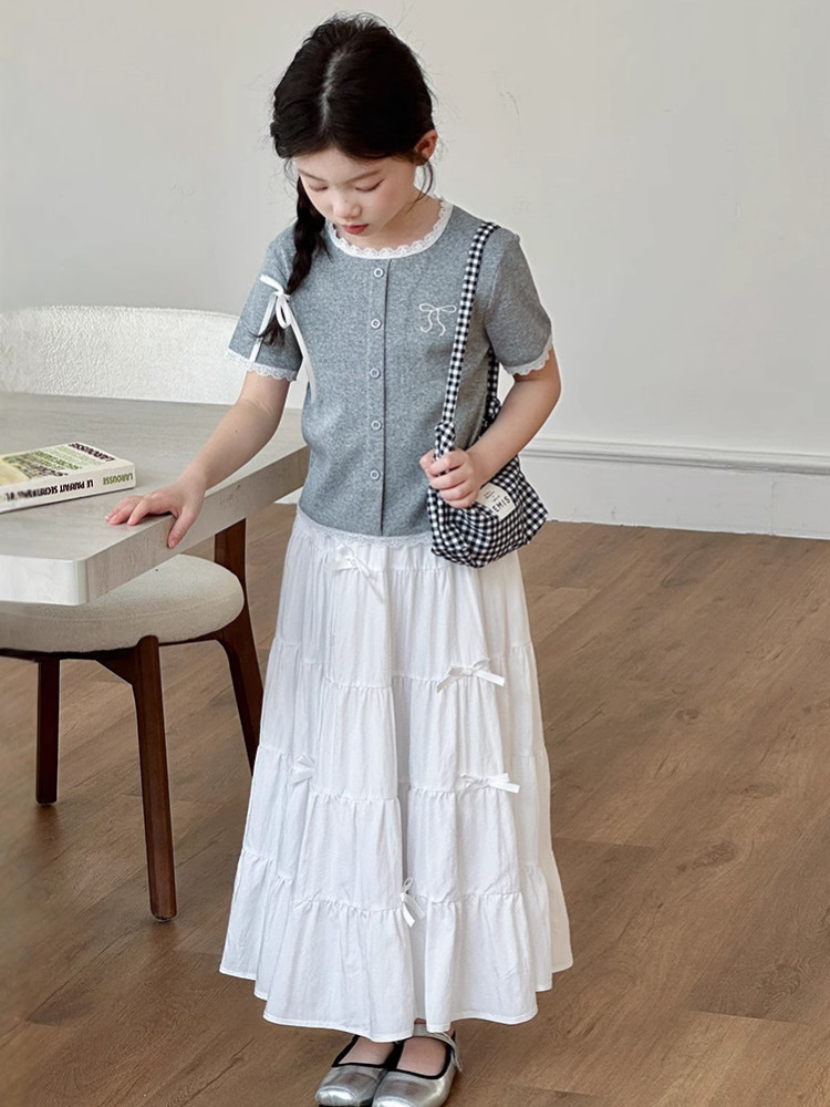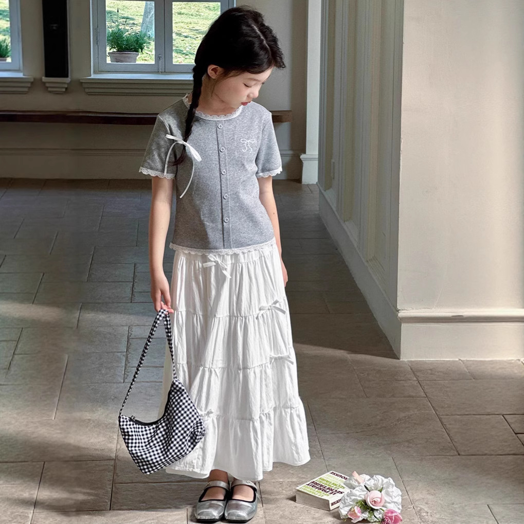 한국 소녀의 여름 세트 2025 새로운 어린이 여름 달콤한 레이스 바느질 소녀의 탑 화이트 롱 원피스