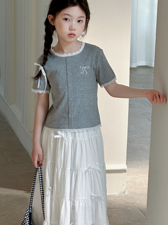 한국 소녀의 여름 세트 2025 새로운 어린이 여름 달콤한 레이스 바느질 소녀의 탑 화이트 롱 원피스스토어 가기