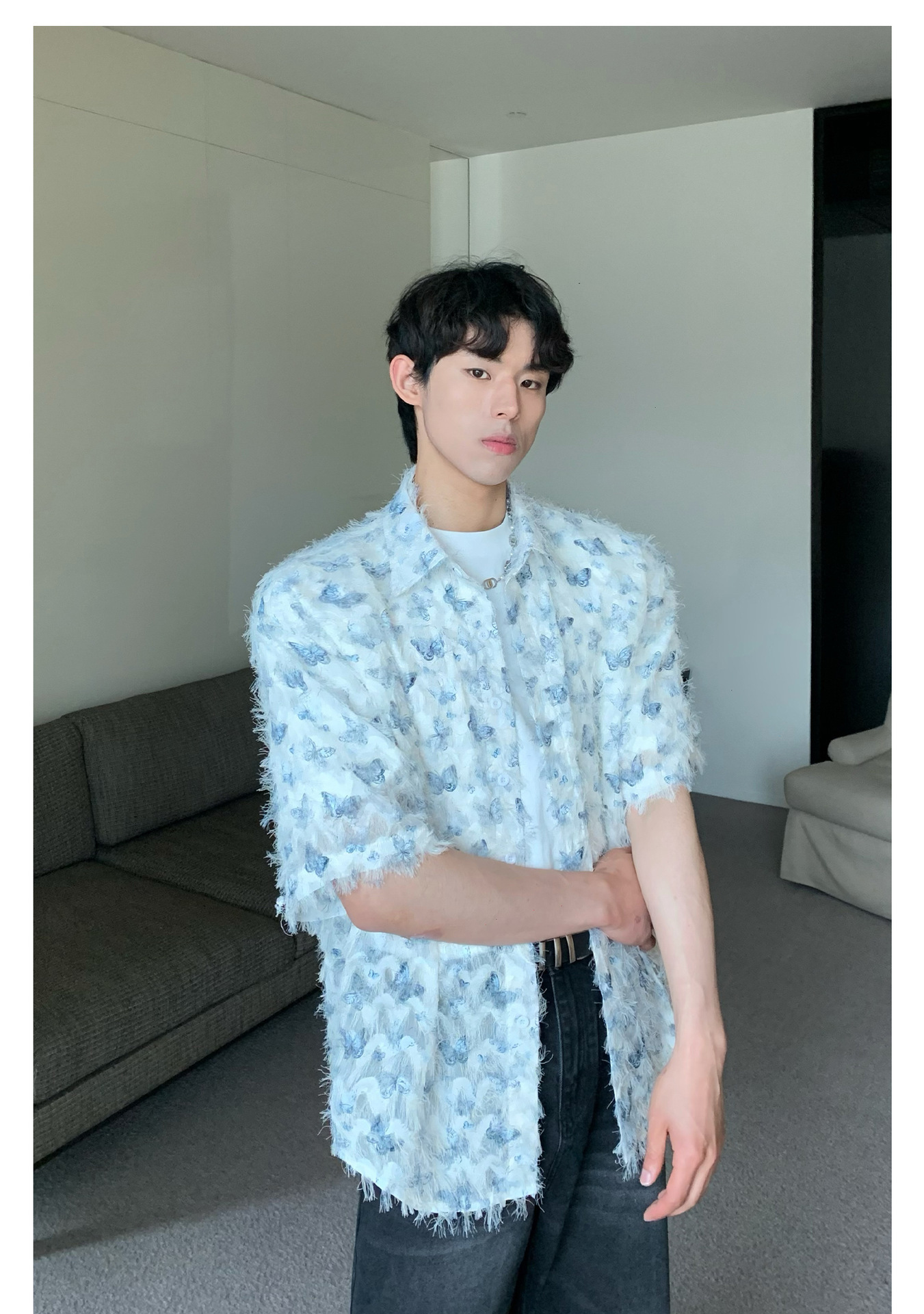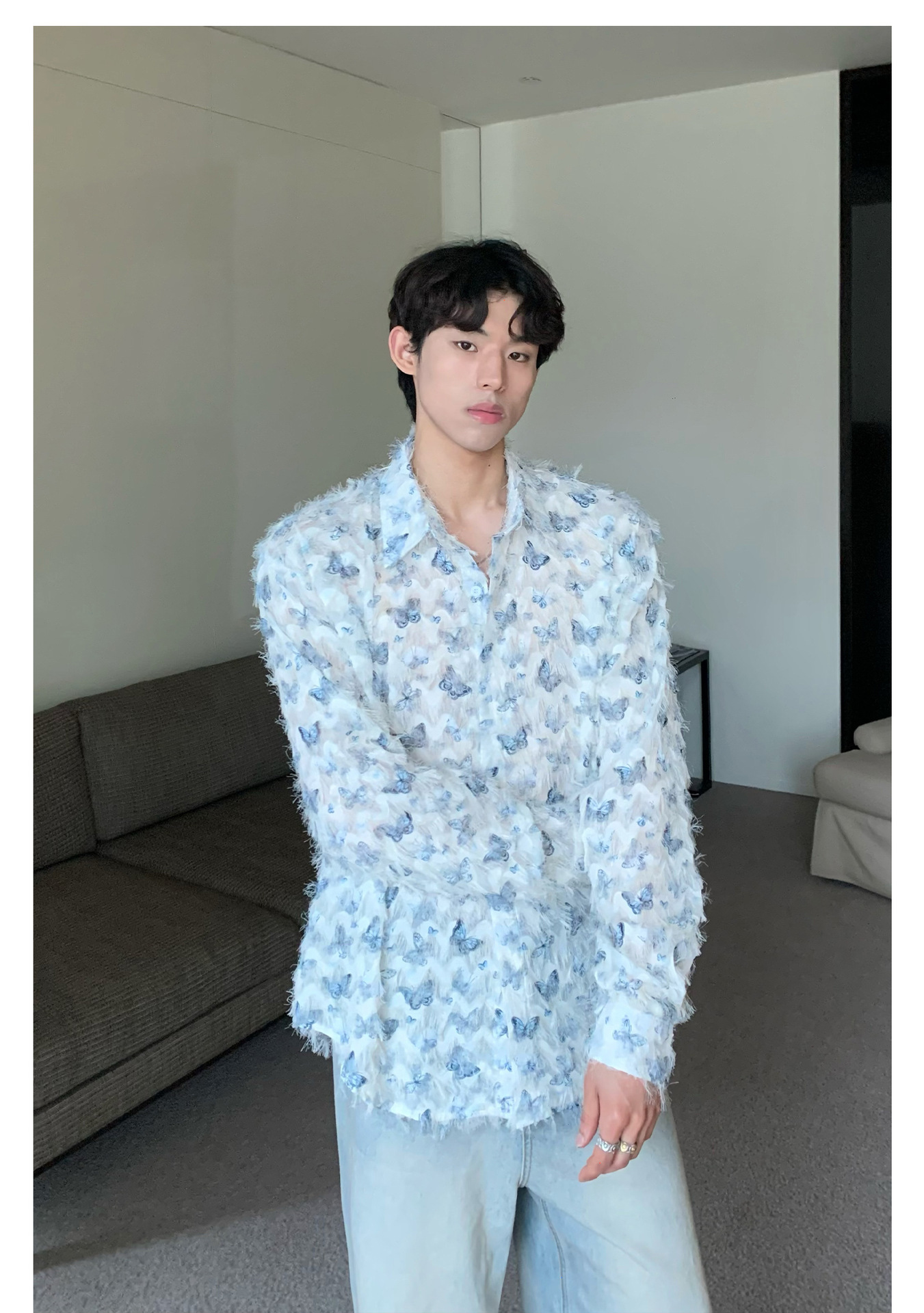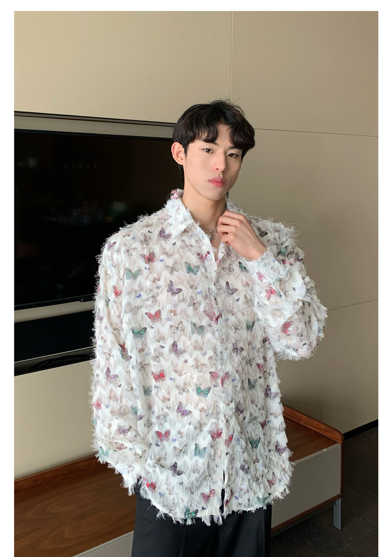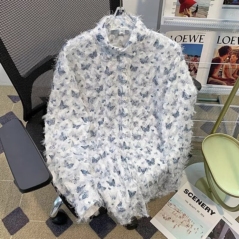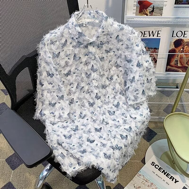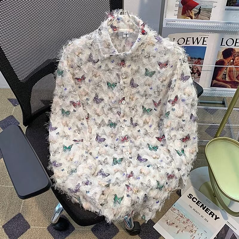 美式小众蝴蝶毛边流苏设计衬衫 原创设计立体流苏衬衣男