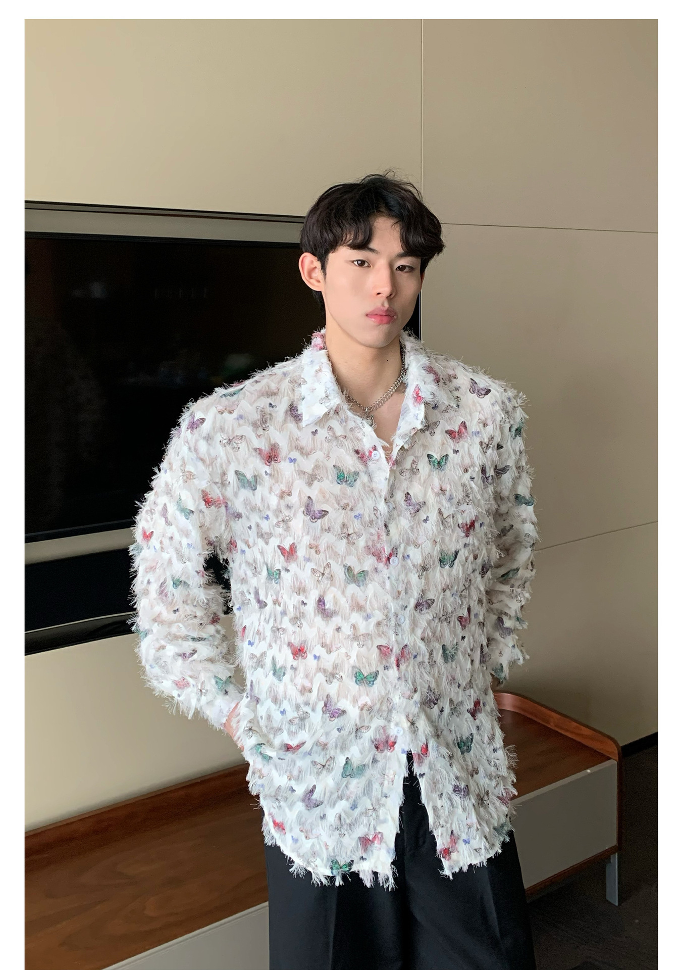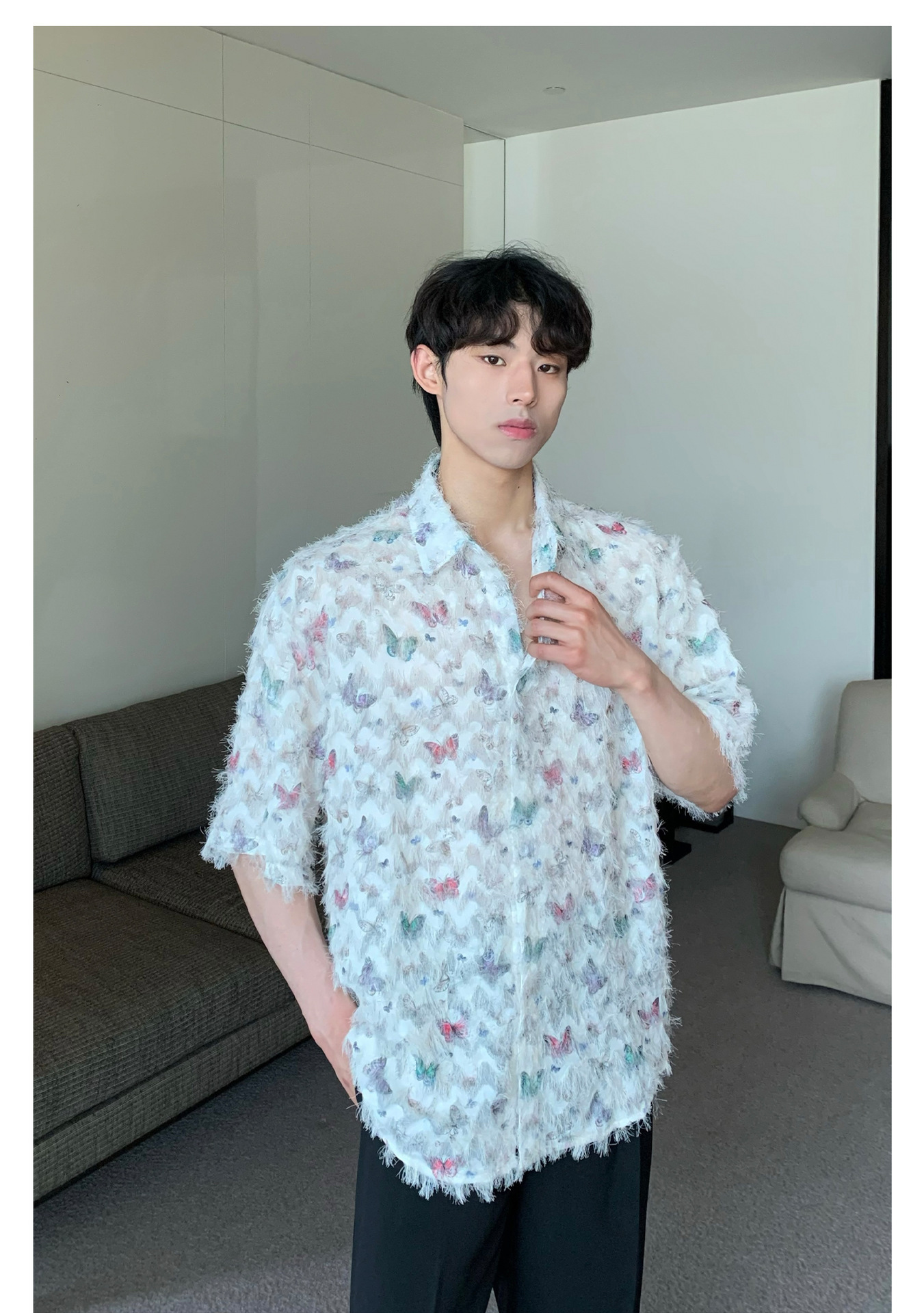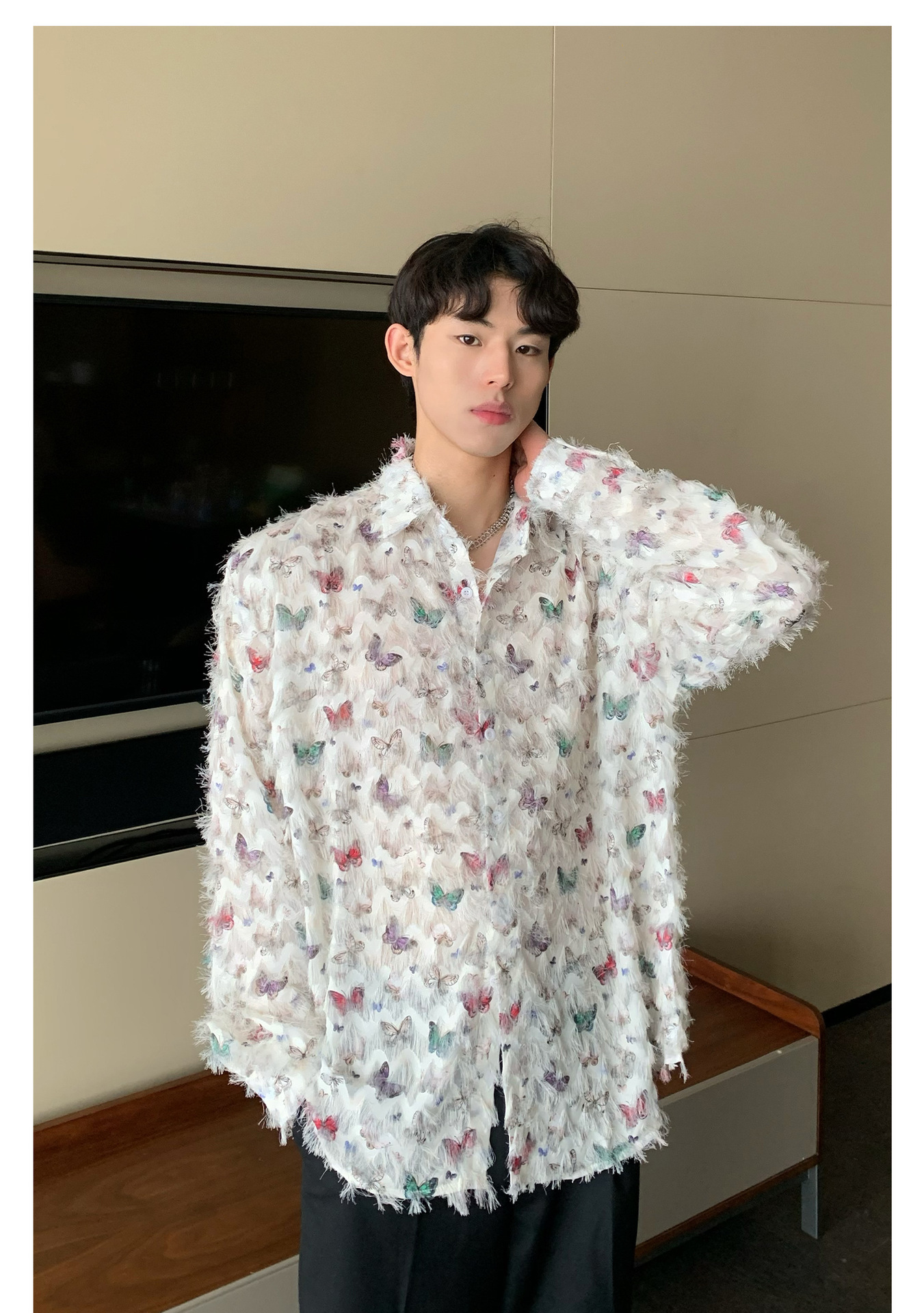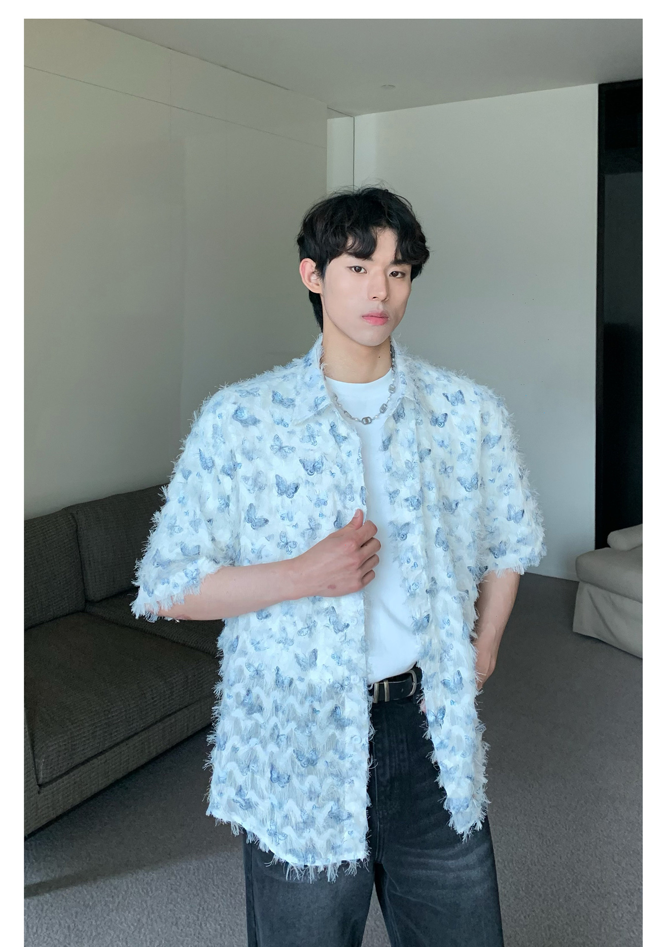 美式小众蝴蝶毛边流苏设计衬衫 原创设计立体流苏衬衣男
