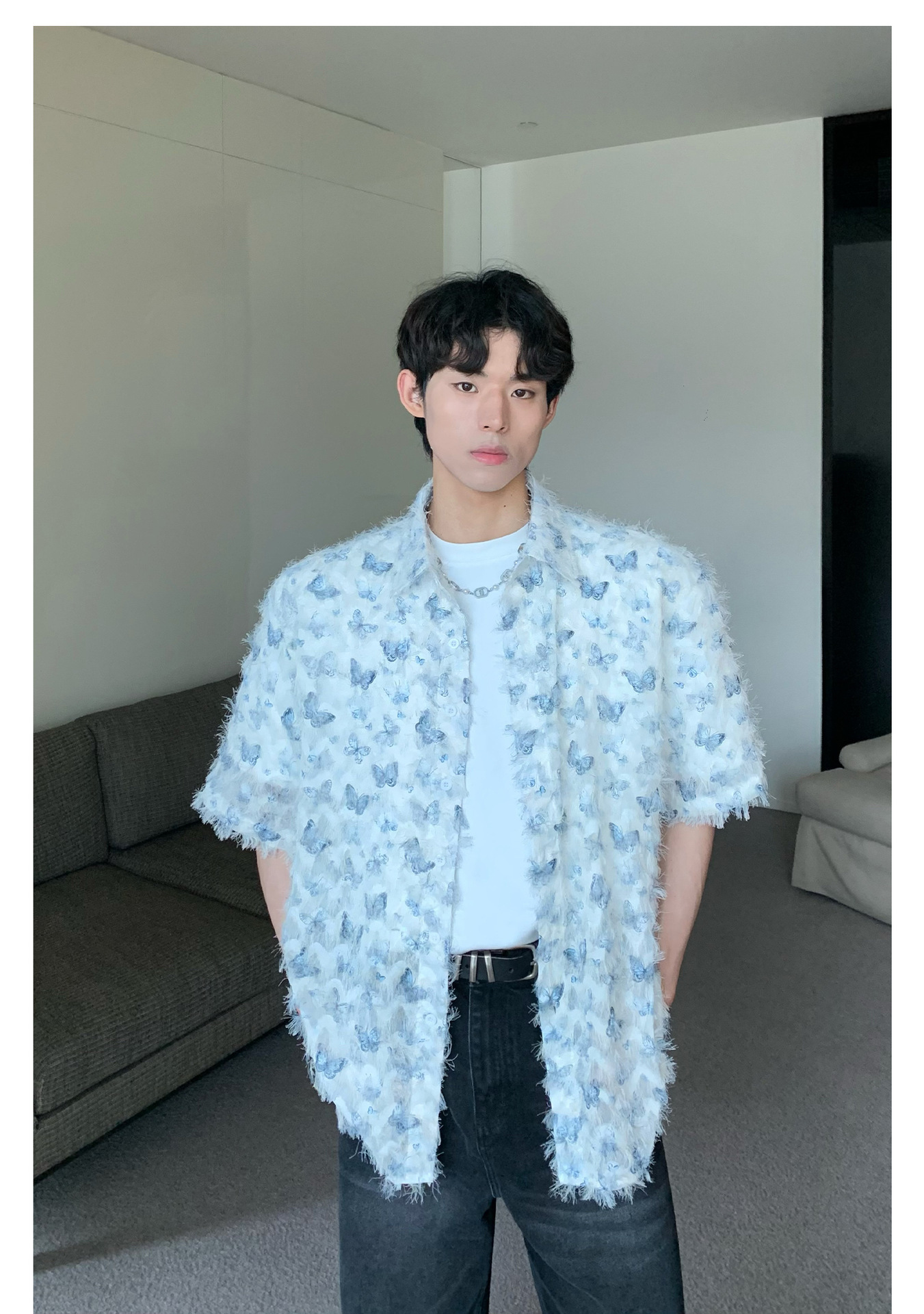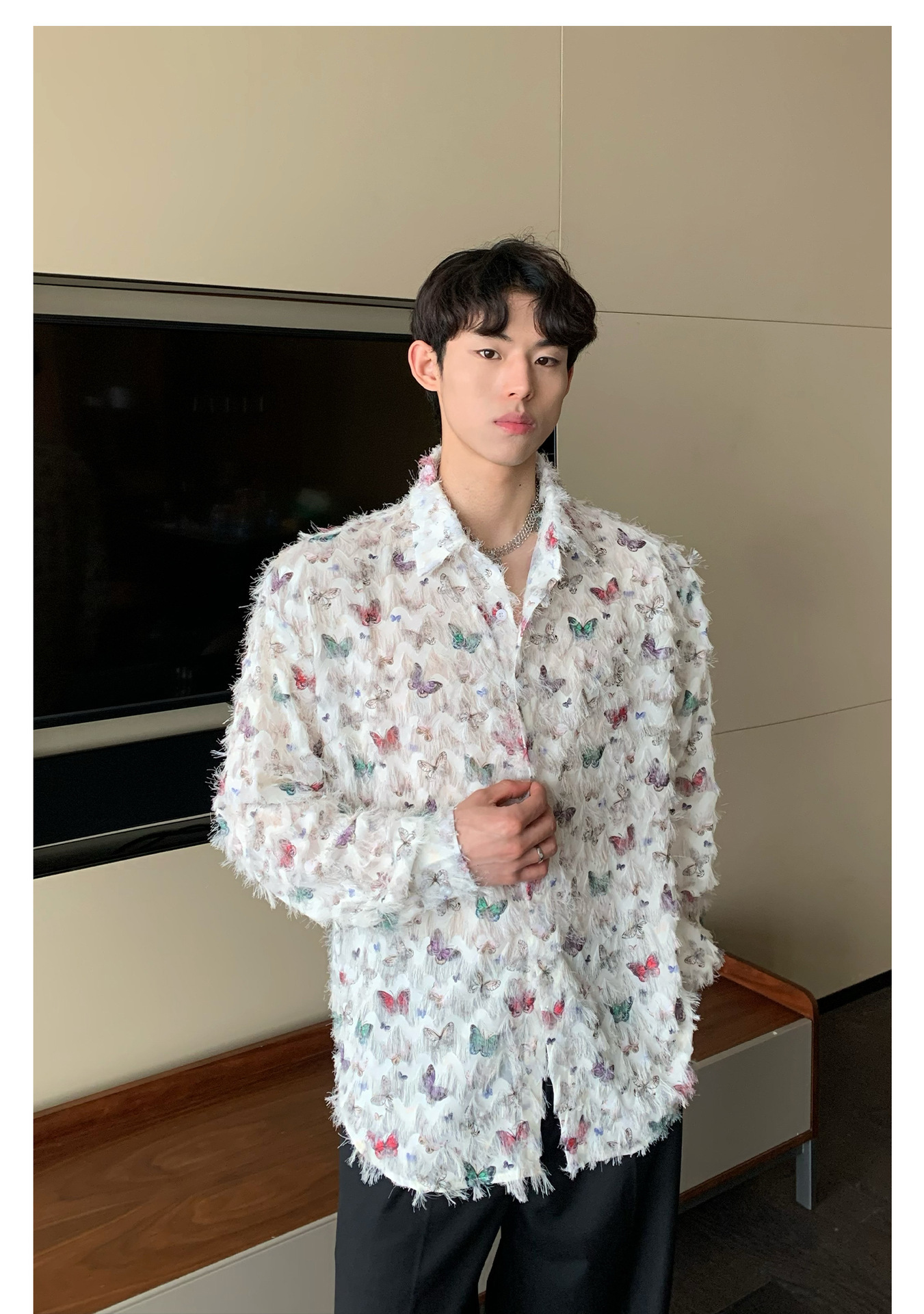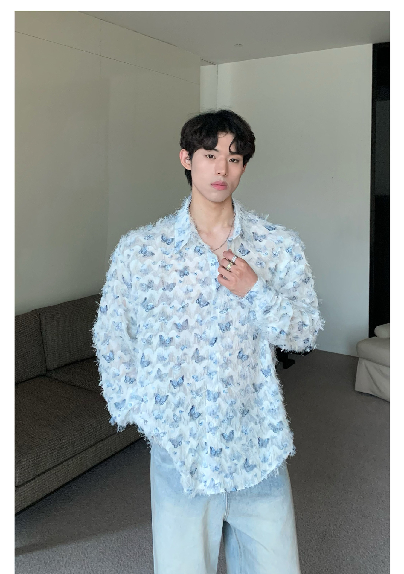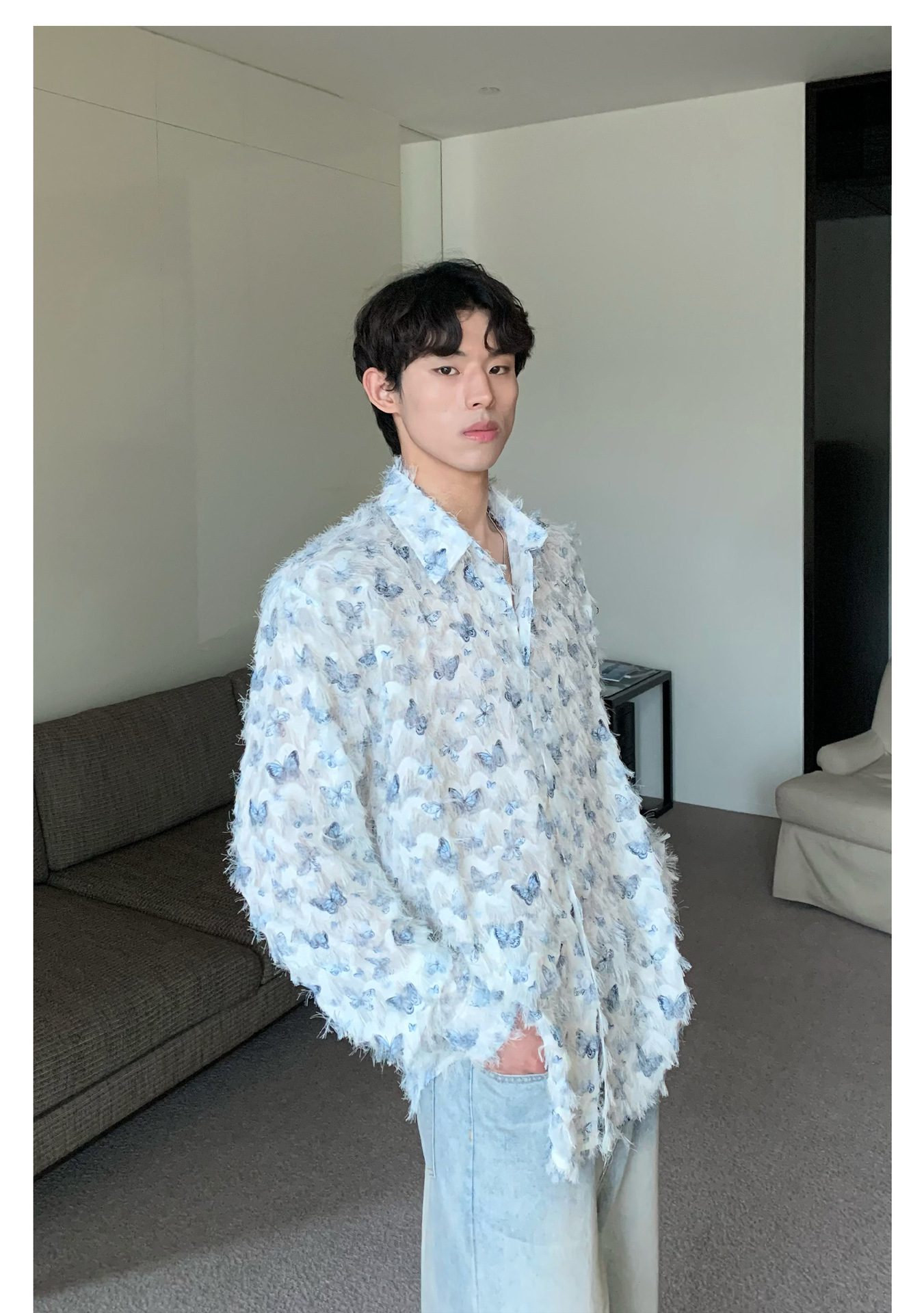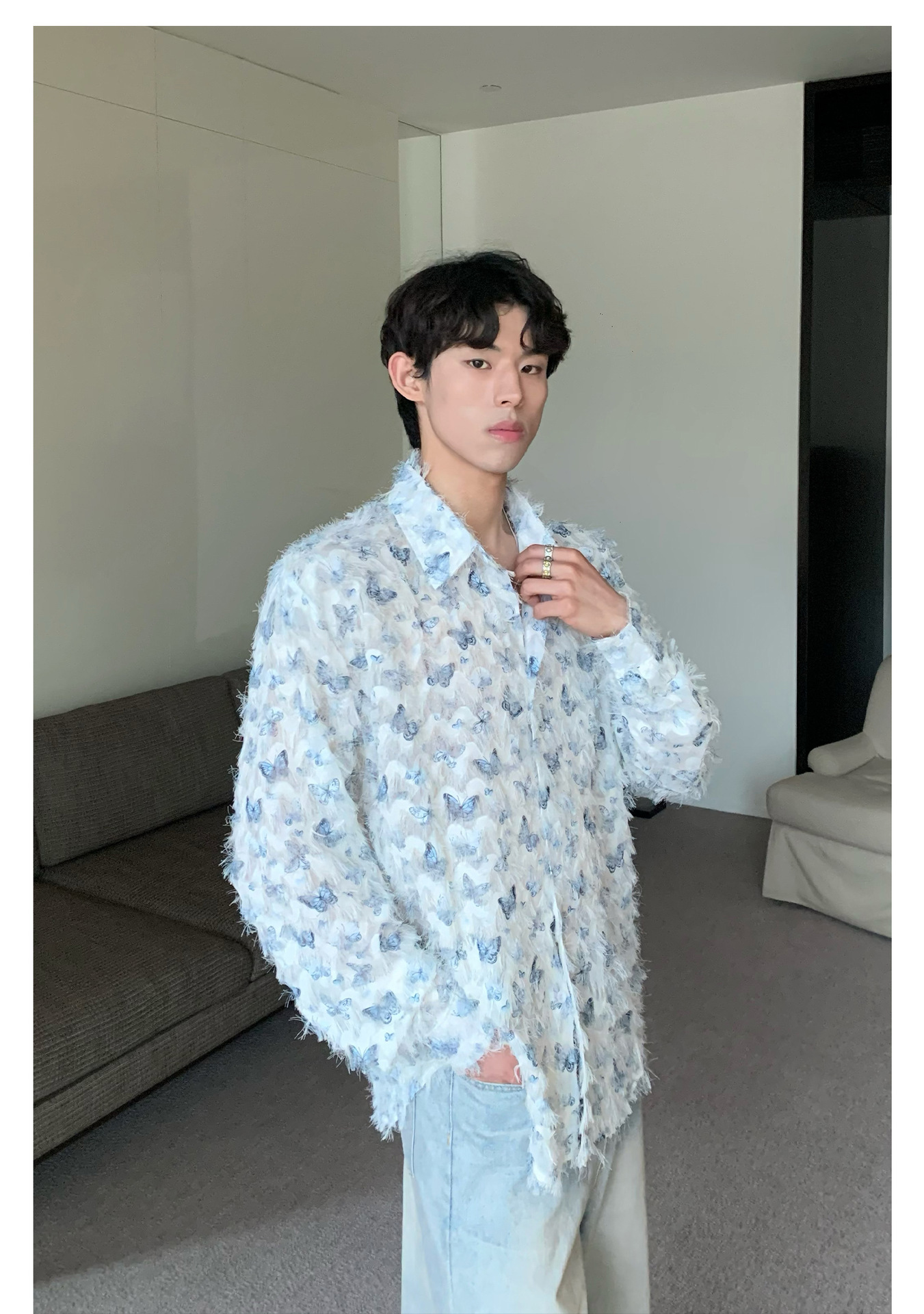 美式小众蝴蝶毛边流苏设计衬衫 原创设计立体流苏衬衣男