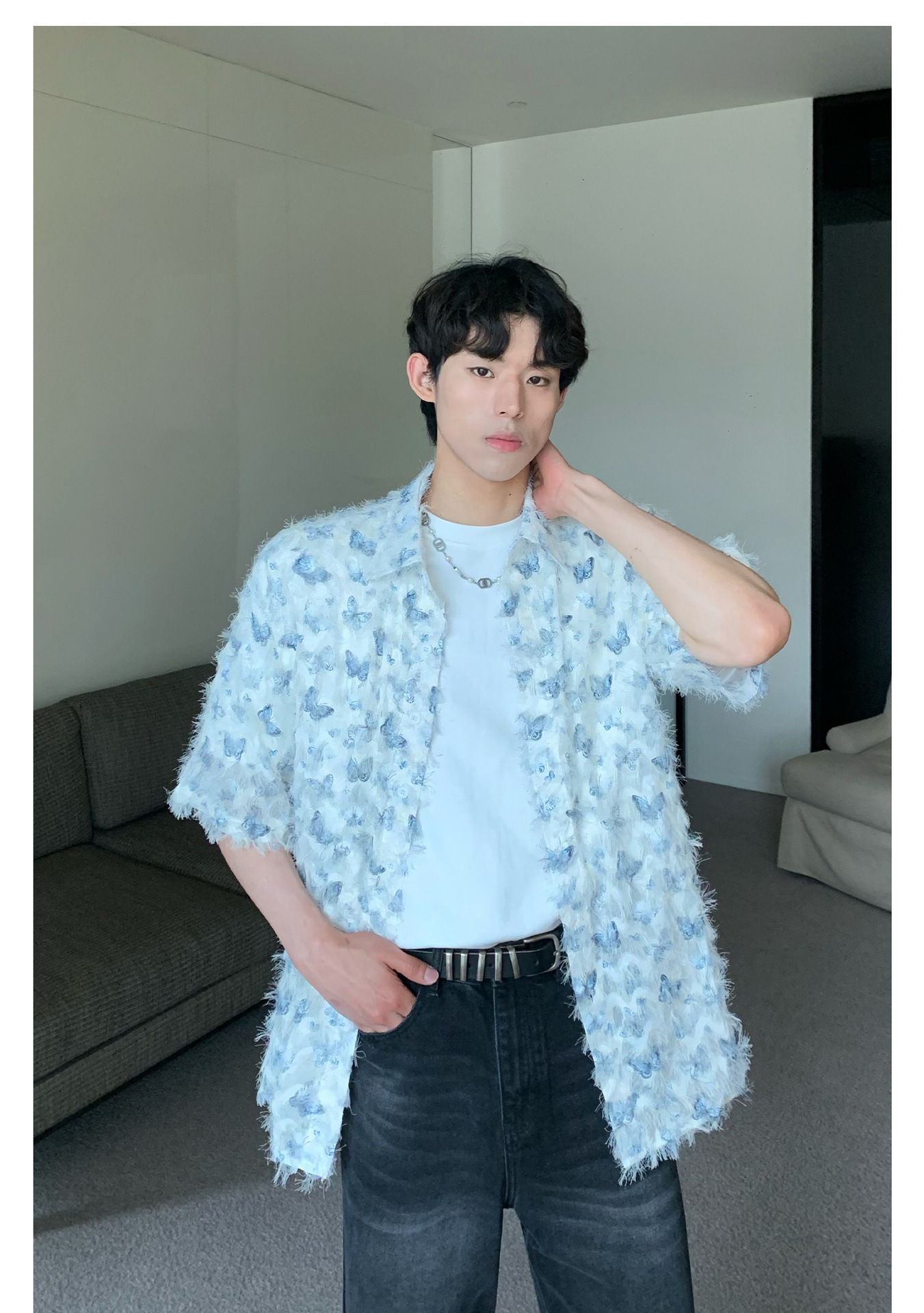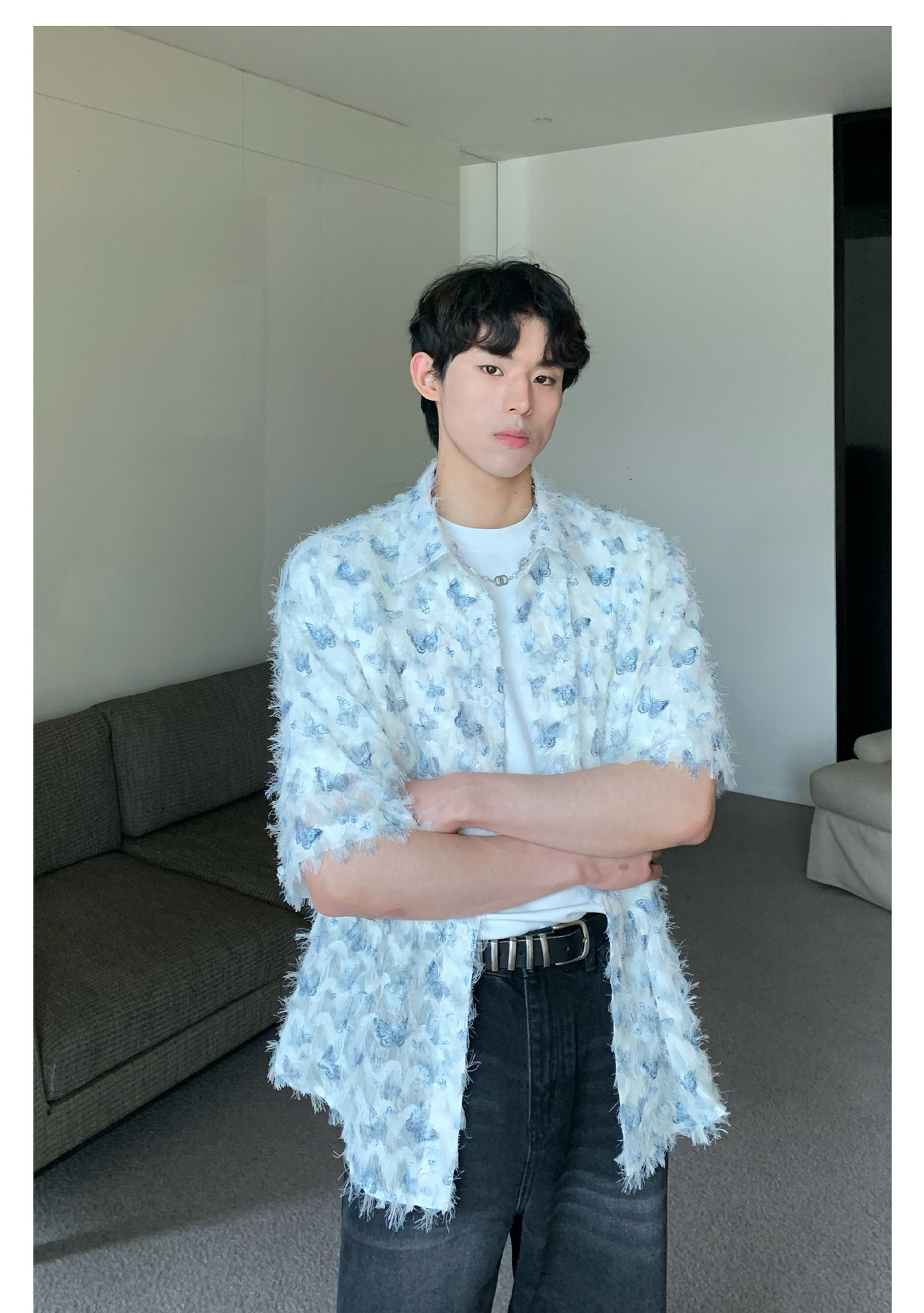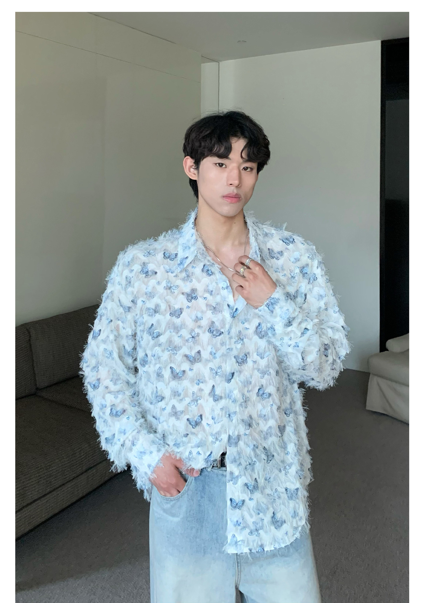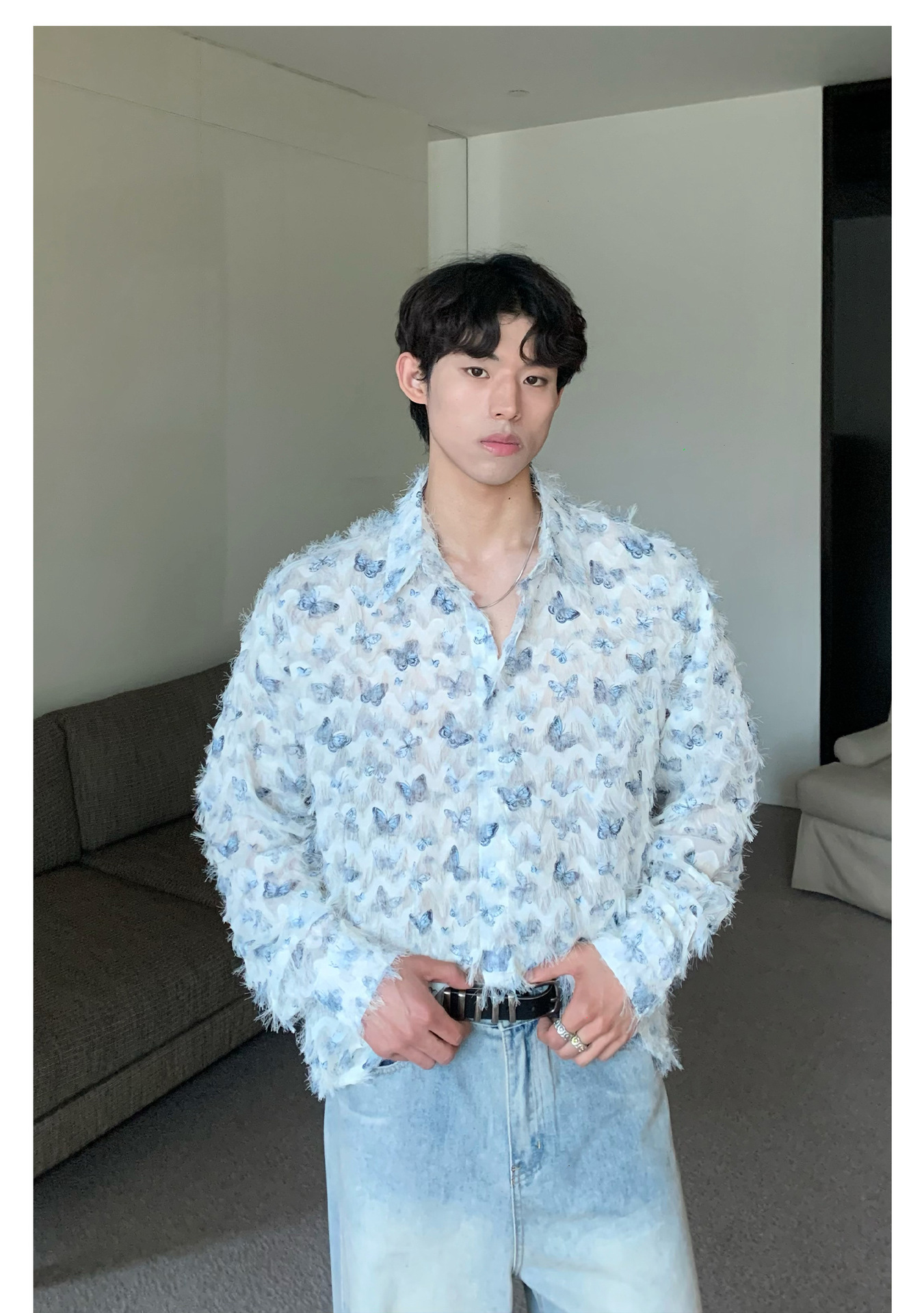 美式小众蝴蝶毛边流苏设计衬衫 原创设计立体流苏衬衣男