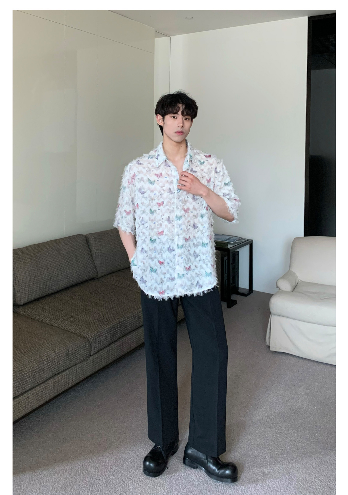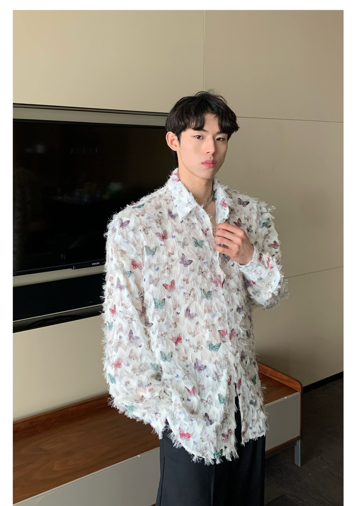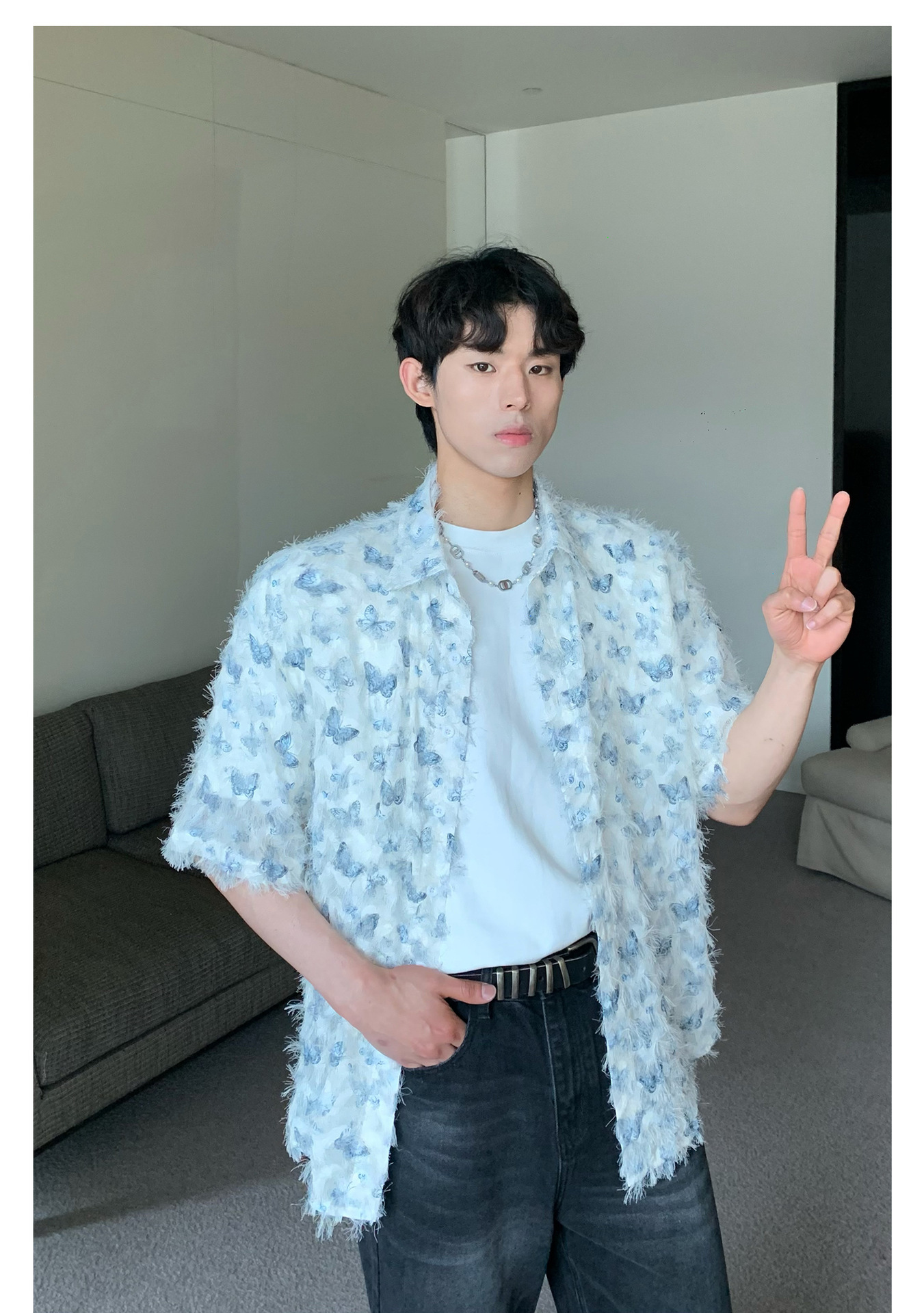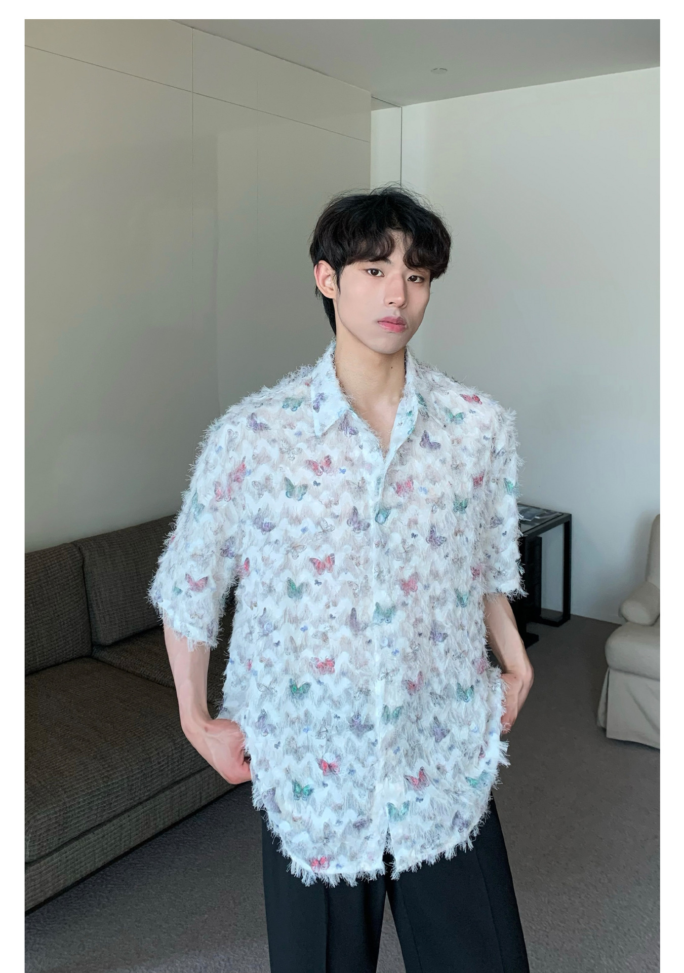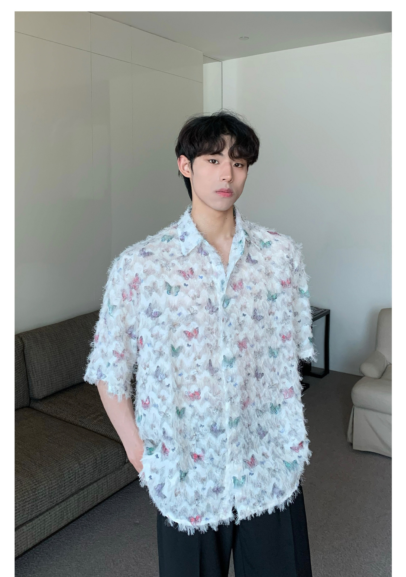 美式小众蝴蝶毛边流苏设计衬衫 原创设计立体流苏衬衣男