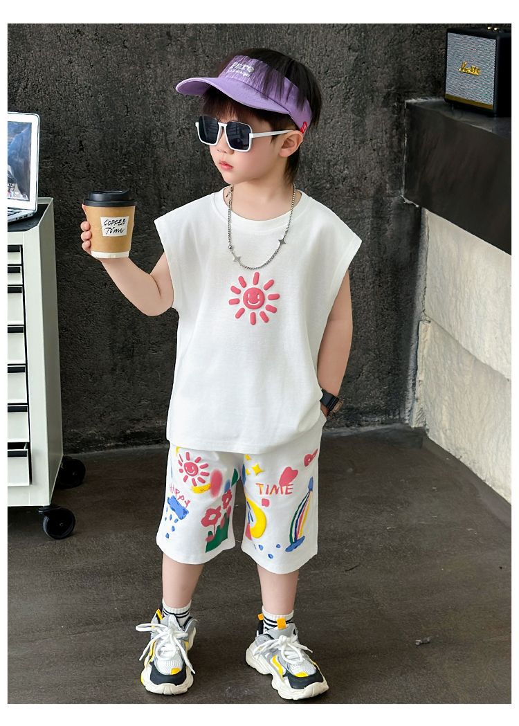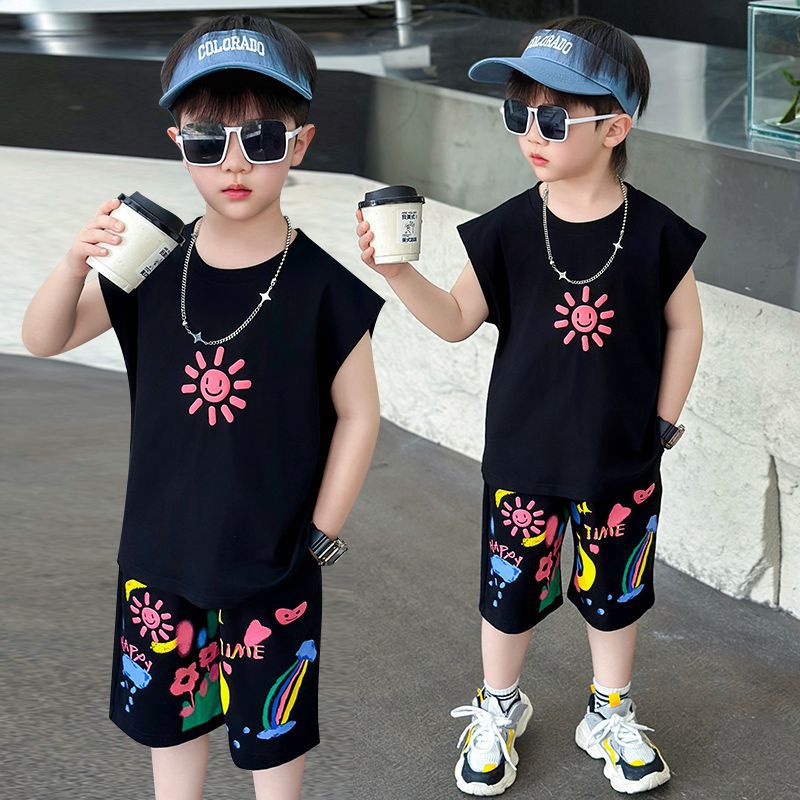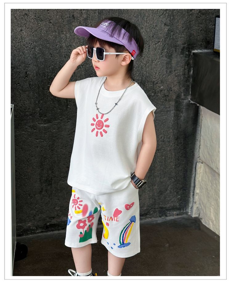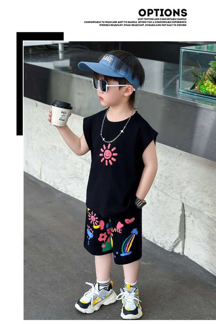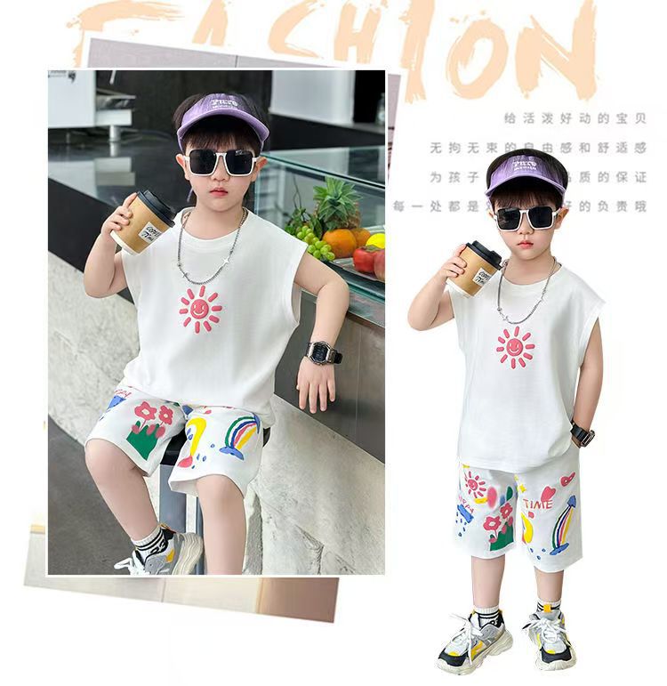 대외 무역 여름 소년 조끼 세트 조수 팬 어린이 의류 도매 2025 새로운 아기 옷 어린이 민소매 여름 의류스토어 가기