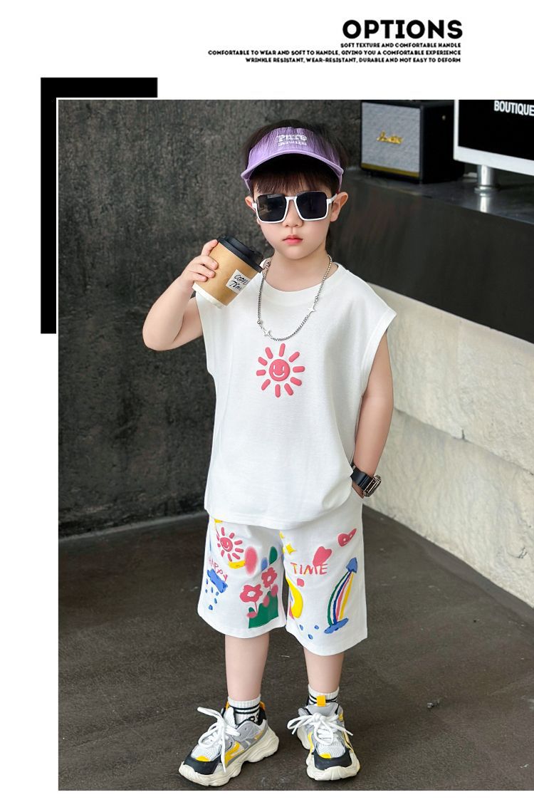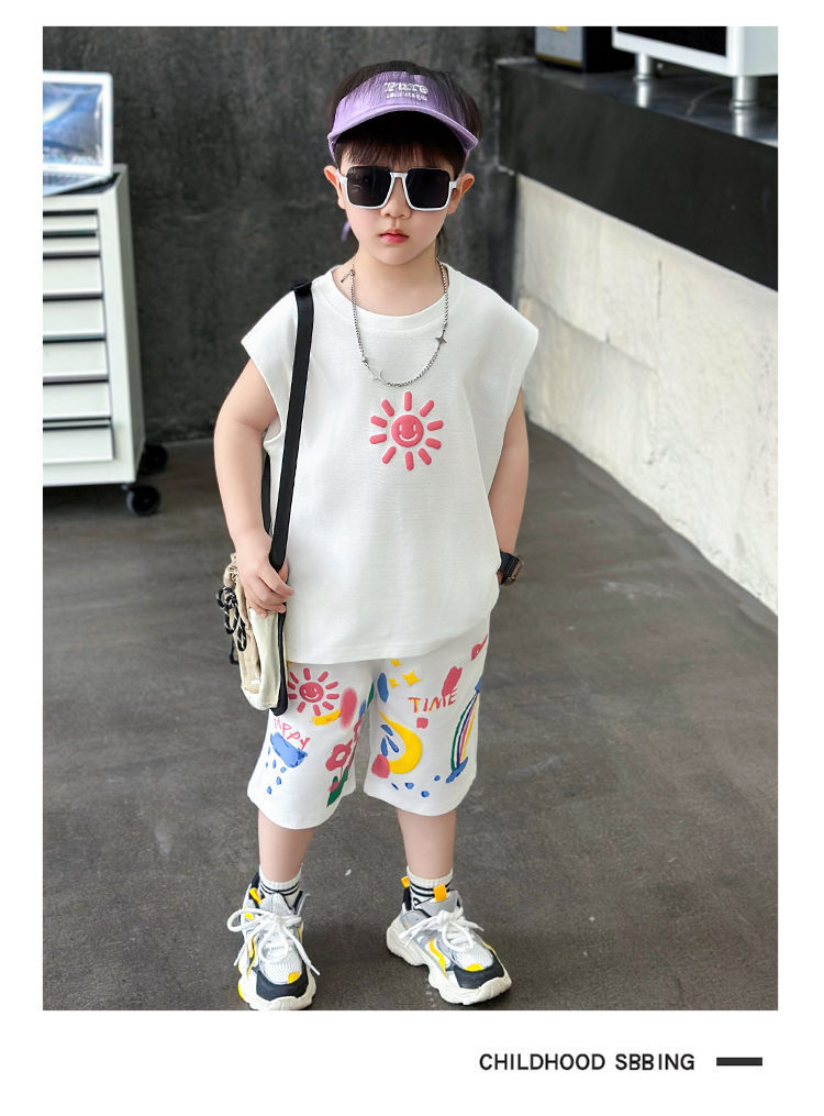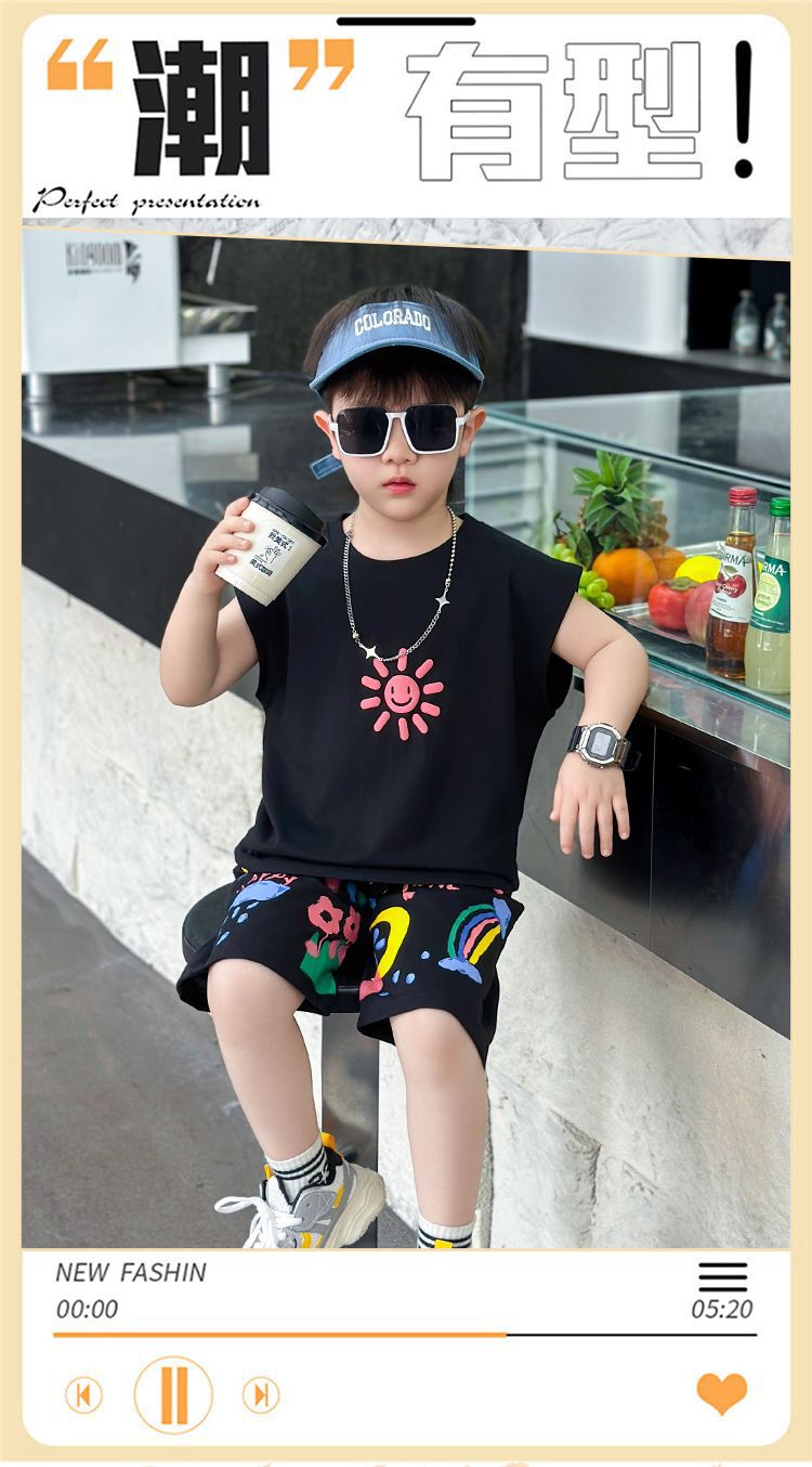 대외 무역 여름 소년 조끼 세트 조수 팬 어린이 의류 도매 2025 새로운 아기 옷 어린이 민소매 여름 의류