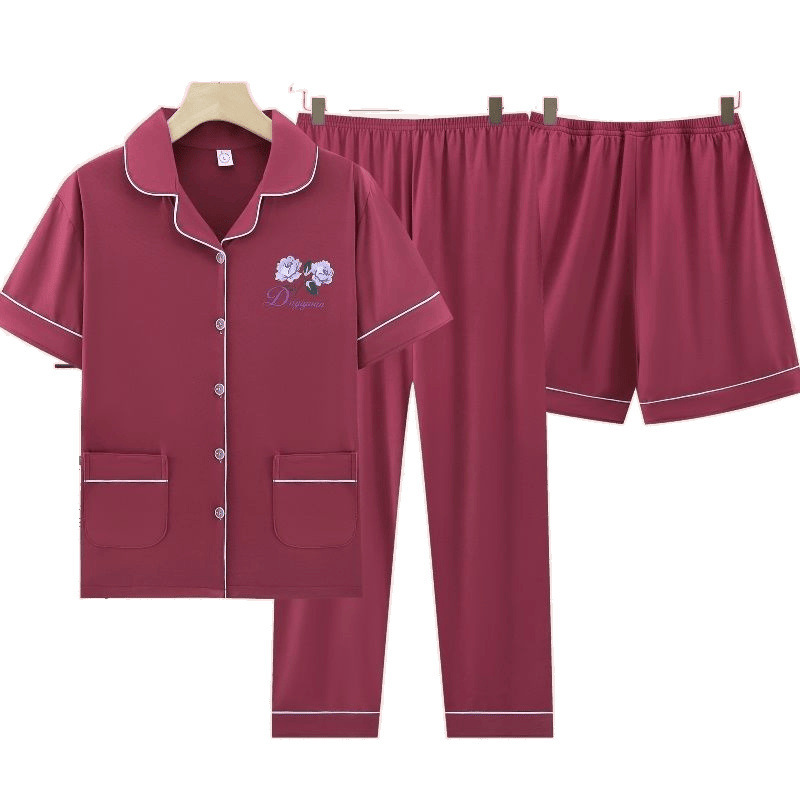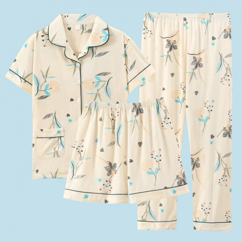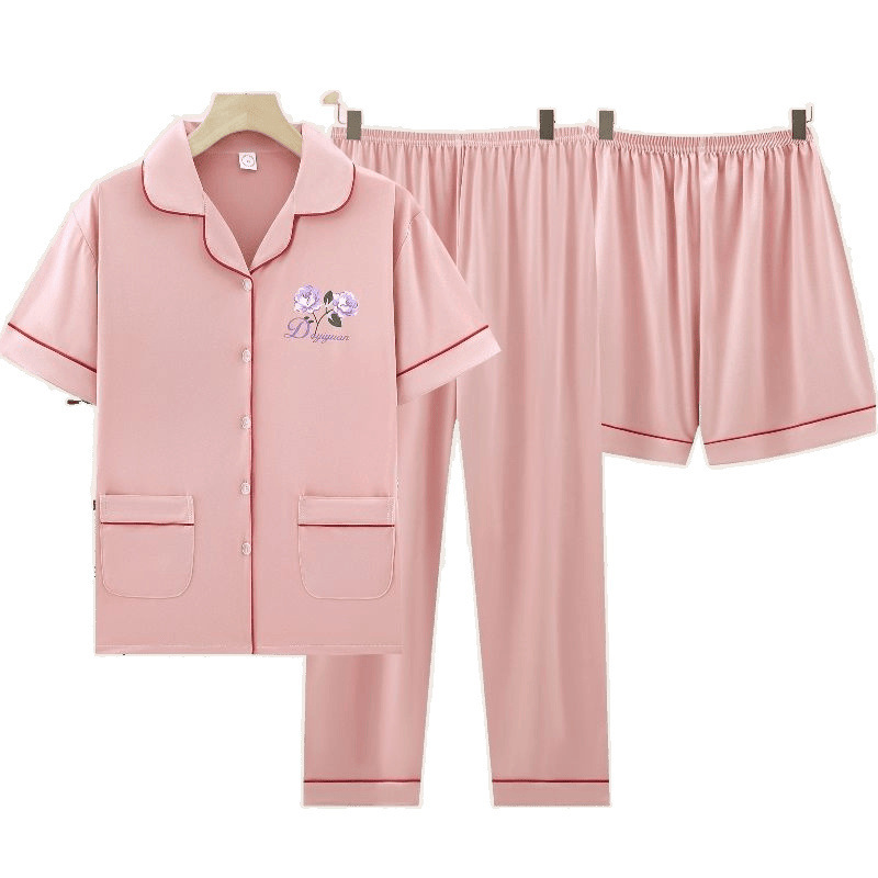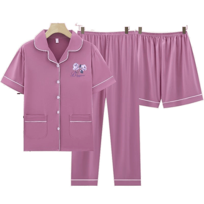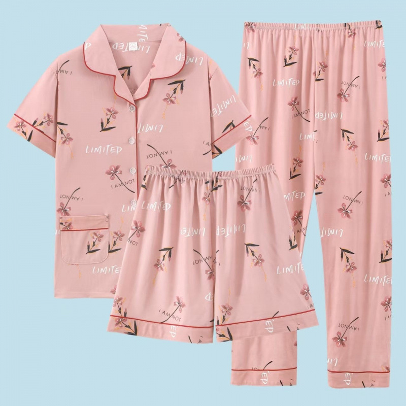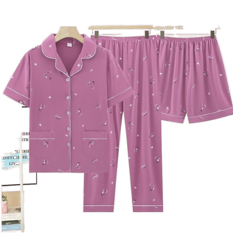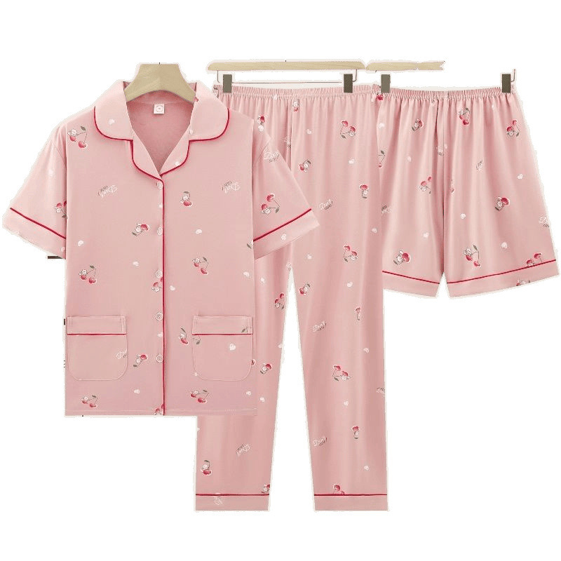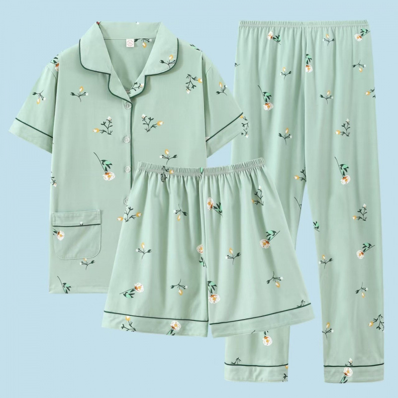 잠옷 여성 여름 100 면 얇은 반팔 반바지 바지 가디건 플러스 사이즈 홈 의류 면 3 종 세트