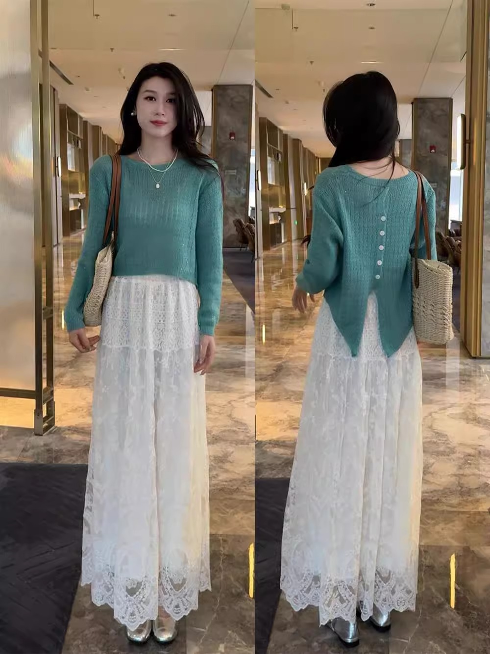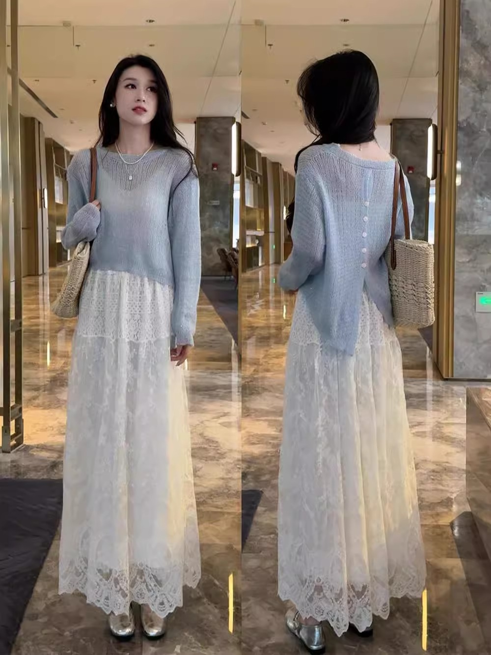 백 버튼 디자인 센스 밝은 실크 긴팔 블라우스 탑 레이스 스커트 투피스 세트 여성의 여름 새 세트