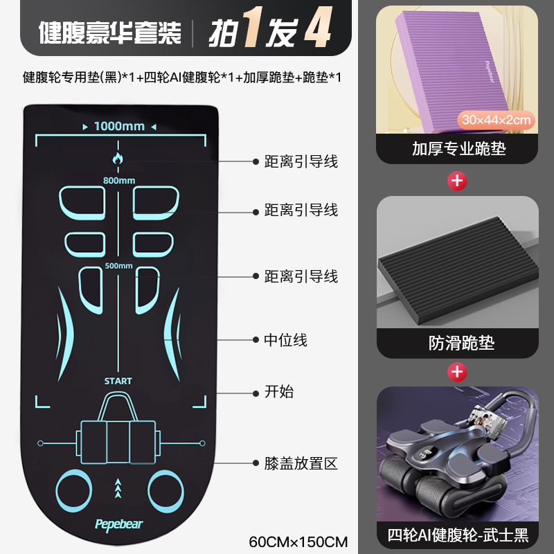• [조끼라인 트레이닝/뱃살 빼기 4종 세트] 4륜 복부 휠 - 사무라이 블랙 + 복부 휠 전용 패드 - 핑크 + 두꺼운 대형 무릎 패드 / 무료 미끄럼 방지 무릎 패드