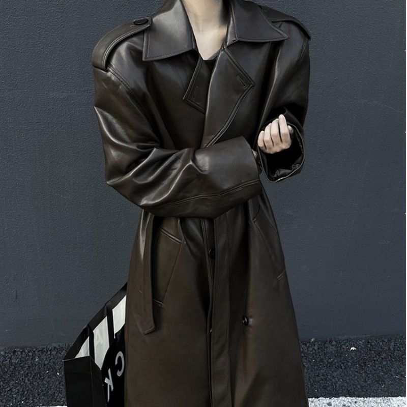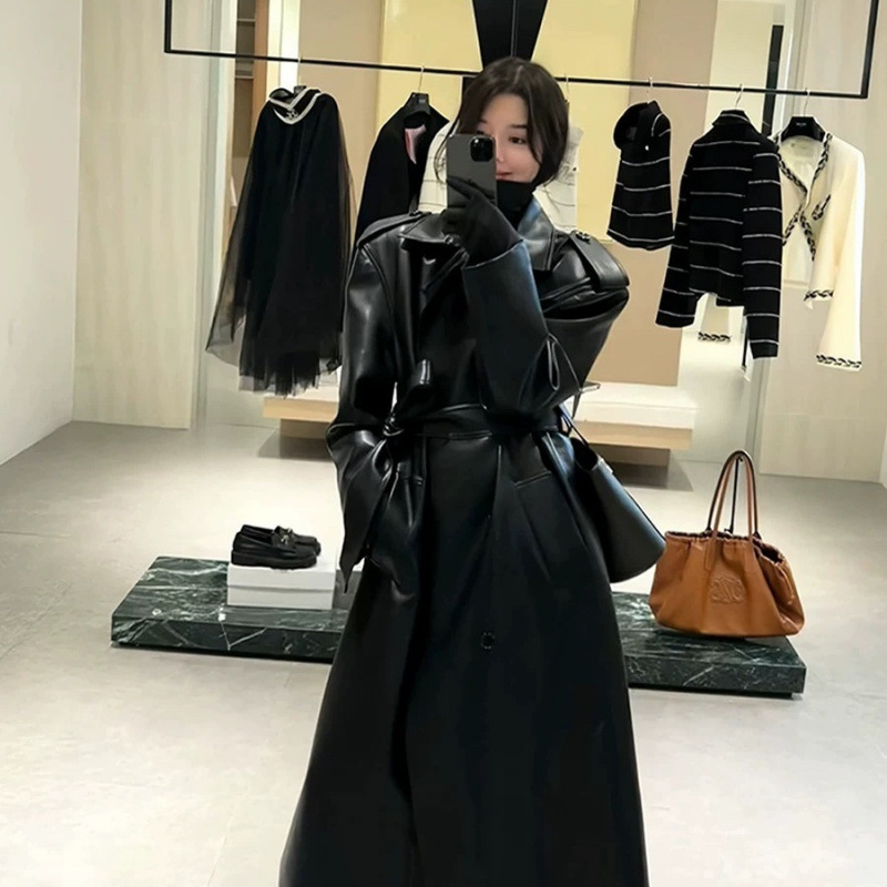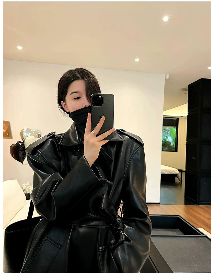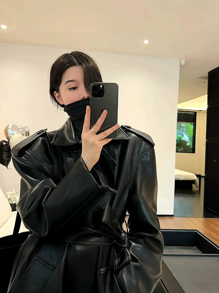 여성을 위한 고급 가죽 자켓 2025 가을 겨울 세련된 기질 라펠 레이스 업 허리 중간 길이 가죽 자켓 코트