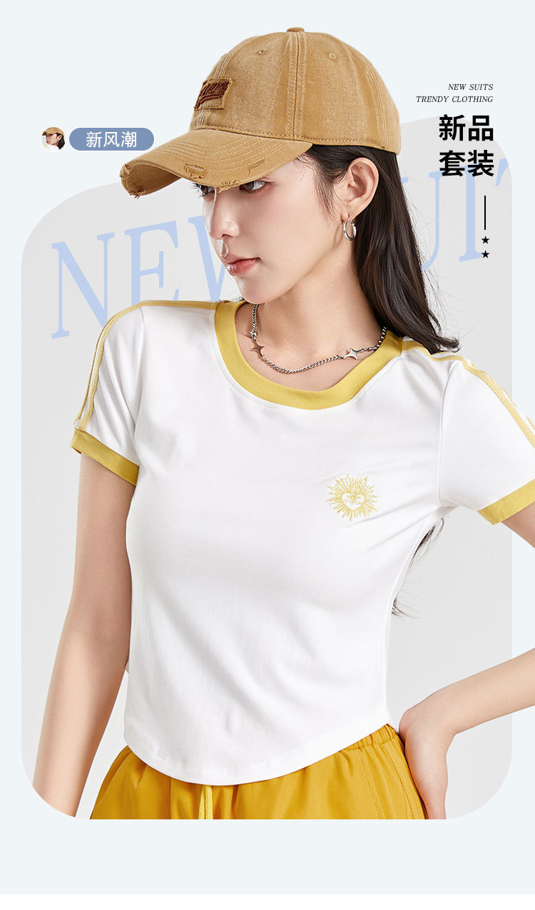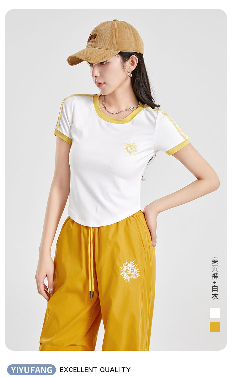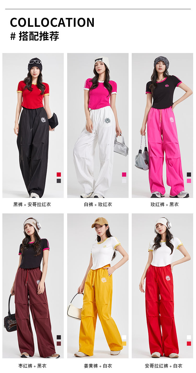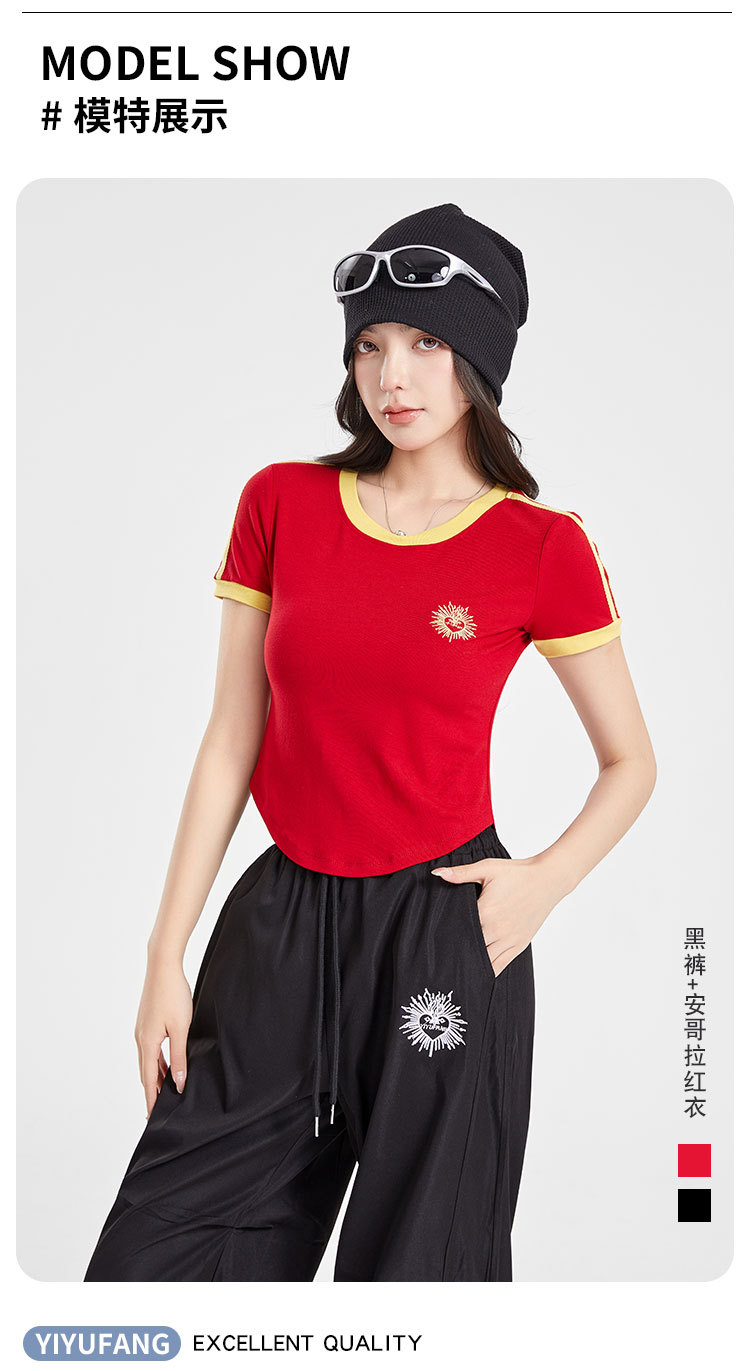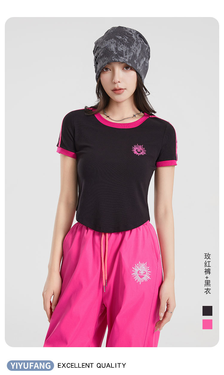 (쿨 실크 코튼) 아메리칸 스타일 숏 컬러블록 라운드넥 티셔츠 스트리트 댄스 트렌디 브랜드 낙하산부대 스포츠 캐주얼 세트 YM2515