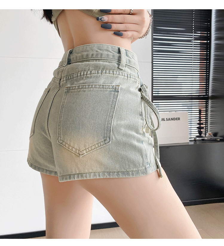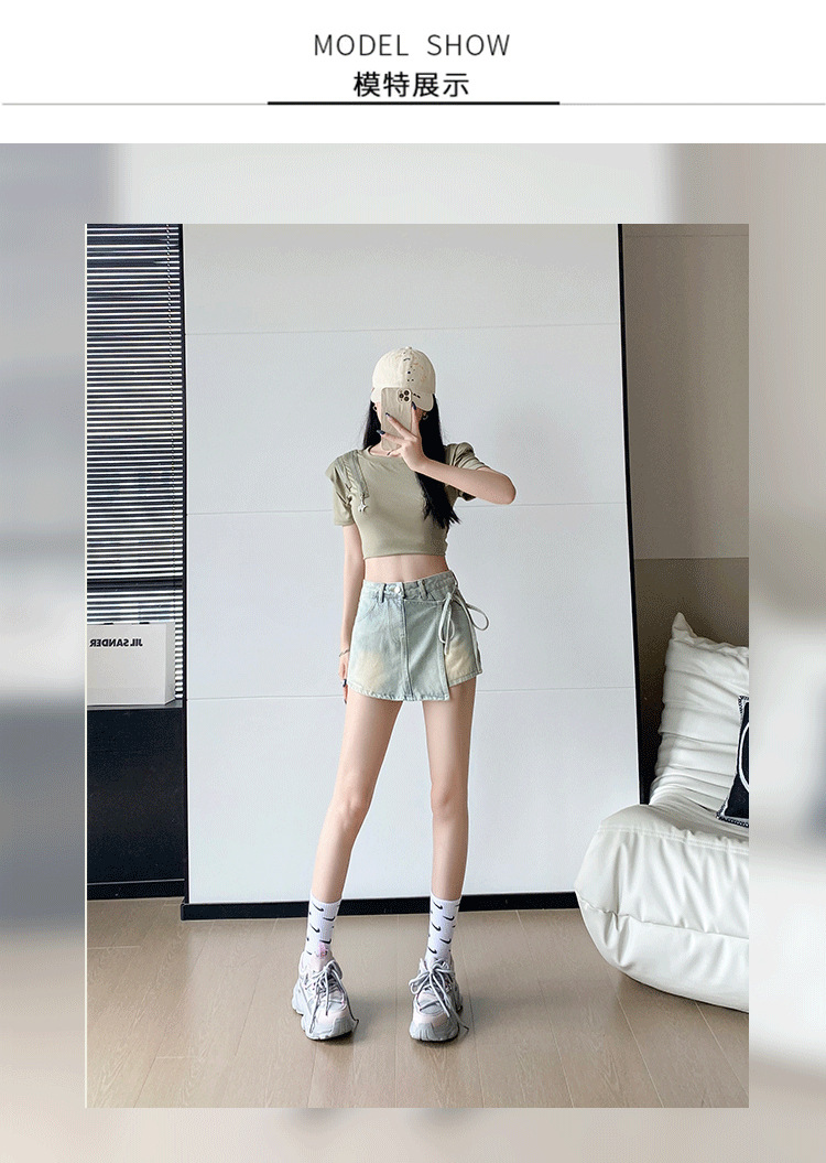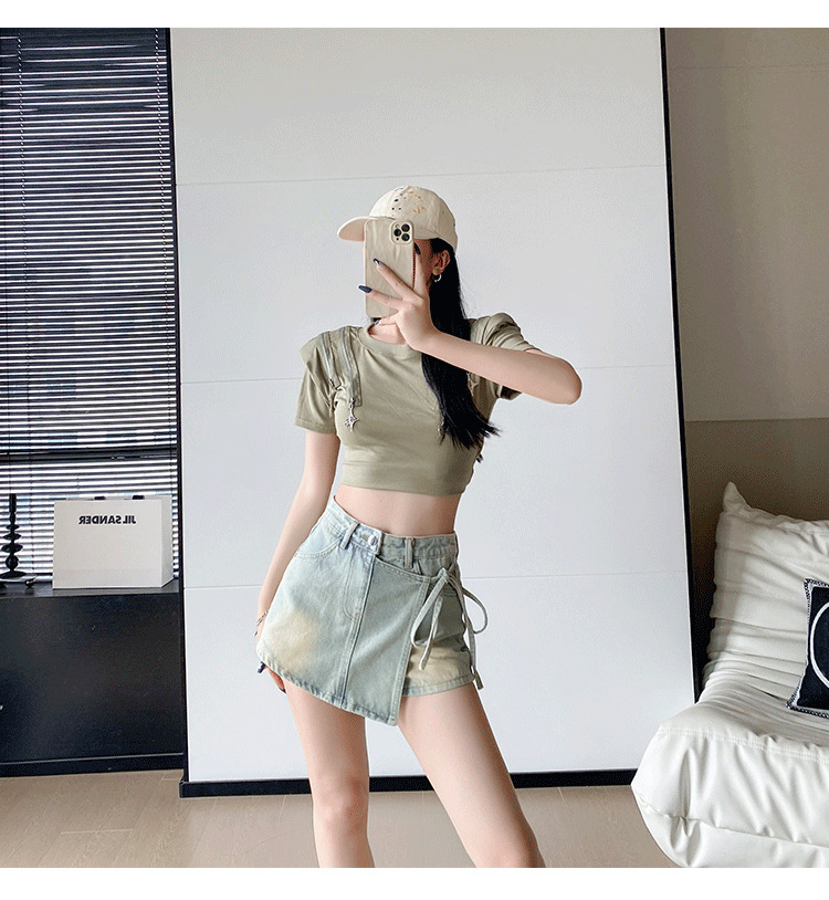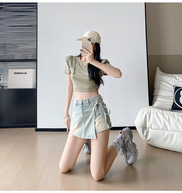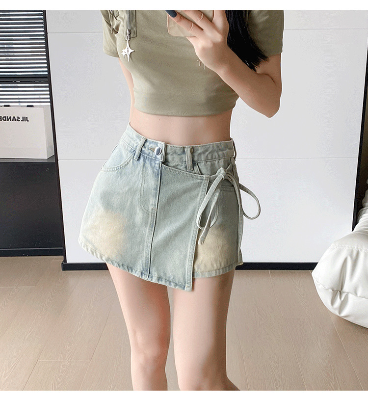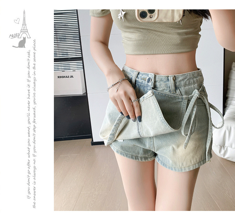 가짜 투피스 데님 반바지 여자 2024 년 여름 새로운 도착 불규칙한 서양식 스트랩 컬로 테스 작은 뜨거운 소녀 바지스토어 가기