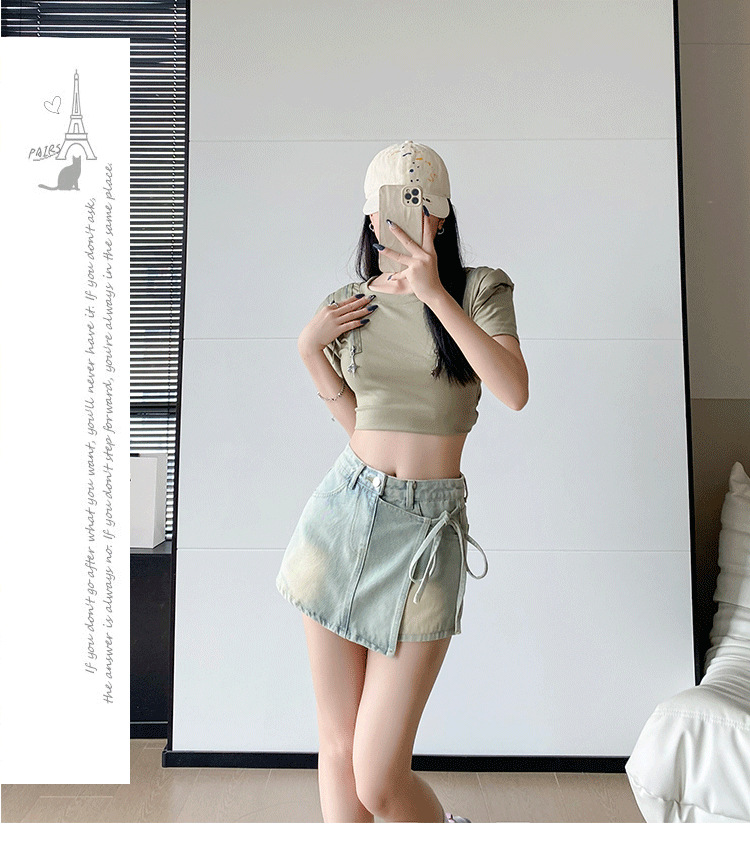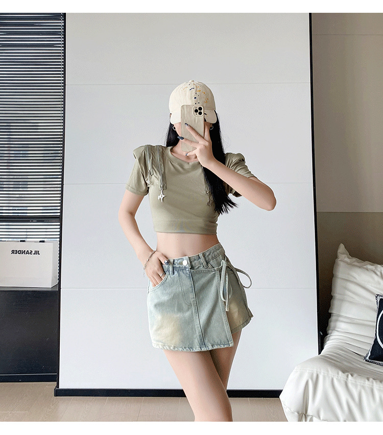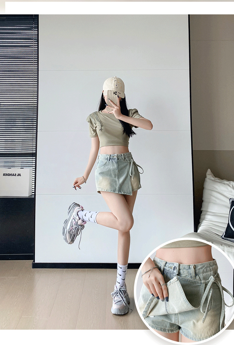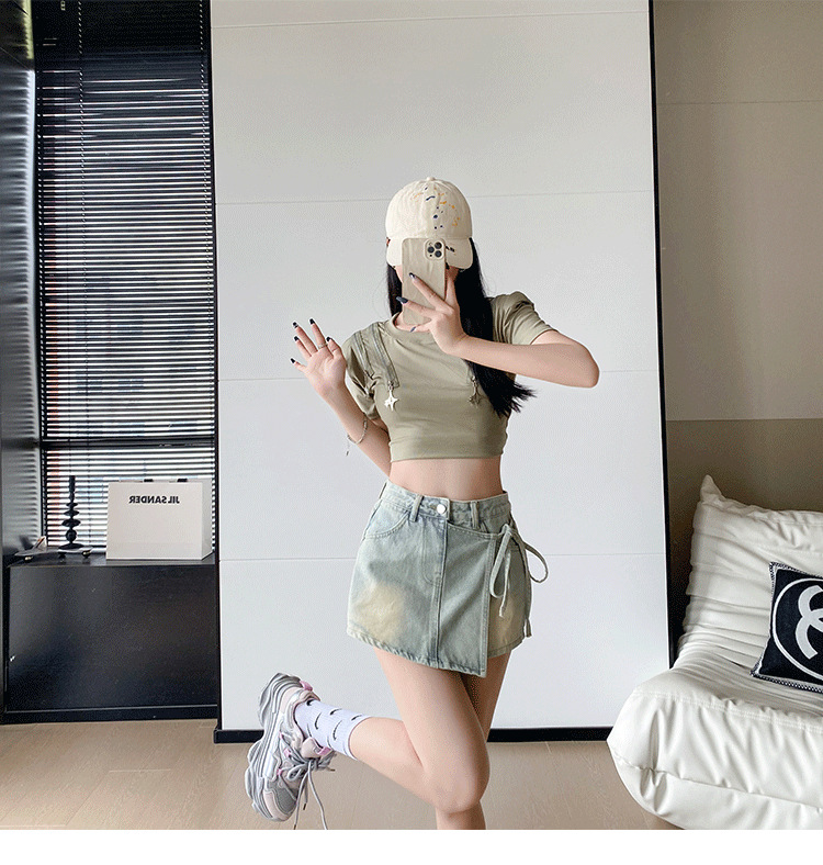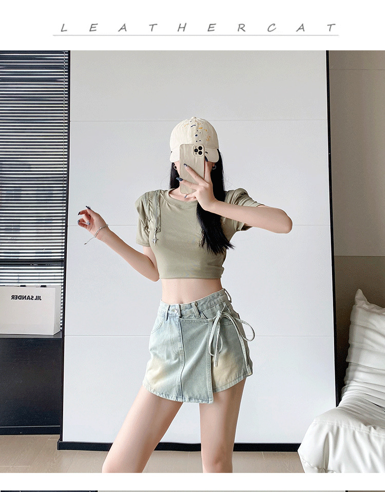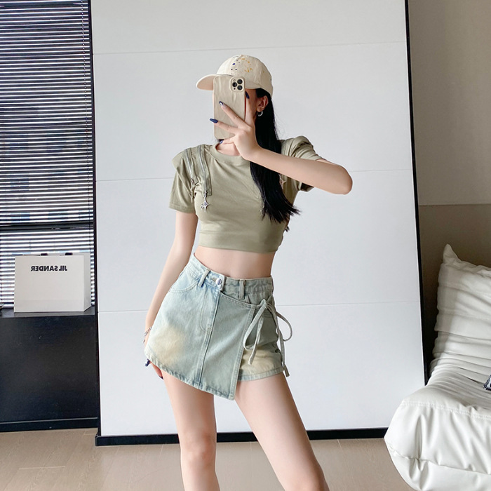 가짜 투피스 데님 반바지 여자 2024 년 여름 새로운 도착 불규칙한 서양식 스트랩 컬로 테스 작은 뜨거운 소녀 바지스토어 가기