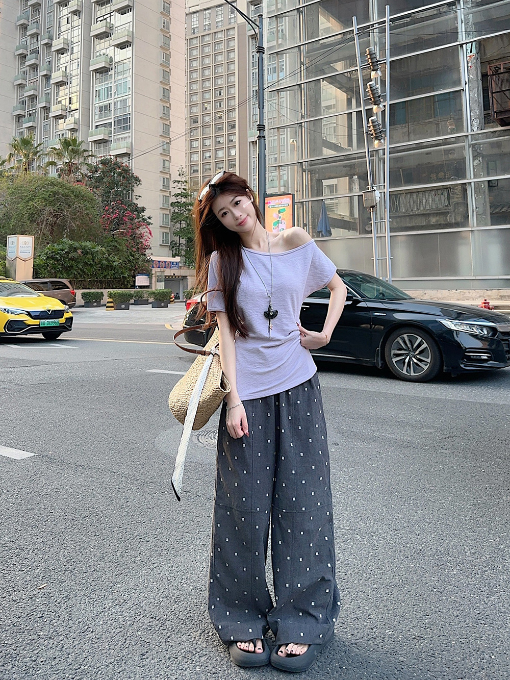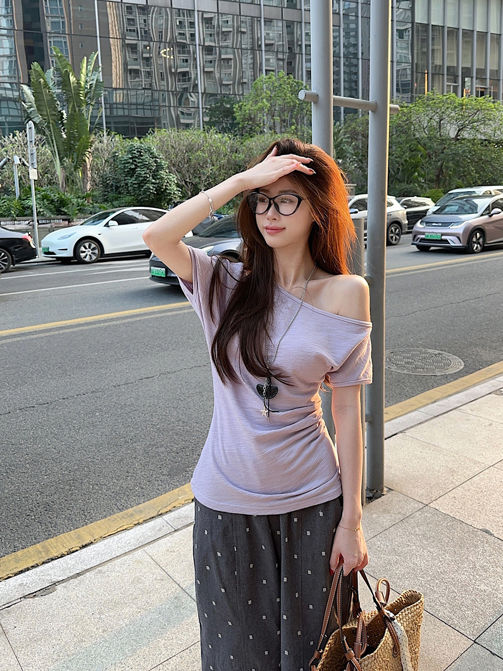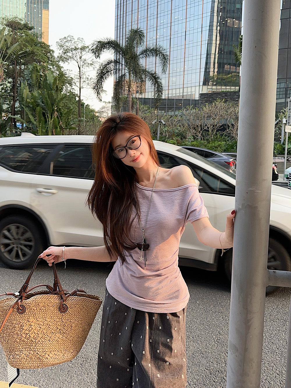 Zhenhongqing 홈 메이드 여름 어깨 칼라 슬리밍 반팔 티셔츠 여성용 텍스처 탑
