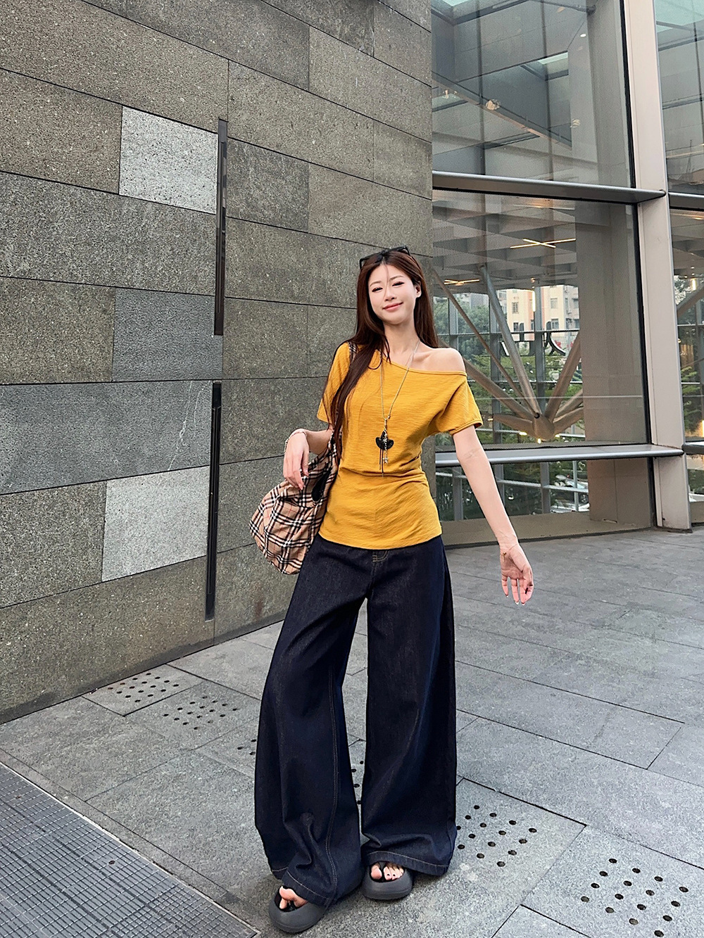 Zhenhongqing 홈 메이드 여름 어깨 칼라 슬리밍 반팔 티셔츠 여성용 텍스처 탑스토어 가기
