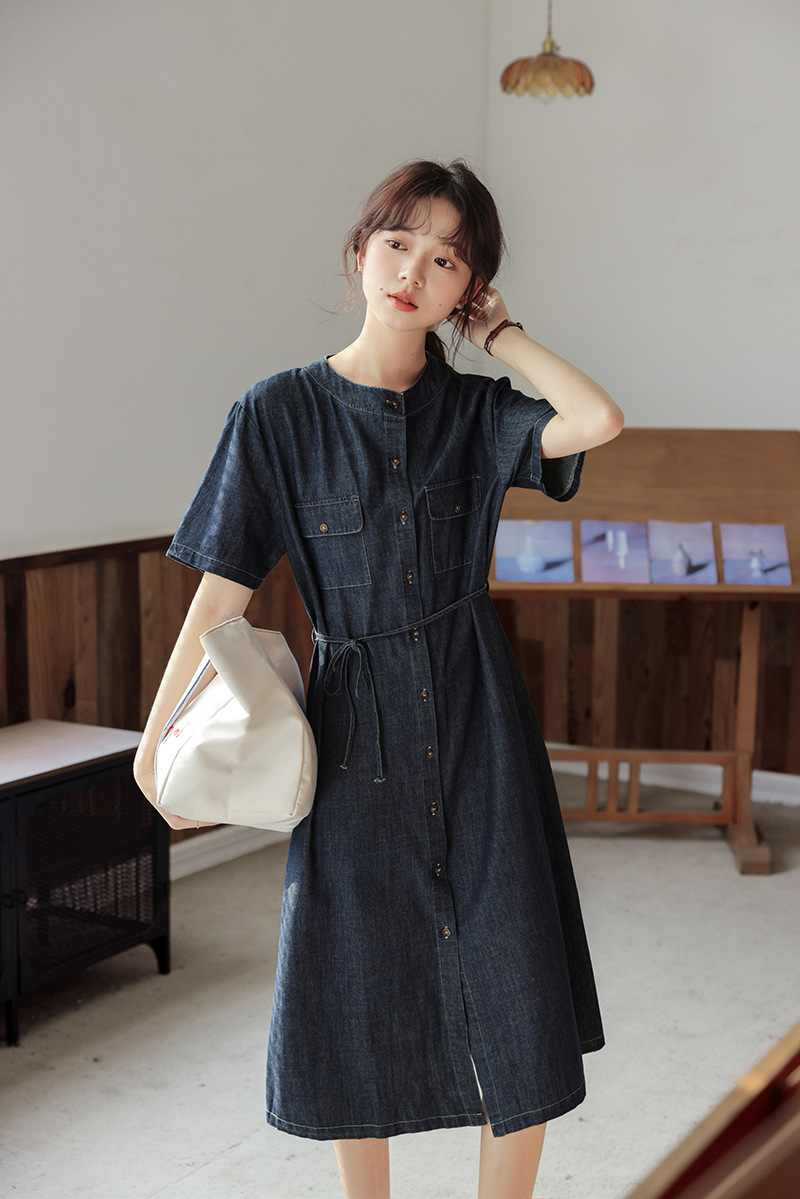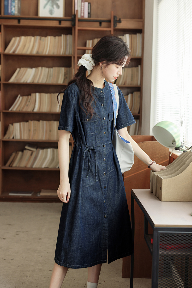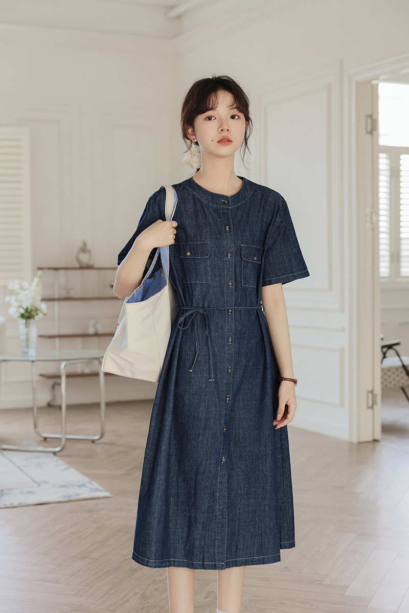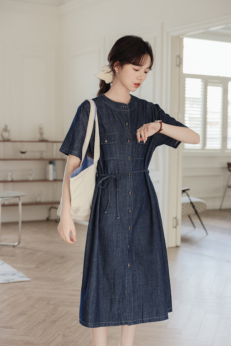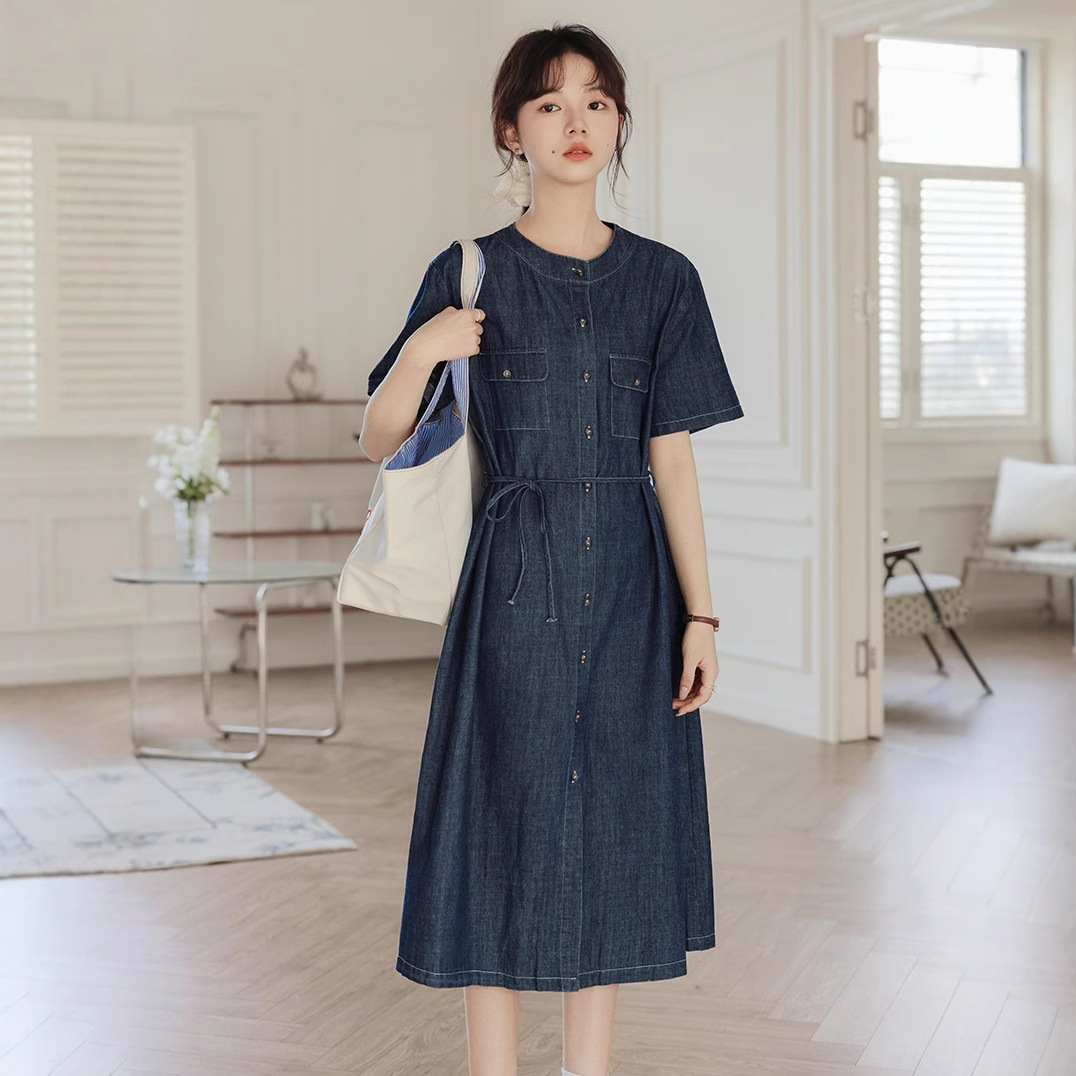 2025 년 여름 새로운 한국 패션 레트로 예술적 타이트 허리 슬리밍 우아한 데님 반팔 둥근 목 원피스 여성