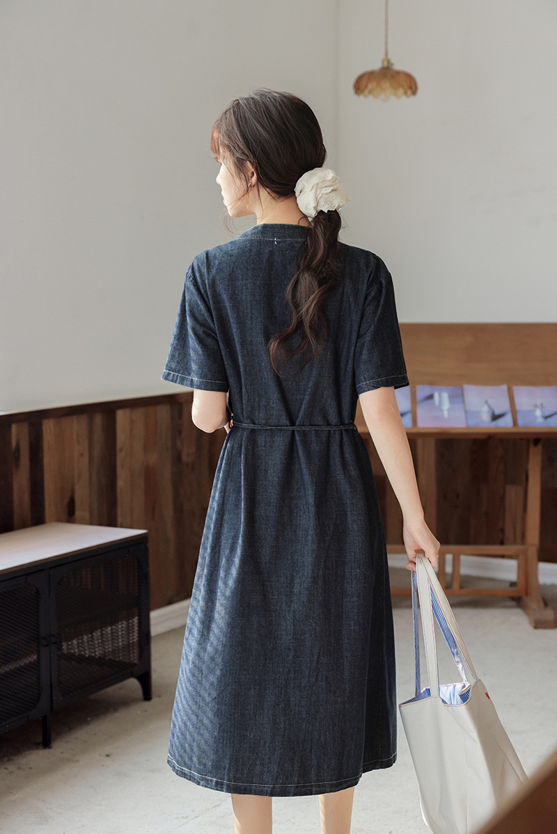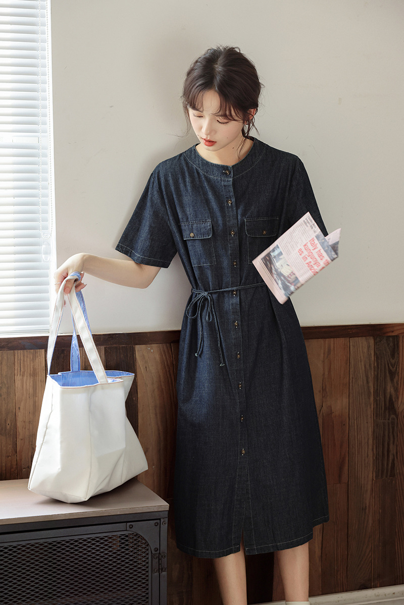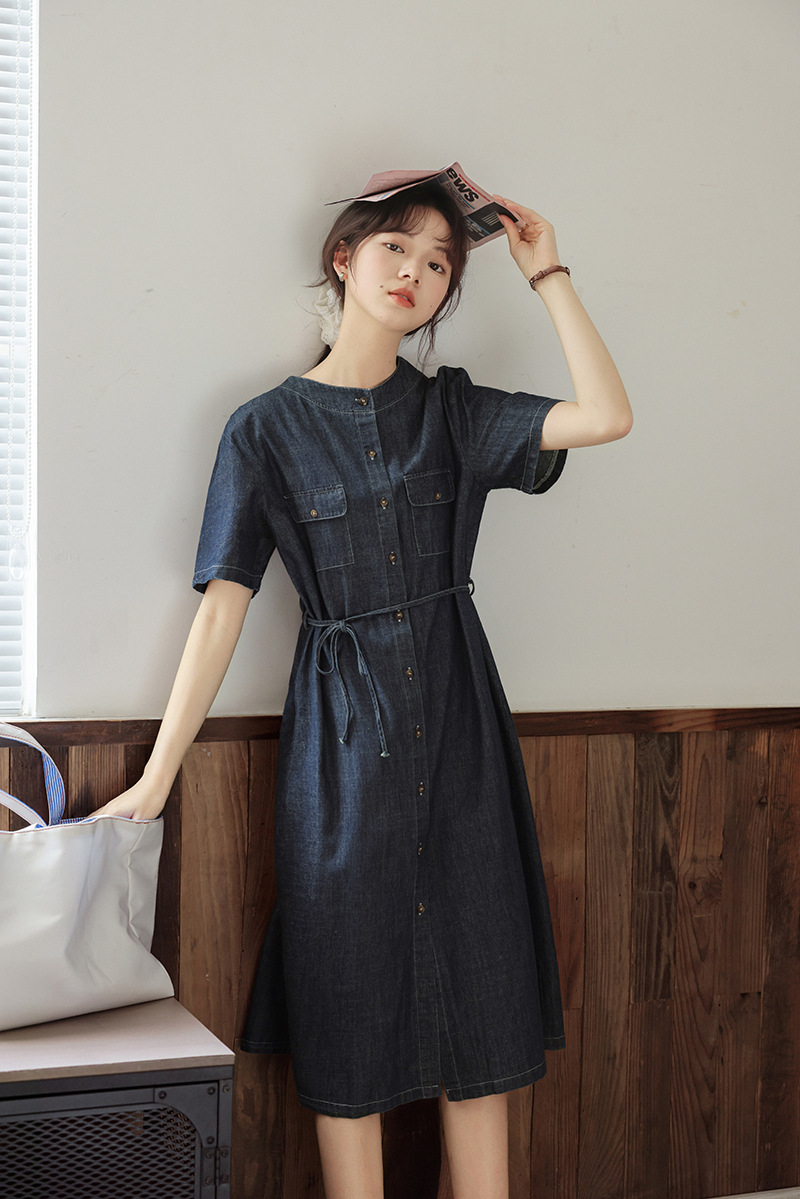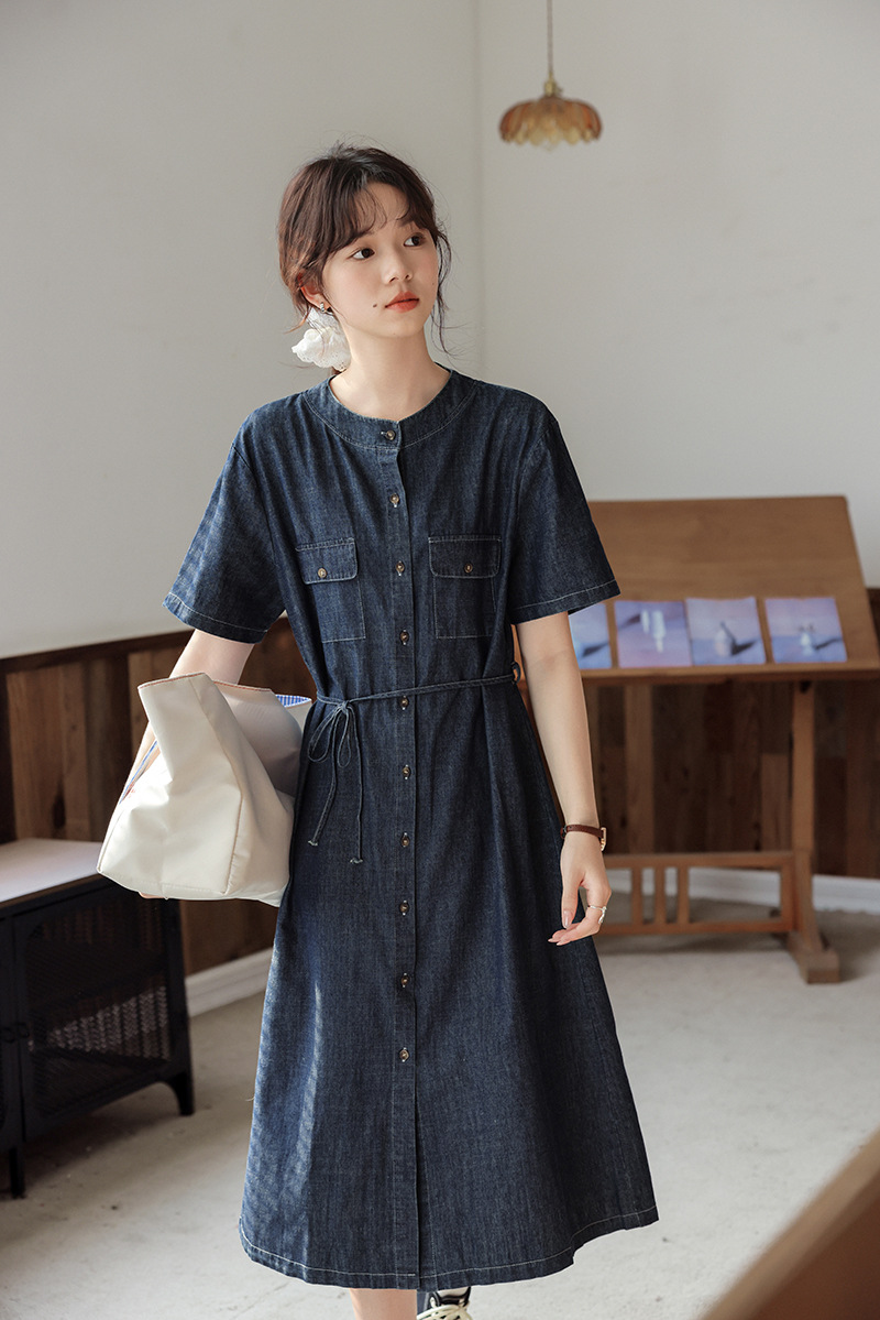 2025 년 여름 새로운 한국 패션 레트로 예술적 타이트 허리 슬리밍 우아한 데님 반팔 둥근 목 원피스 여성